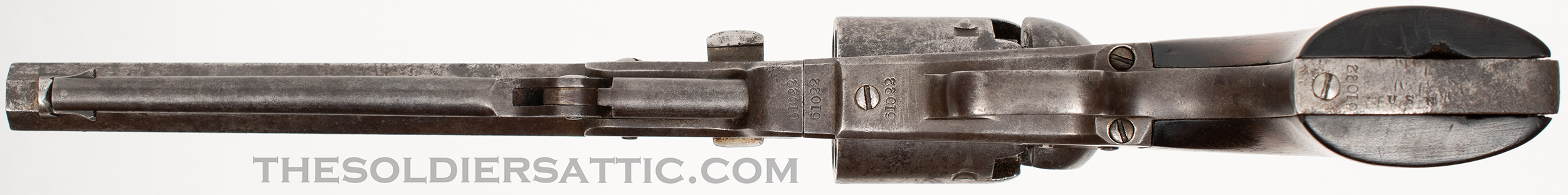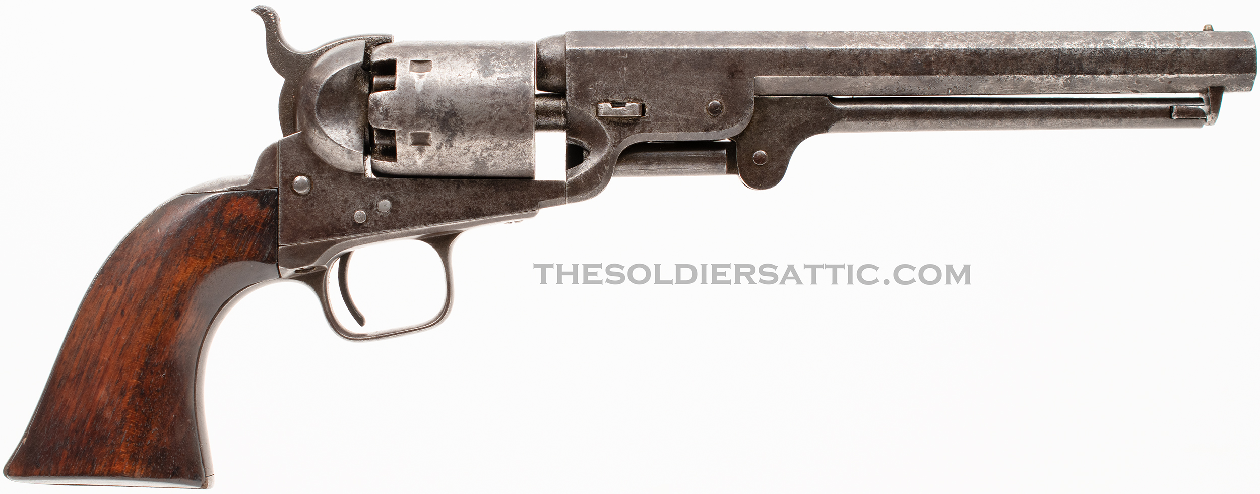 Colt Model 1851 Navy-Navy, Third Model, revolver manufactured in 1856 and chambered in .36 caliber. Features include a 7 ½ -inch octagon barrel, 6-round cylinder, walnut grips, and both the triggerguard and the back-strap are iron. This is a correct, matching serial number revolver purchased by the Navy; part of a group of revolvers known by collectors as Navy-Navies.