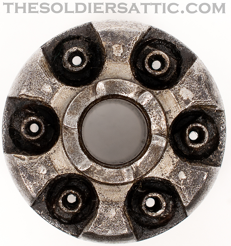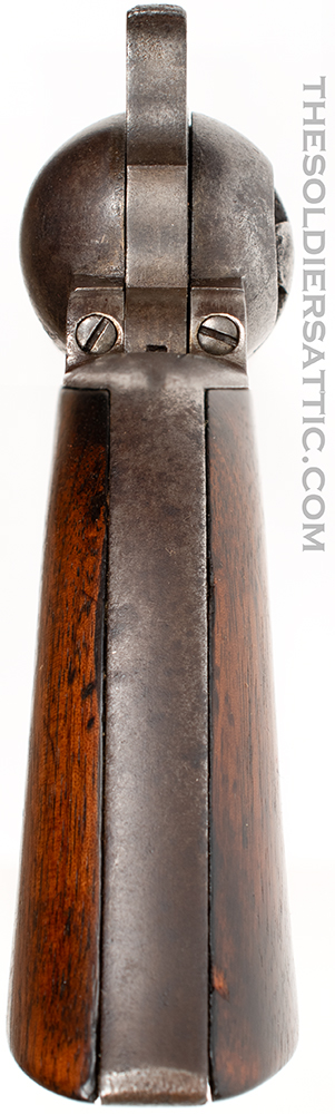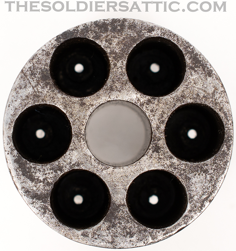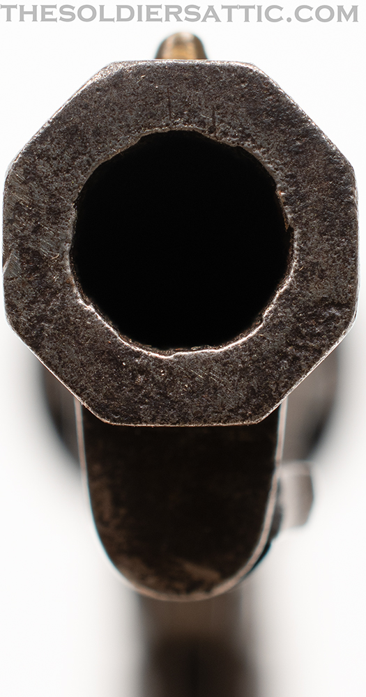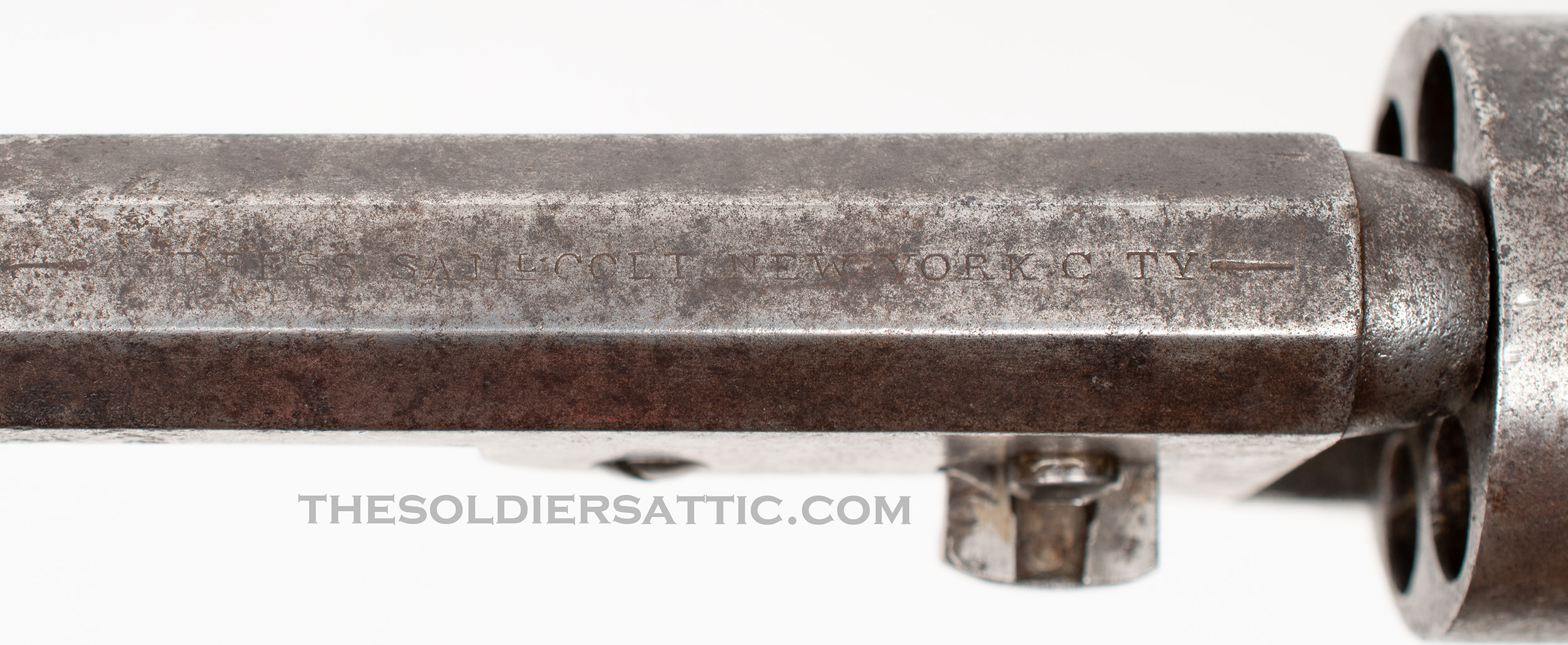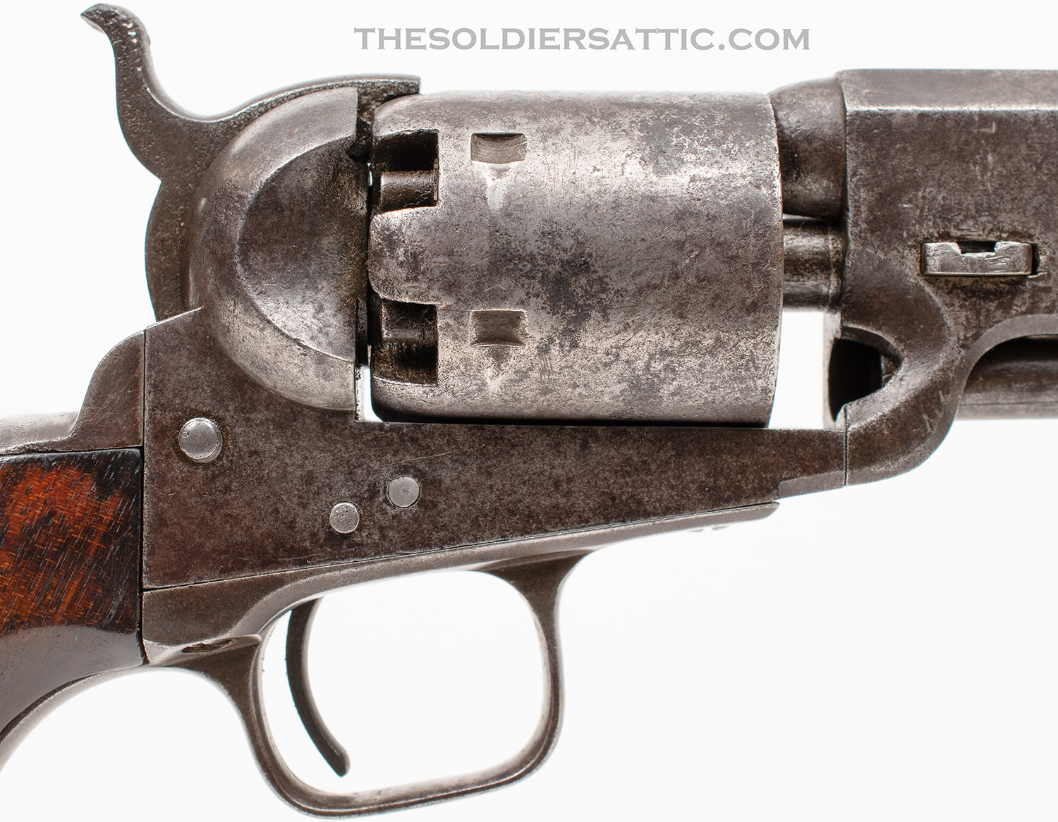 Overall condition is as expected for an early purchased Colt Model 1851 Navy that saw extended Naval service, including the Civil War. No finish remains on the metal surfaces. Areas of oxidation are present throughout, along with highpoint wear and areas of pitting. The walnut grips show some damage on the butt. The barrel address is visible and shows wear over the word ‘ADDRESS’ and the ‘I’ in ‘CITY’. Originally lightly stamped on these models, the Naval cylinder scene is worn but visible in areas; both the ‘COLTS PATENT No’ before the SN and ‘ENGAGED 16 MAY 1843’ marks are no longer legible. The SN on the cylinder (and other components) is visible. The bore is semi-bright with both dirt and pitting scattered throughout, the rifling is well-defined and deep. The action is strong with crisp clicks at half-and full cock, and the trigger pull is good.