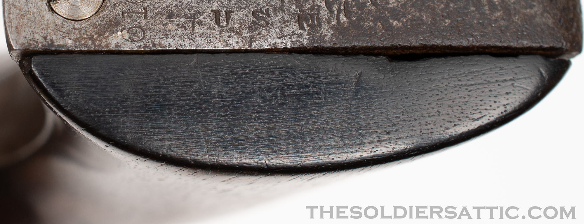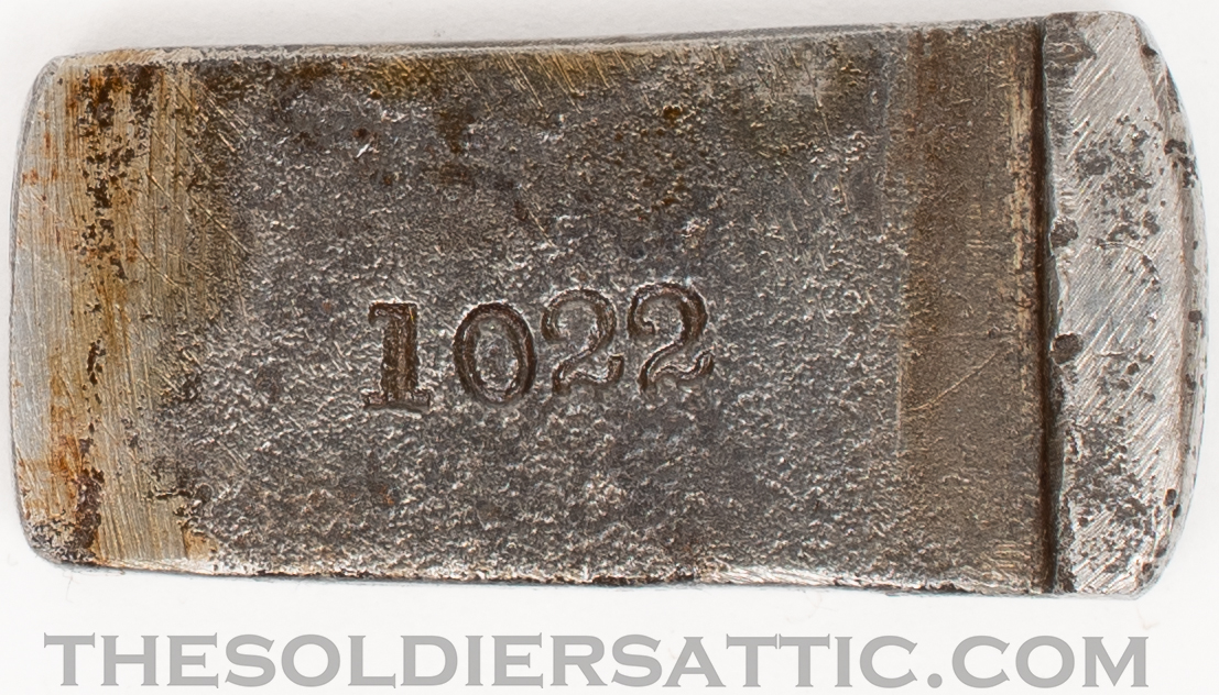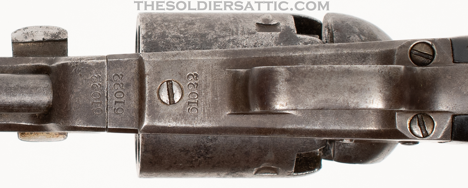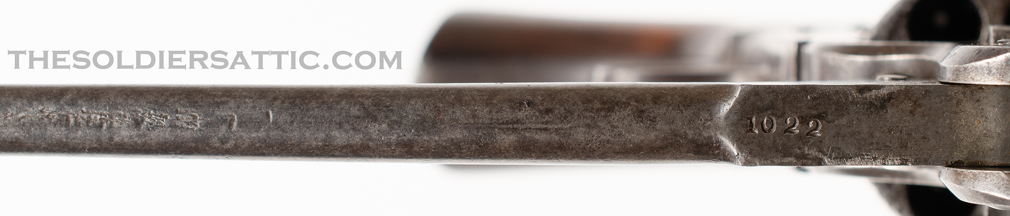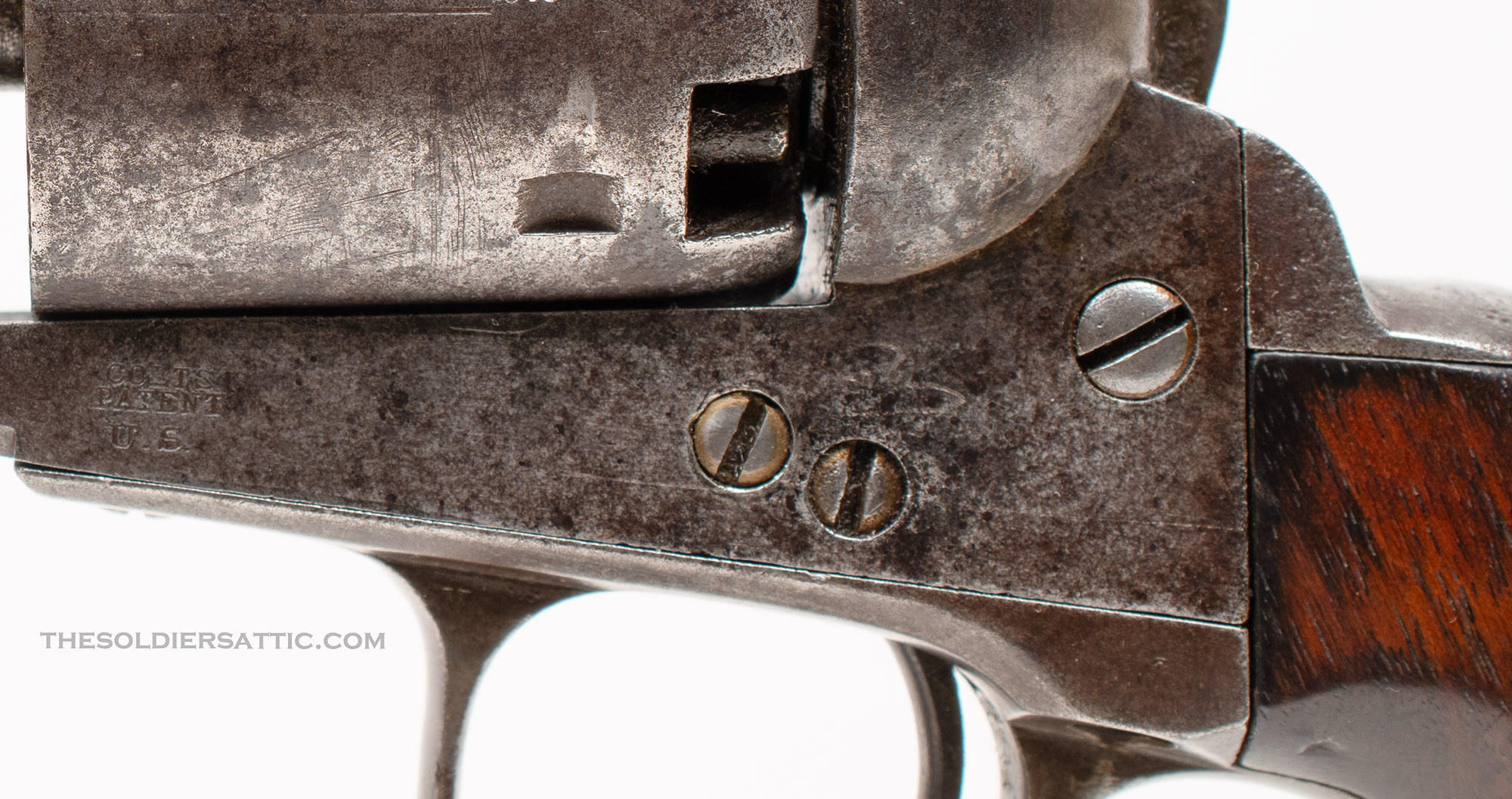 From 1856 through 1862, the U.S. Navy ordered several batches of 1851 (and 1861) Navy models from Colt. Collectors and researcher grouped these revolvers primarily based on order date as well as other characteristics. This Colt Model 1851 Navy revolver is part of Group I, purchased between 1856-1857. Revolvers within this group are considered Early Navy-Navies, fall within SN range 55500-62500 (Jordan and Geri), and are all Third Model 1851 Navy revolvers. Group I revolvers share common characteristics that distinguish them from other Army and non-military purchased arms. These characteristics include the early Colt New York City address marked on top of the barrel; a small ‘U.S.’ military mark on the left side of the frame, under ‘COLTS/PATENT’; and the lack the ‘.36 CAL’ marking on the triggerguard. Group I revolvers also all have backstraps and large triggerguards made of iron, unlike the Army and civilian variants which have brass variants of these parts. Both these iron parts were manufactured in Colt’s London factory and shipped to Hartford (Jordan and Geri). As a result, the triggerguard has a flatter bottom and the backstrap has a larger notch cut into the apron than later Hartford produced iron versions. Group I also has inspector’s marks that are unique from those of later groups.