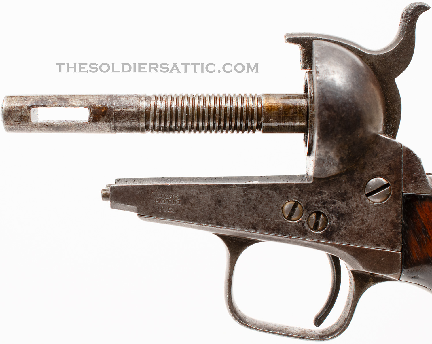 The Colt Model 1851 Navy for sale here is numbered within the SN range of Group I and among those sent to the Boston Naval Yard. Both the backstrap and triggerguard are the correct English iron variation, and the triggerguard correctly lacks the ’36 CAL’ marking. A small ‘U.S.’ military marking is located under the ‘COLTS/PATENT’ stamp on the left side of the frame. The early ‘–ADDRESS SAML. COLT NEW YORK CITY–‘ barrel address is stamped on top of the barrel. The cylinder Naval scene does not include the ‘Engraved by W.I. Ormsby. New York’, which is correct for the SN range. Ransom’s inspection mark, a small ‘U S N’, is stamped into the strap on the butt, just behind the SN. Ransom’s initials, ‘G M R’, are marked on the grip wood just below the ‘U S N’ and are very light. The SN on the cylinder, triggerguard, frame, barrel lug, buttstrap, loading lever, and wedge all match. No SN is visible on the grips.