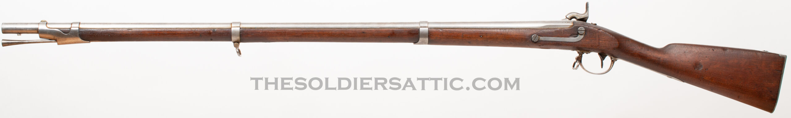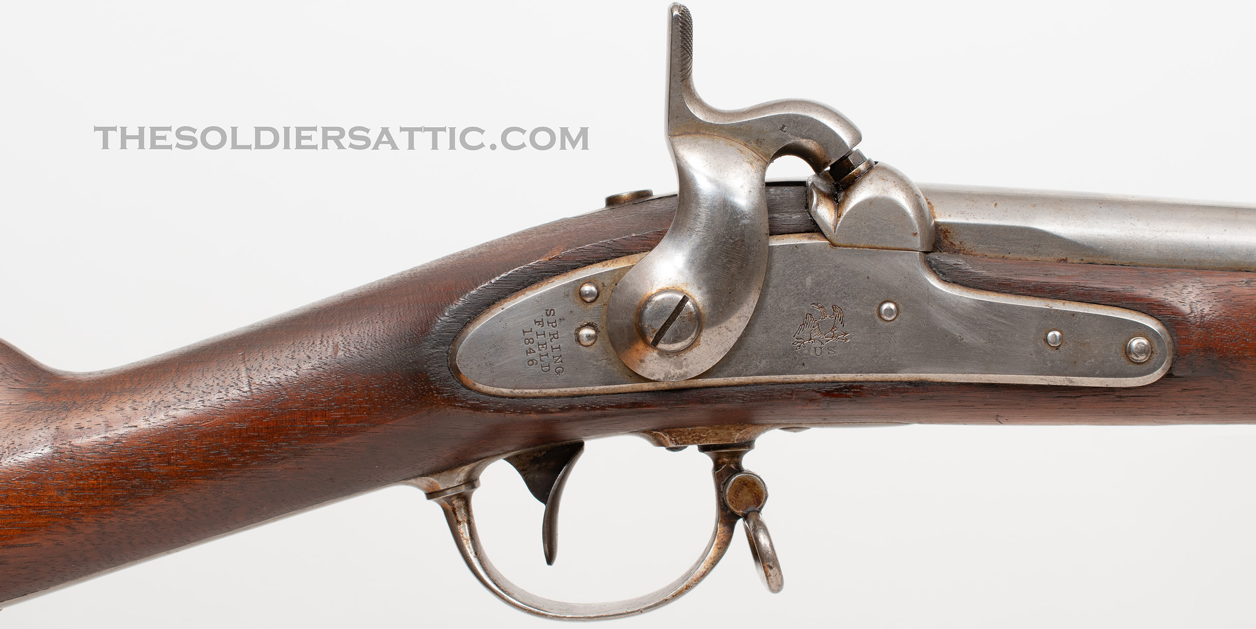 A Model 1842 musket manufactured by Springfield in 1846, the first year of the Mexican-American War. Features are standard for the model and include a 42-inch round barrel held in place with three barrel bands, iron mountings, steel ramrod with trumpet shaped head, bayonet lug mounted under the barrel, and walnut stock with comb.