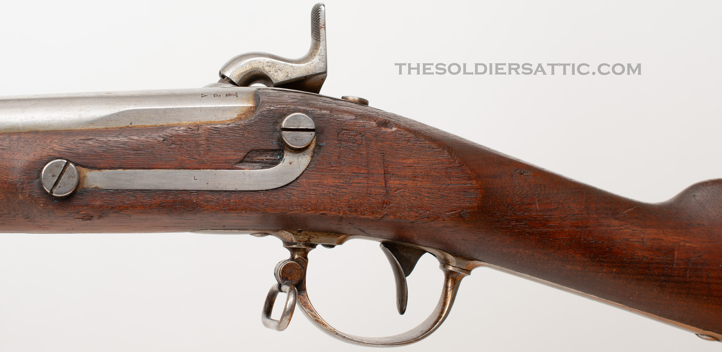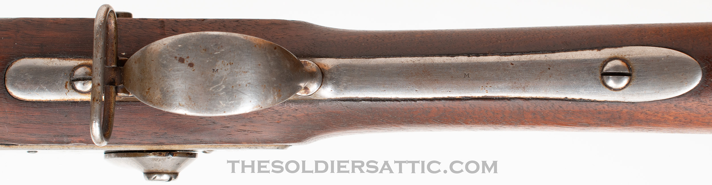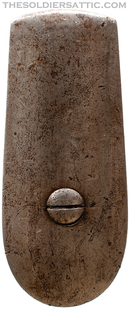 Markings on this Model 1842 musket include the ‘V/P’ over eagle head proof mark on the left side of the breech. Forward of the hammer, on the lockplate, is the American eagle motif over ‘US’. The lock is vertically marked ‘SPRING/FIELD/1846’ behind the hammer. ‘1846’ is stamped on the tang, matching the date on the lockplate. On the left side of the stock, behind the side plate, is an oval cartouche stamp with a script ‘RC’, the inspector’s mark of Rufus Chandler. ‘US’ is stamped on the buttplate tang, forward of the screw and an ‘L’ sub-inspector’s stamp is found on the side plate.
