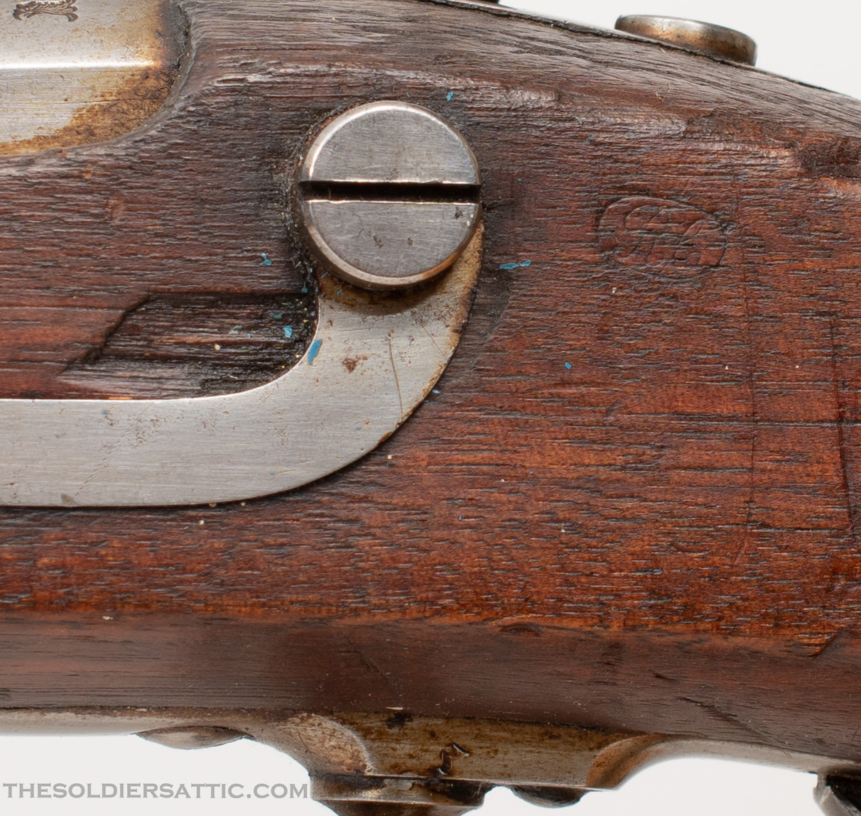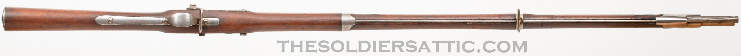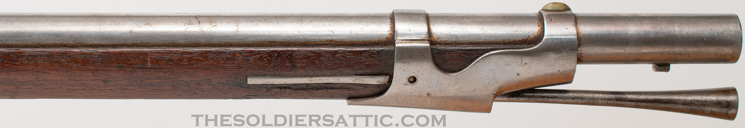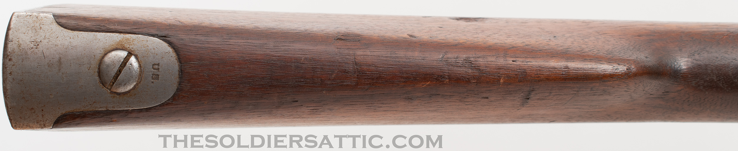 The metal surfaces are bright with some service marks scattered throughout. Hardened grease remains in corners and difficult to reach spaces that removes easily. All markings are strong with crisp edges. Service marks are found throughout the walnut stock with a chip at the rear of the side plate and gouge on the left side of the butt. Chandler’s inspection cartouche is clearly visible. The smoothbore is clean and mirror bright with no signs of oxidation. Overall, this is a great wartime Model 1842 musket.