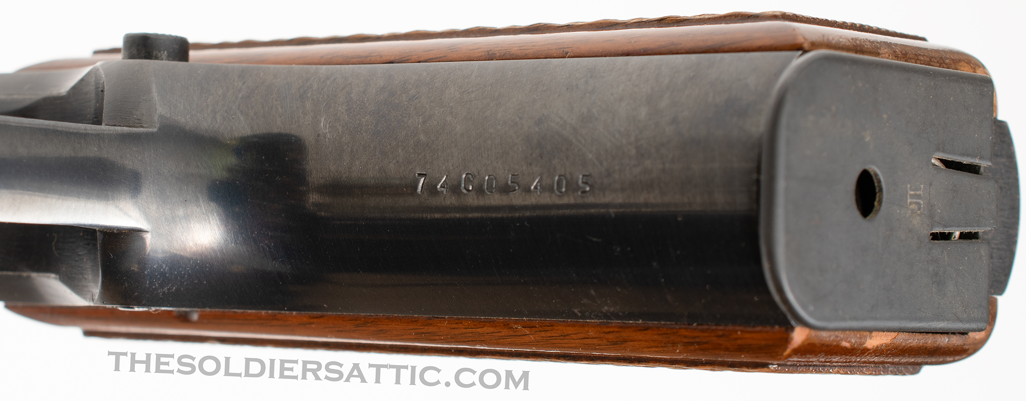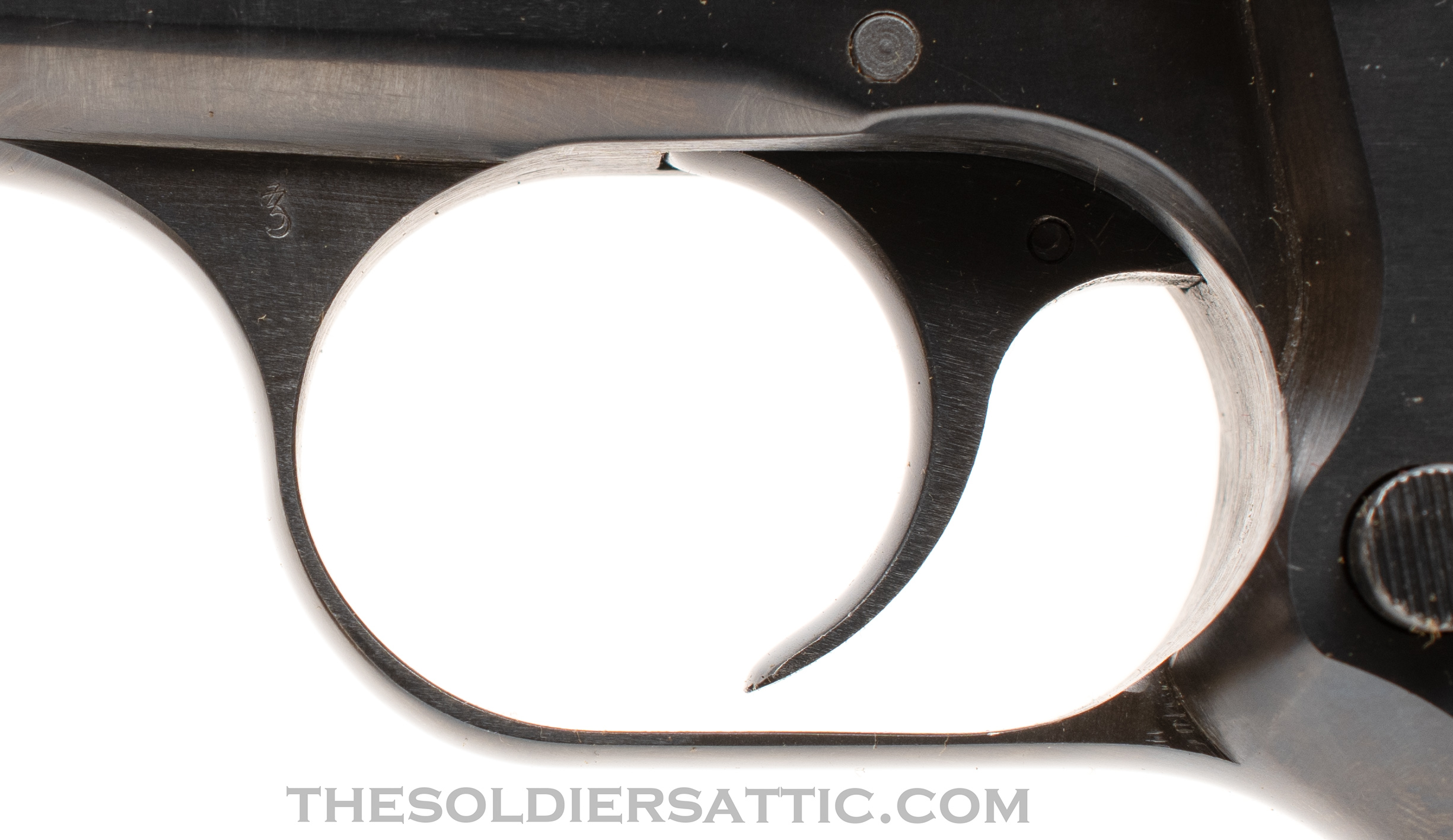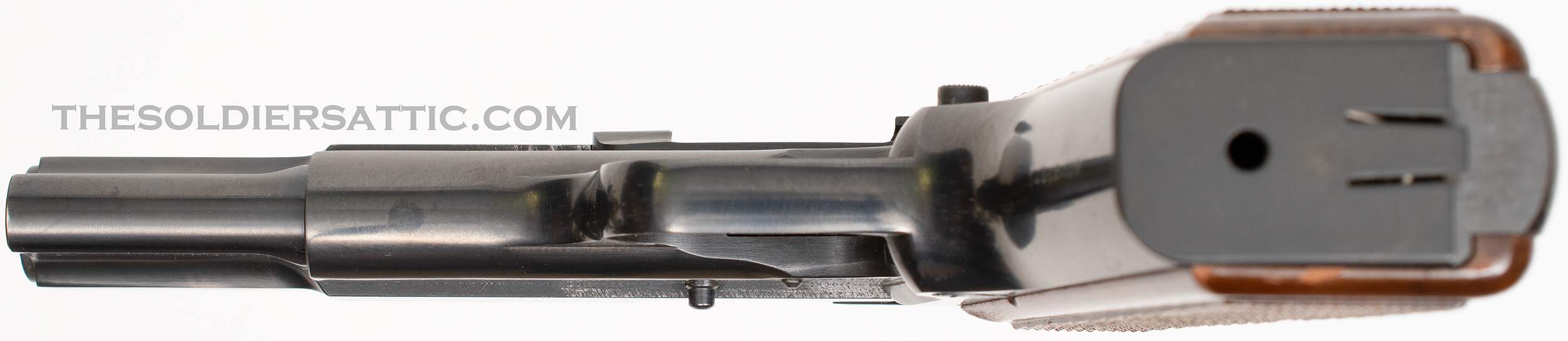 Browning Hi-Power Sport C series pistol, semi-auto, single-action, chambered in 9mm Parabellum and manufactured in Belgium in 1974 by Fabrique Nationale (FN). Introduced in 1971 as Browning entered the shooting sports market, the Browning Hi-Power Sport features a high, square front sight, Type A adjustable rear sight (aka “Beer Can” sight). Other features, such as the polished blue finish, walnut grips, external extractor, 118mm barrel, spur hammer, and 13-round capacity magazine are standard for period commercial Hi-Powers. At the time, the first two numerals of Browning serial numbers indicated the date of manufacture. These two numbers were followed by a letter code denoting model (e.g. C= Hi-Power, U= Challenger, N= .380 auto pistol), thus Hi-Powers produced ca. 1969-75 are known as C Series pistols by collectors. The Browning Hi-Power Sport represents only a fraction of all C Series Hi-Powers and combined with a relatively short production window (1971-1975), are not common.