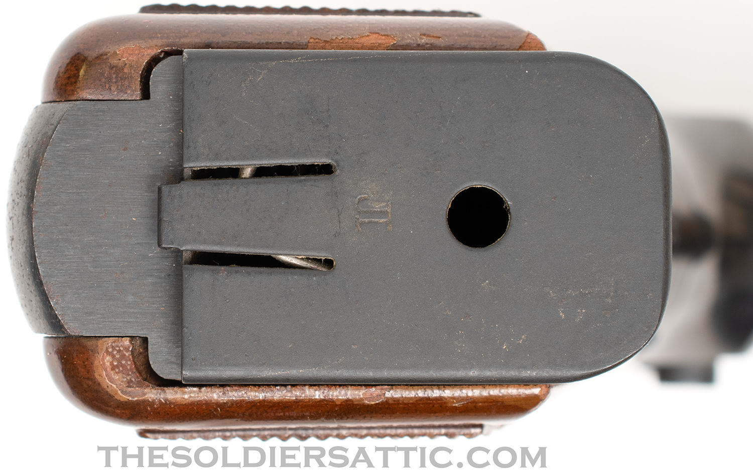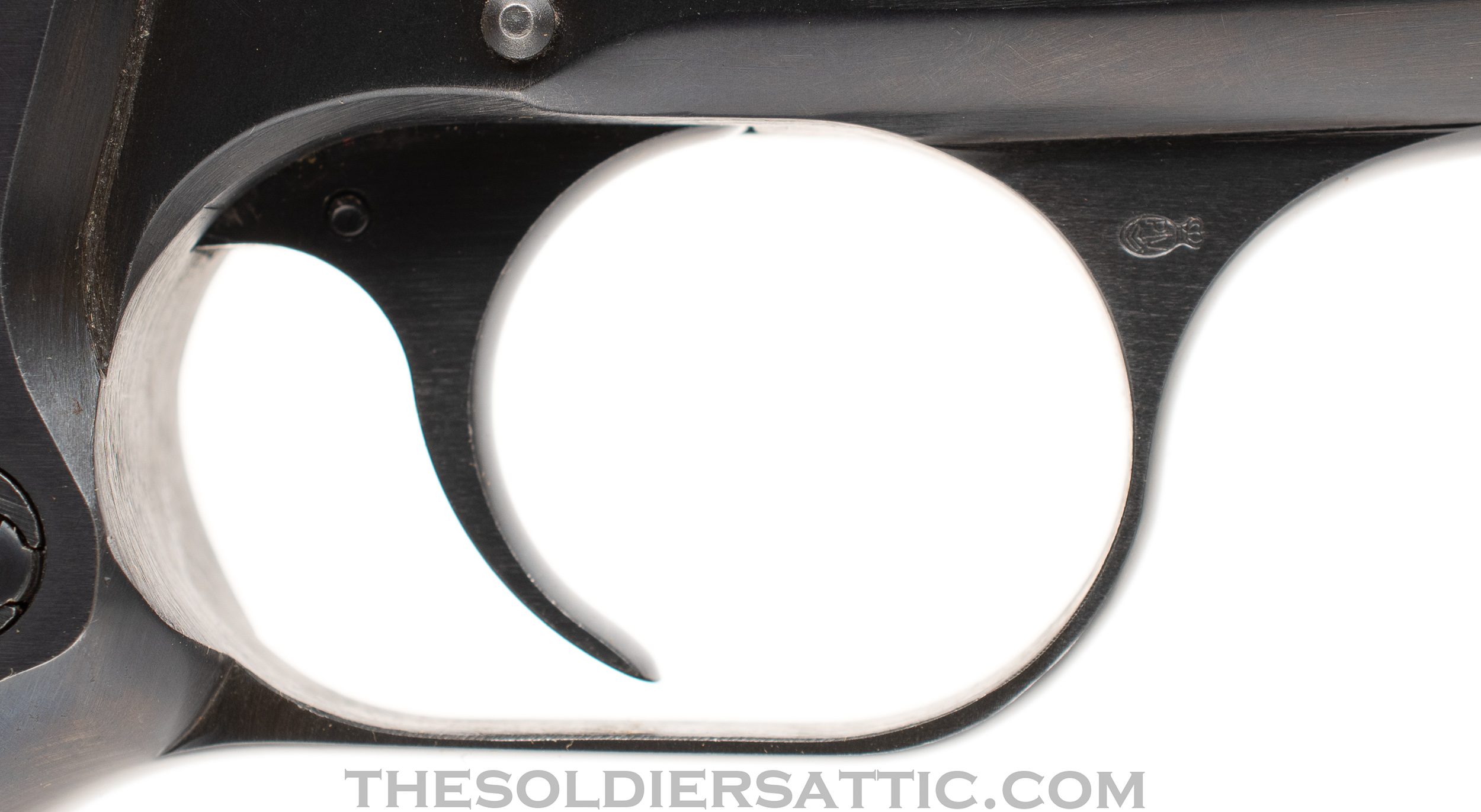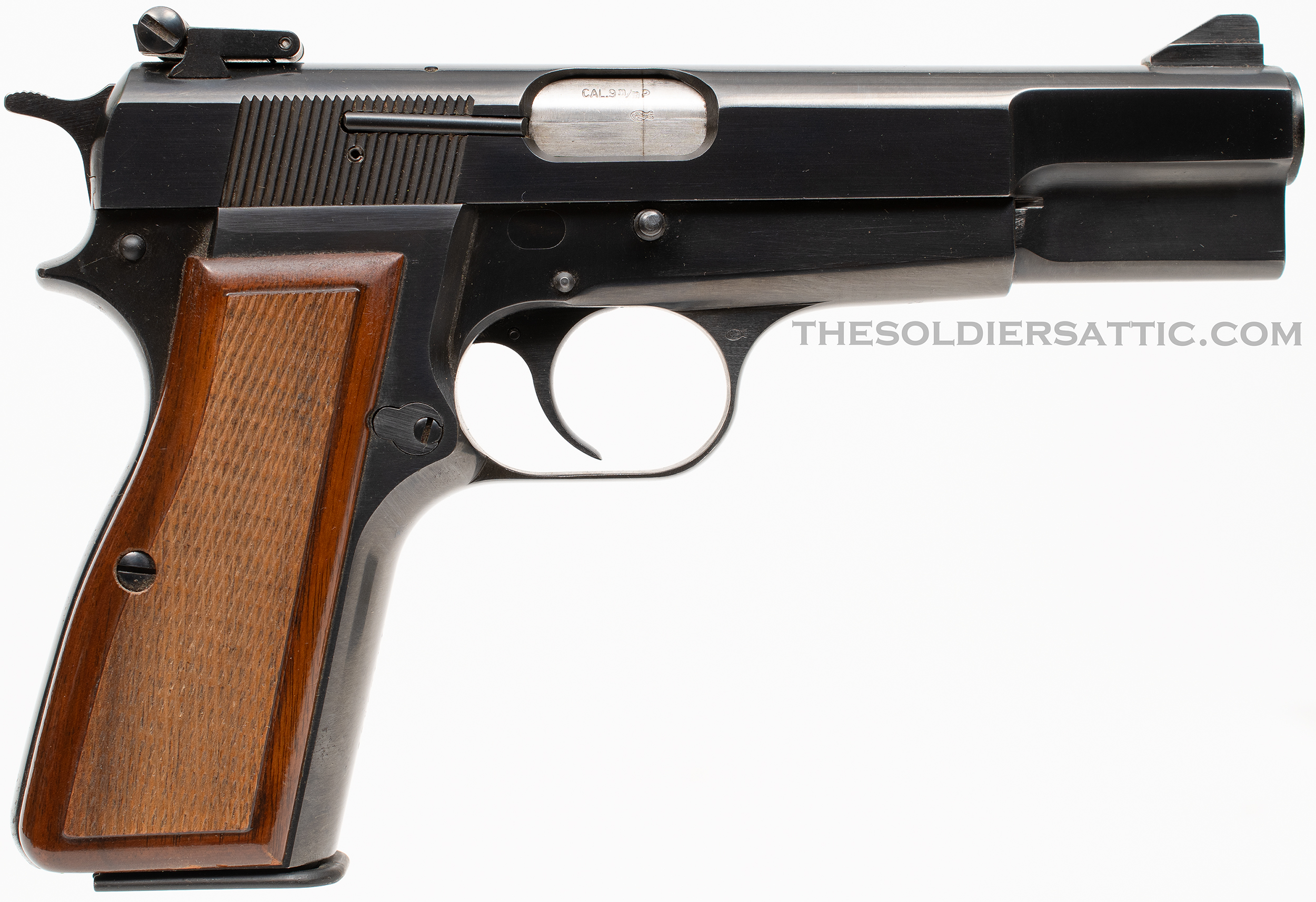 Browning Hi-Power Sport C series pistol, semi-auto, single-action, chambered in 9mm Parabellum and manufactured in Belgium in 1974 by Fabrique Nationale (FN). Introduced in 1971 as Browning entered the shooting sports market, the Browning Hi-Power Sport features a high, square front sight, Type A adjustable rear sight (aka “Beer Can” sight). Other features, such as the polished blue finish, walnut grips, external extractor, 118mm barrel, spur hammer, and 13-round capacity magazine are standard for period commercial Hi-Powers. At the time, the first two numerals of Browning serial numbers indicated the date of manufacture. These two numbers were followed by a letter code denoting model (e.g. C= Hi-Power, U= Challenger, N= .380 auto pistol), thus Hi-Powers produced ca. 1969-75 are known as C Series pistols by collectors. The Browning Hi-Power Sport represents only a fraction of all C Series Hi-Powers and combined with a relatively short production window (1971-1975), are not common.