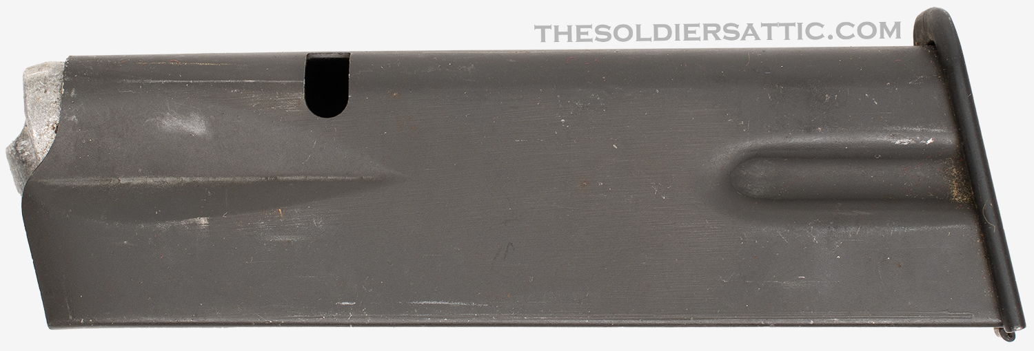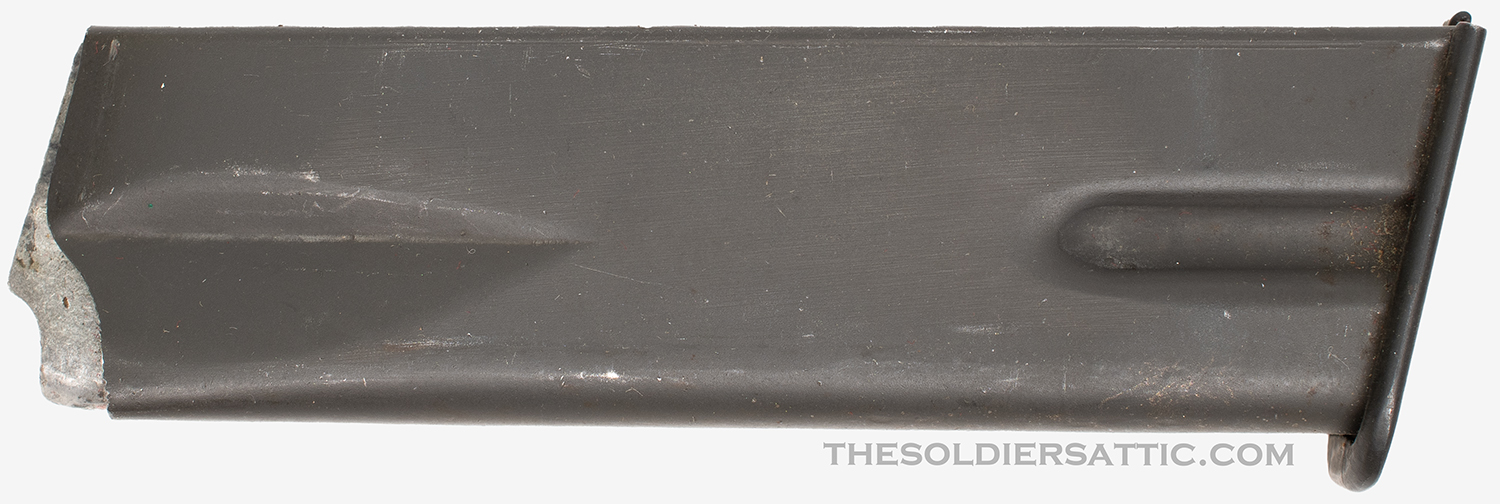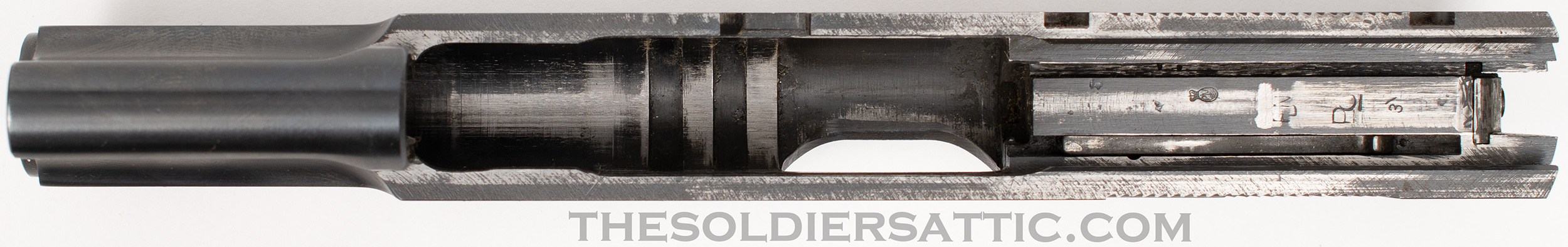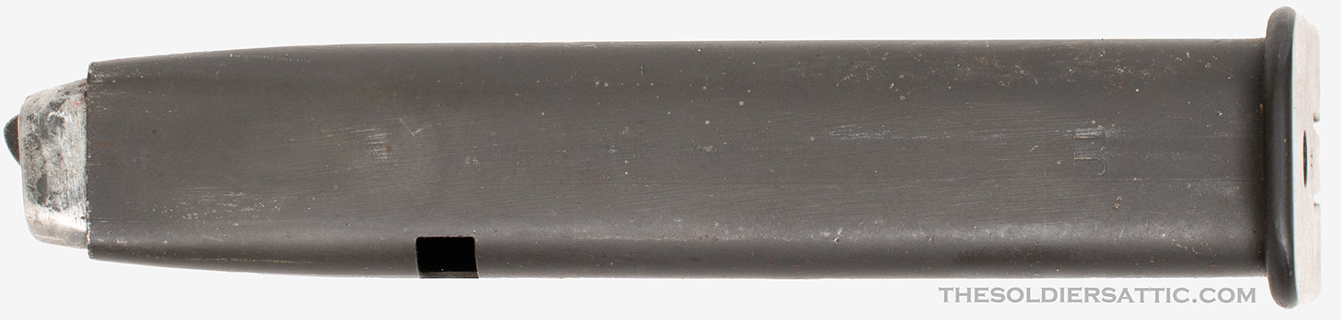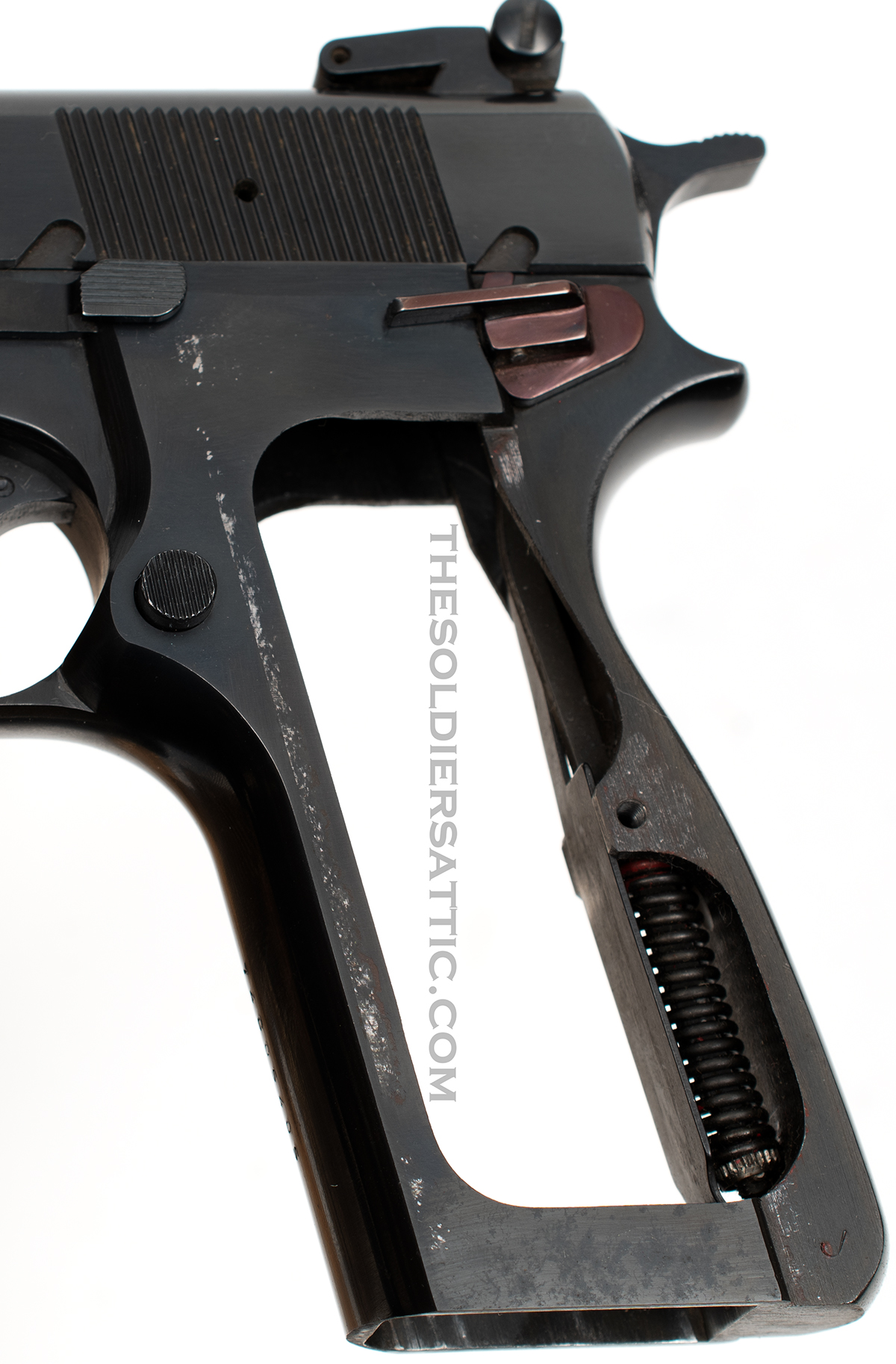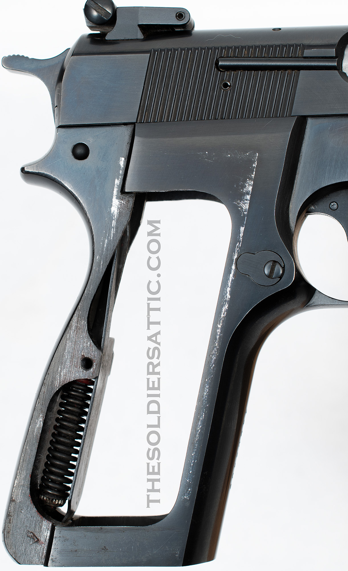 Markings include ‘BROWNING ARMS COMPANY MORGAN UTAH & MONTREAL P.Q./MADE IN BELGIUM’ on the left side of the slide. A double stamp number ‘3’ is visible on the front left of the trigger guard and the serial number is stamped on the front grip strap. A proof mark with a crown atop an oval containing the letters ‘PN’ is found on the front right side of the trigger guard and on the barrel. The barrel is also marked ‘CAL. 9m/m P’ above the chamber, ‘L’ on the right side of the lug, and ‘/3’ on the lug, left side. Under the slide, behind the chamber, are the following markings listed as seen front to rear, a proof mark with a crown atop an oval containing the letters ‘PN’ followed by ‘PN’, followed by ‘P’ and a partial O, and finally ‘/3’. The left of the grip frame is stamped with the letter ‘J’ on the bottom rear corner, under the grip, and the right side, same corner, is marked ‘<’. The underside of the wooden grips are each marked with a chalk white ‘63’, ‘FN’ oval logo cartouche, stamped ‘2’, and what appears to be an ‘M’ and unledgible numbers, perhaps ending in ‘2’, in black marker. The magazine is marked ‘JL’ on the bottom.