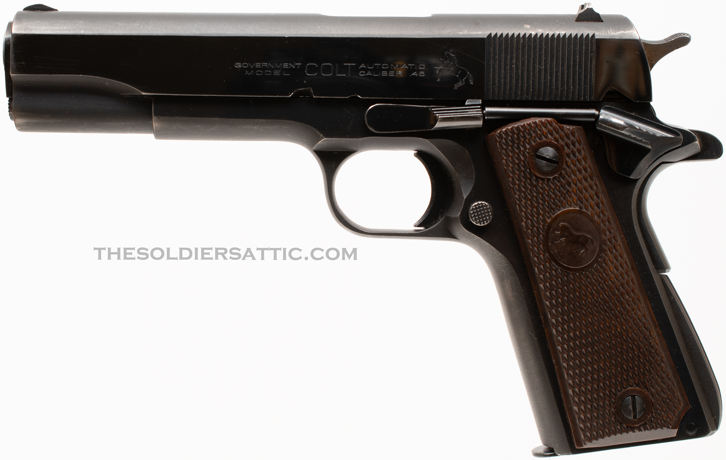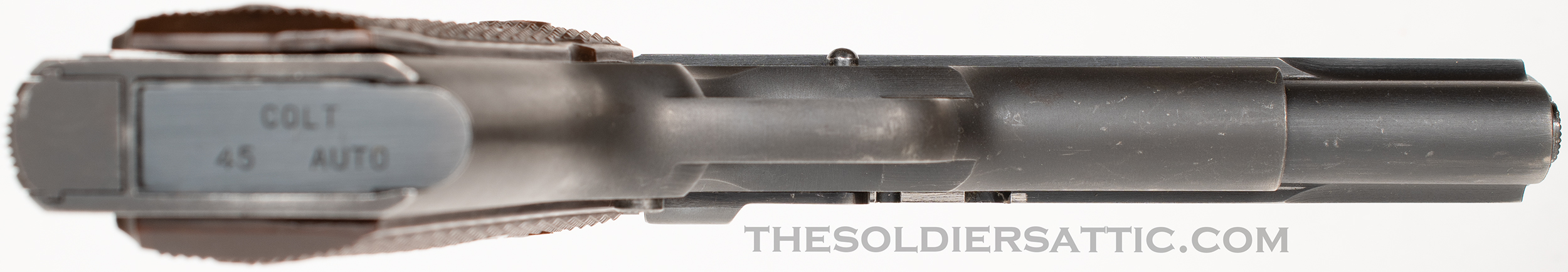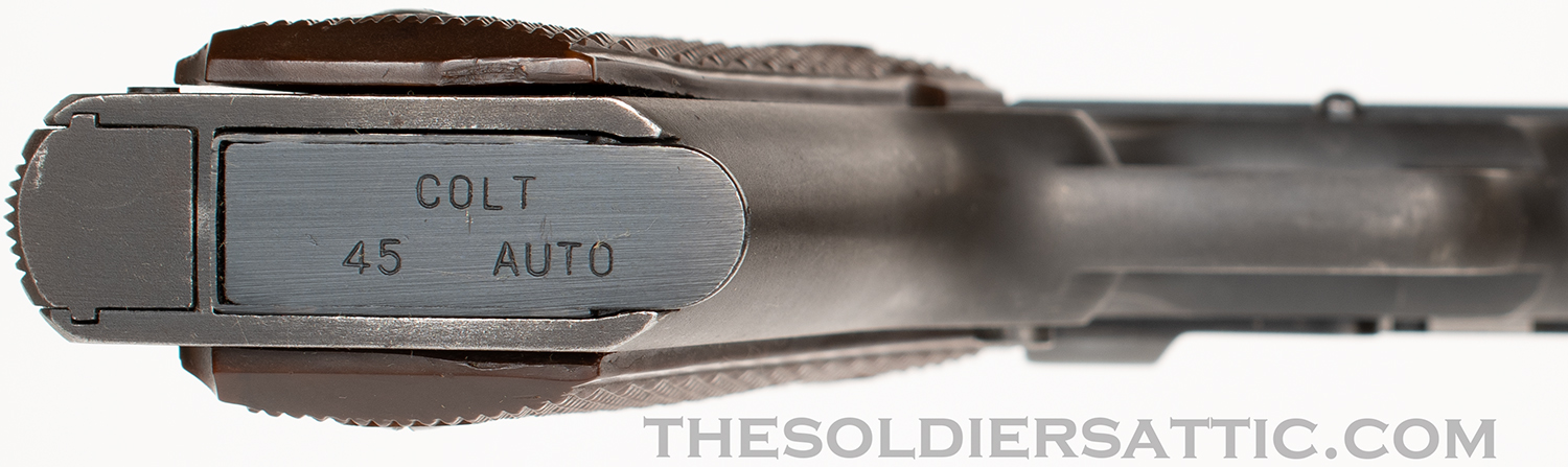 The Colt 1911 Government Model seen here is correct for 1950 manufacture with “C” suffix serial number; newly adopted slide and barrel markings; unfinished hammer sides; and long, grooved thumbpiece safety. The finish is high polish blued with the top of the slide, bottom, and rear frame surfaces are all matte finish. The 5-inch barrel is blued with unmarked lugs and the grips are brown “Coltwood” plastic with rampant colt. The magazine is blued.
