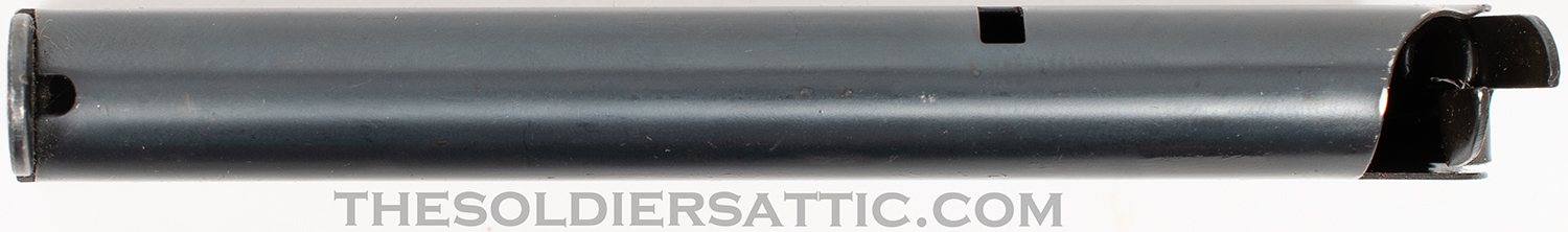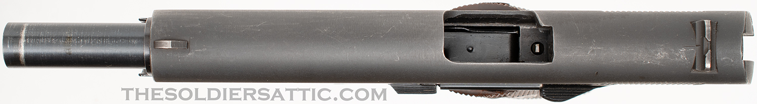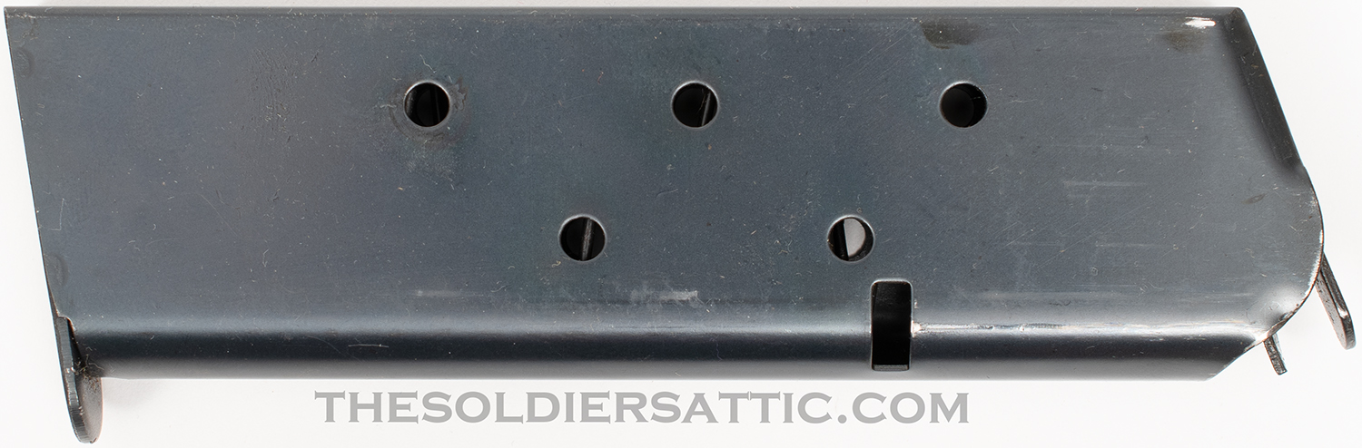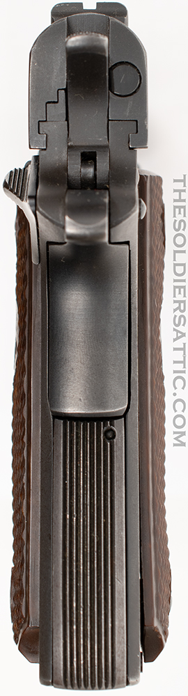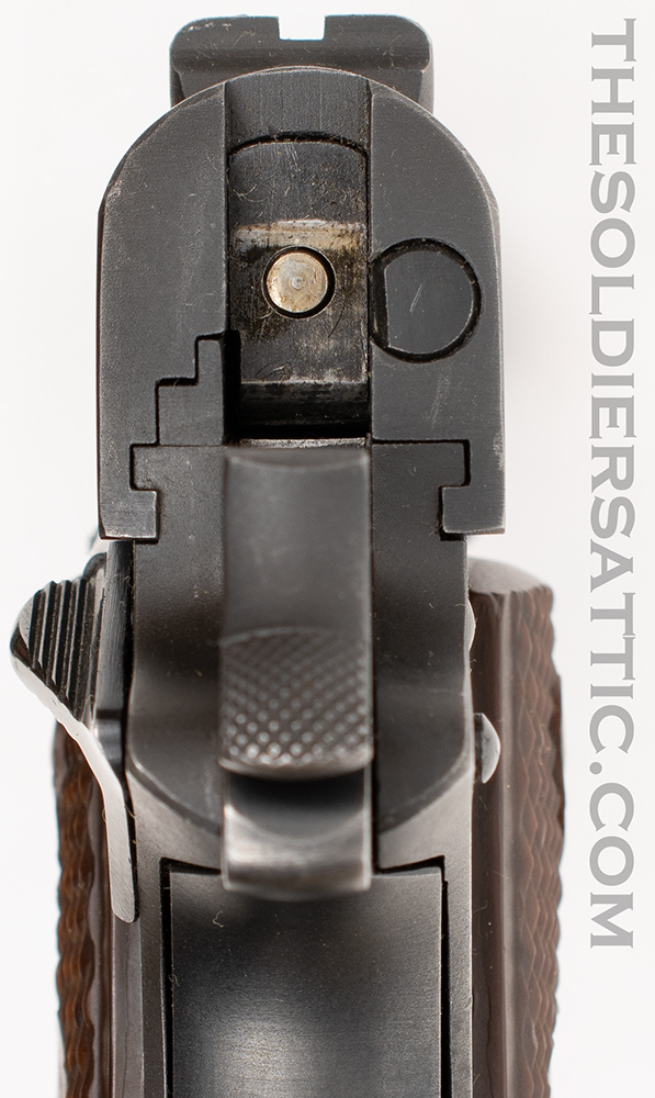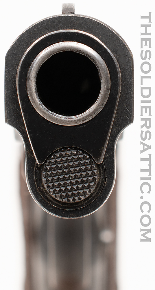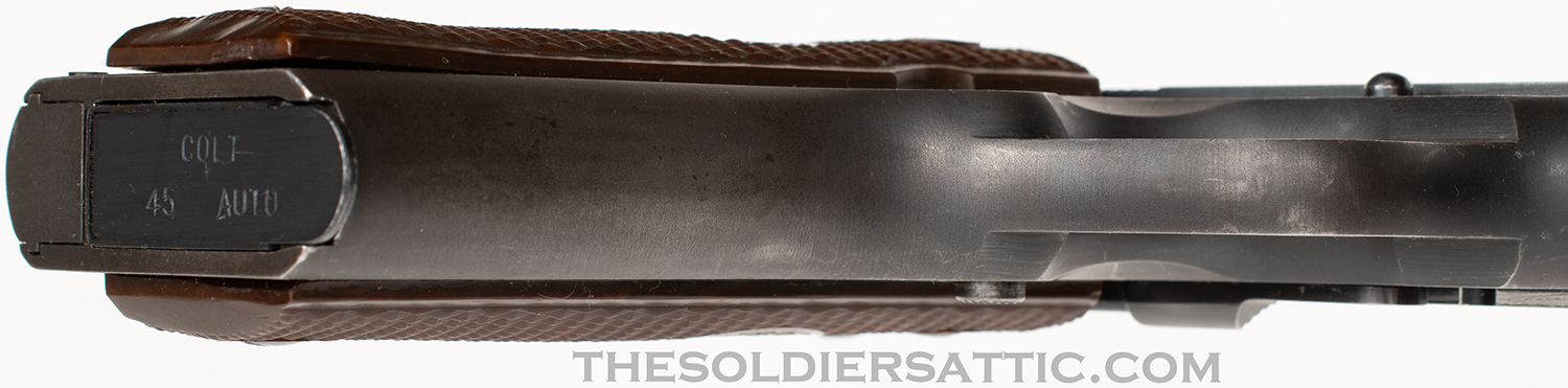 The Colt 1911 Government Model seen here is correct for 1950 manufacture with “C” suffix serial number; newly adopted slide and barrel markings; unfinished hammer sides; and long, grooved thumbpiece safety. The finish is high polish blued with the top of the slide, bottom, and rear frame surfaces are all matte finish. The 5-inch barrel is blued with unmarked lugs and the grips are brown “Coltwood” plastic with rampant colt. The magazine is blued.