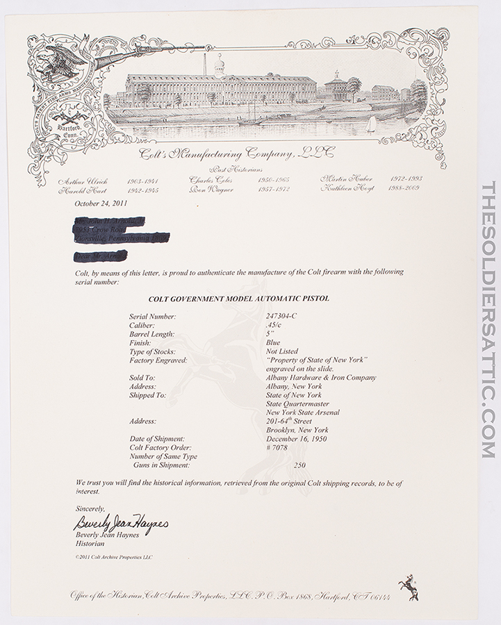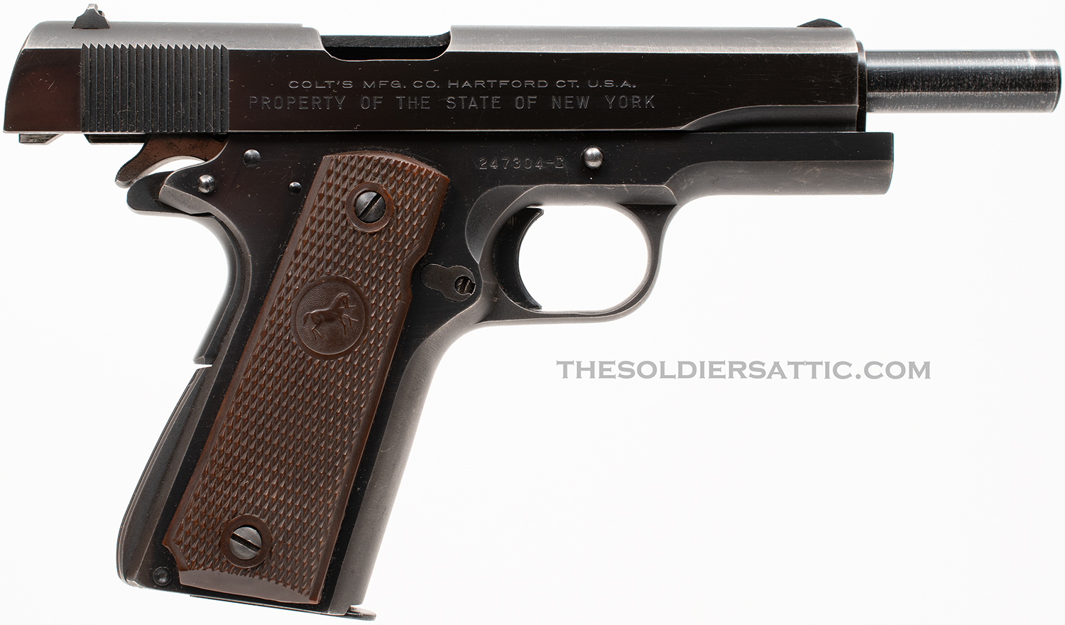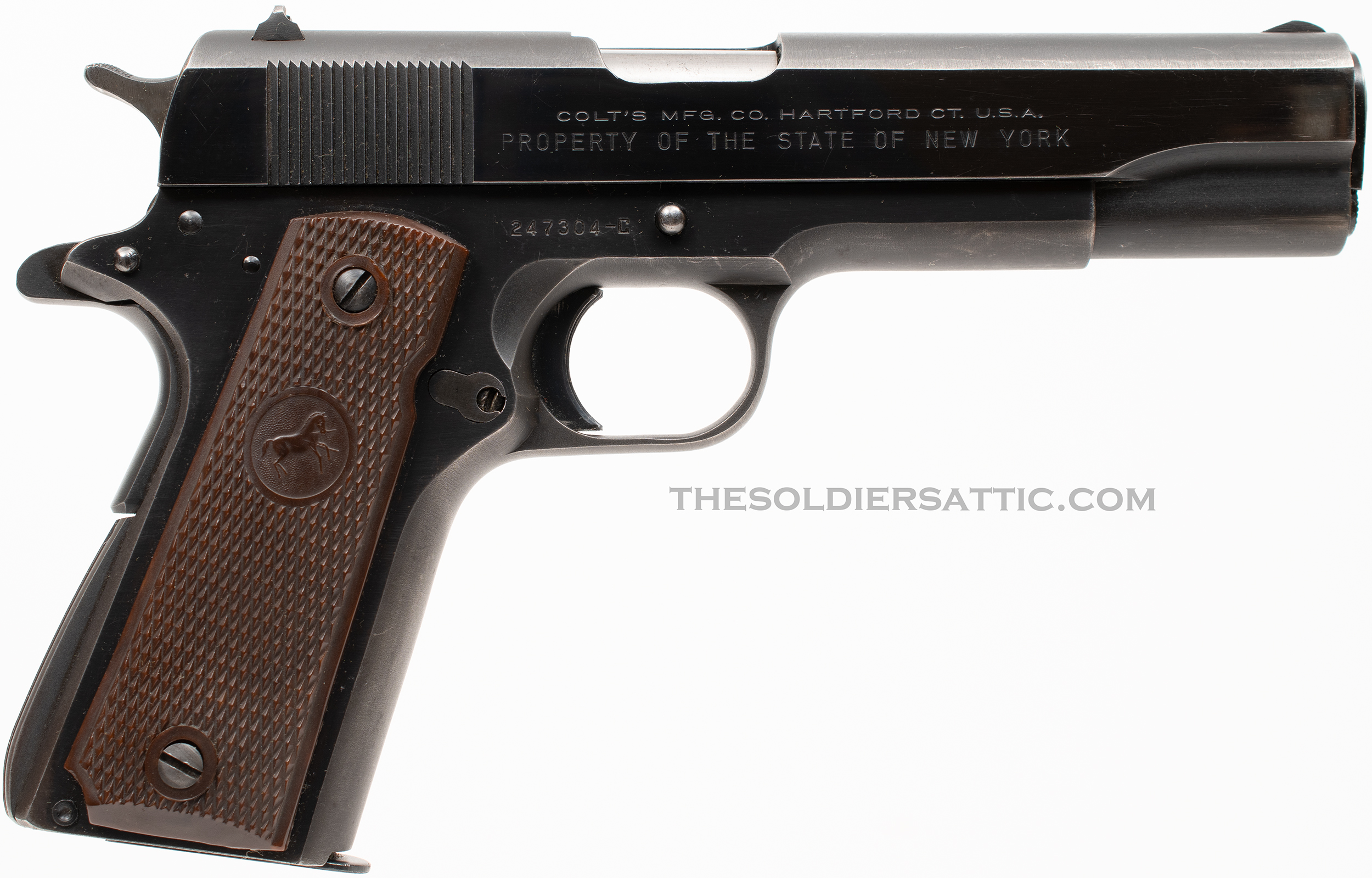 This is a scarce New York property marked Colt Government Model issued to the NY National Guard in very good condition. Includes Colt factory letter. A perfect addition to a Colt collection or for a collector of New York State firearms.