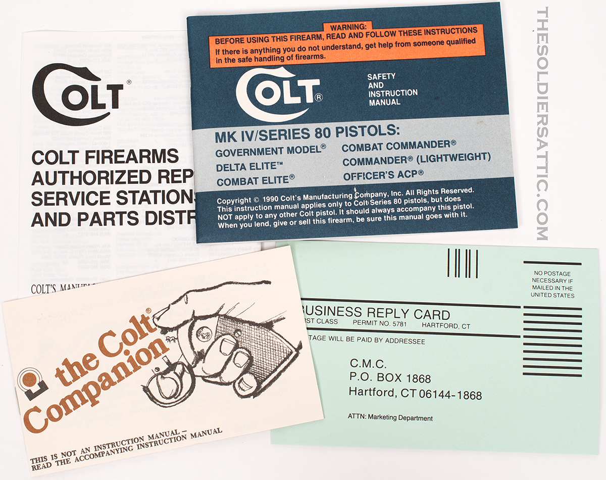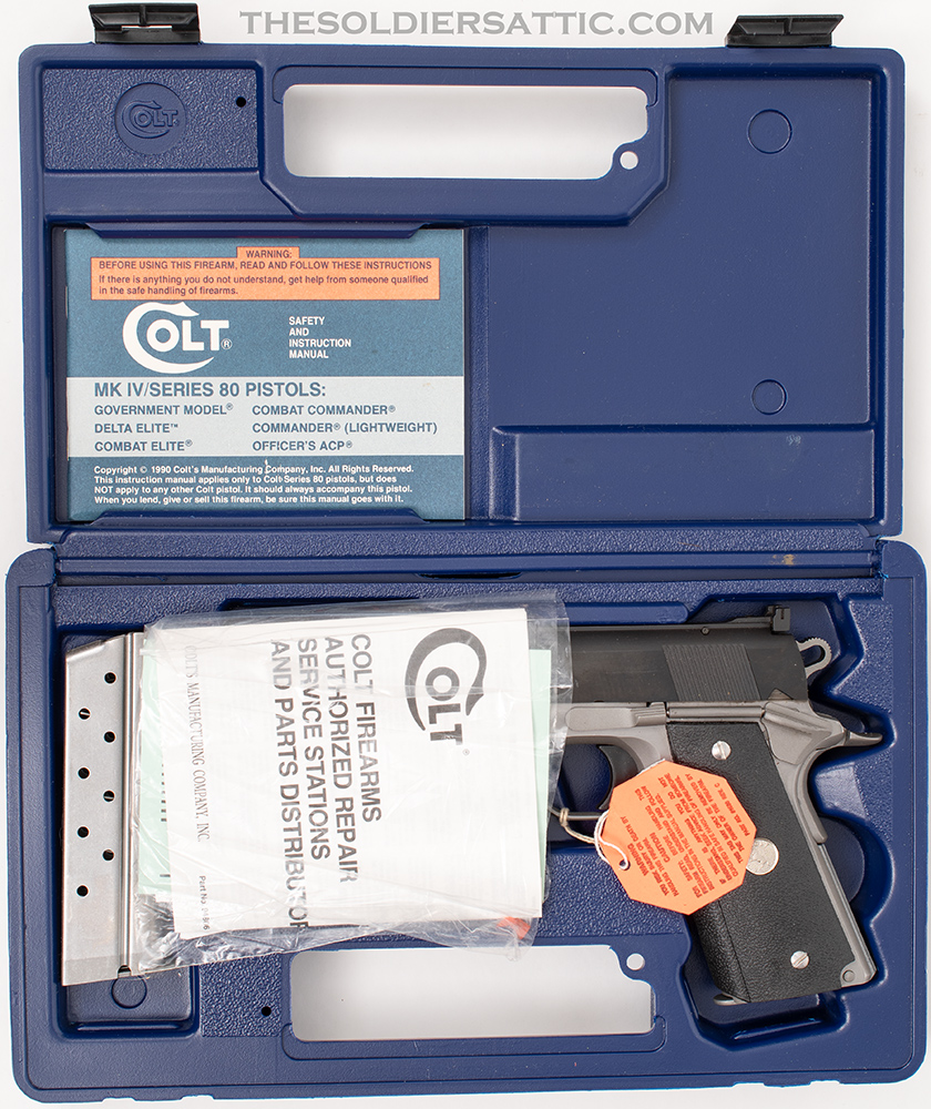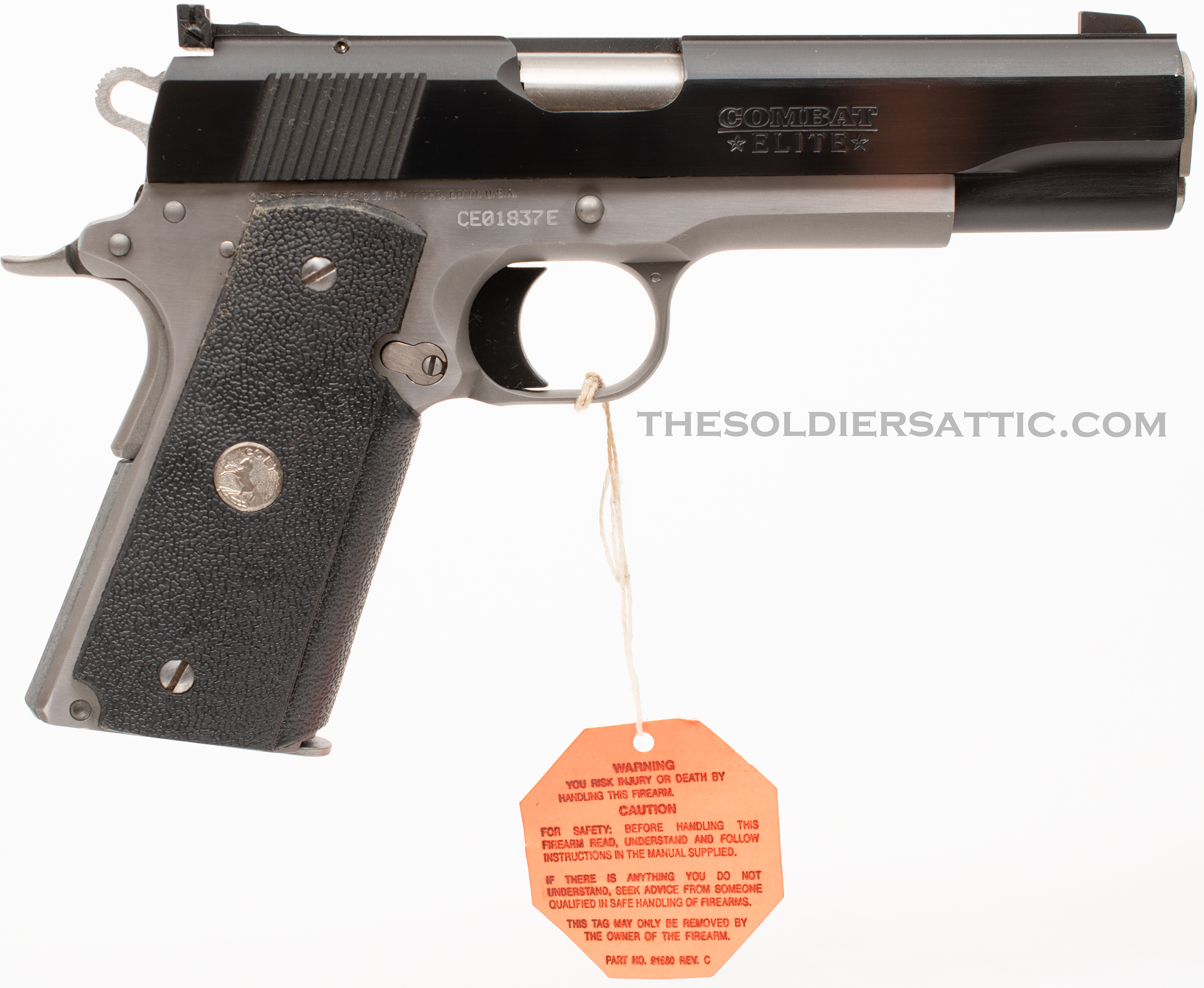This Colt Mark IV Series 80 Combat Elite pistol has been shot very little, if at all, and is in as new condition with hang tag still attached. Bore is in as new condition. Comes with original box that is in structurally sound condition with some storage wear. The sticker is clearly marked with model, barrel, finish, and serial number information. The original plastic case is in excellent condition and contains the original paperwork and an extra magazine. This is a beautiful Colt Combat Elite pistol, great for collecting, displaying, or use at the range.