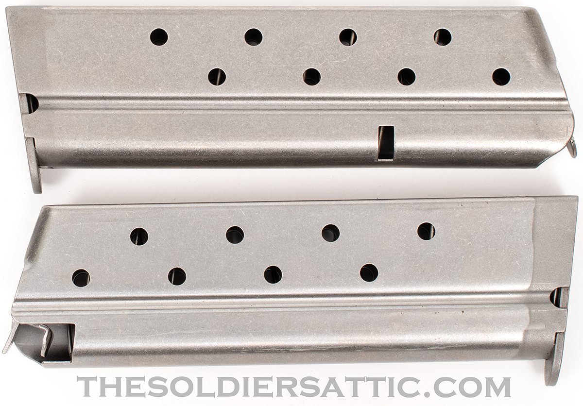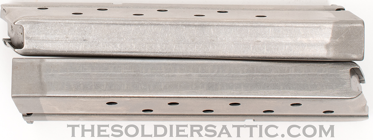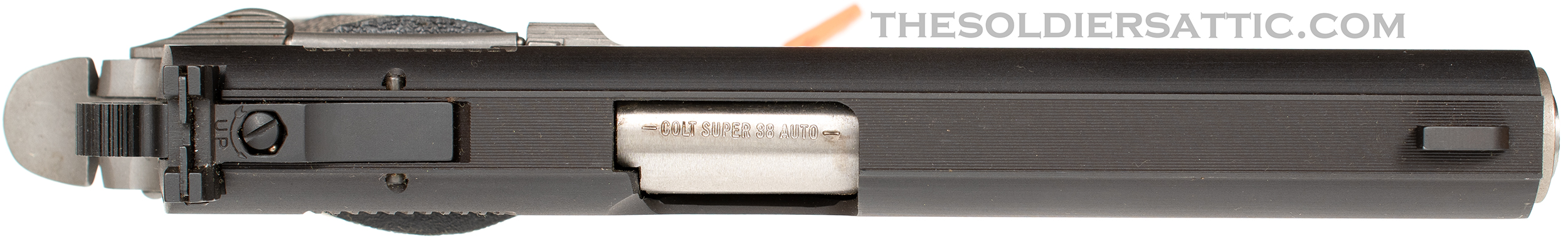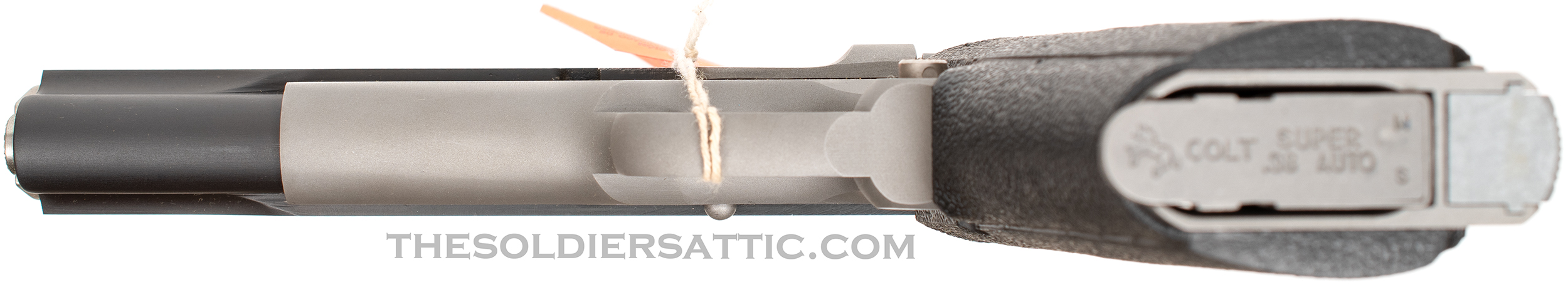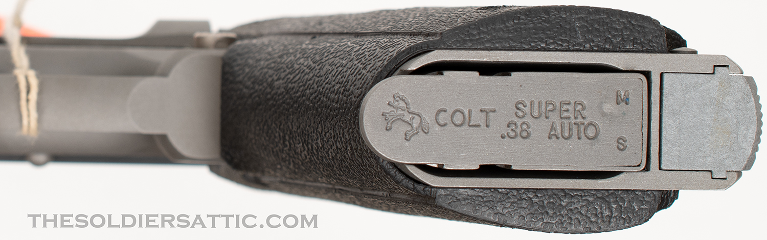 Markings on this Combat Elite pistol include ‘COLT MK IV/SERIES 80’ in front of rampant colt logo on the left side of the slide while the right side is marked ‘COMBAT’ over ‘*ELITE*’. Right side of the frame is marked ‘COLT’S PT.F.A. MFG. CO. HARTFORD, CONN U.S.A.’ above the grip and with the serial number above the trigger. The barrel is marked ‘COLT SUPER 38 AUTO’ above the chamber. Manufacturing and proof marks are found on both sides of the trigger guard and both magazines are stamped with a rampant colt, ‘COLT’, ‘-SUPER/.38 AUTO-’, followed by ‘M’ and ‘9’ in the back corners.