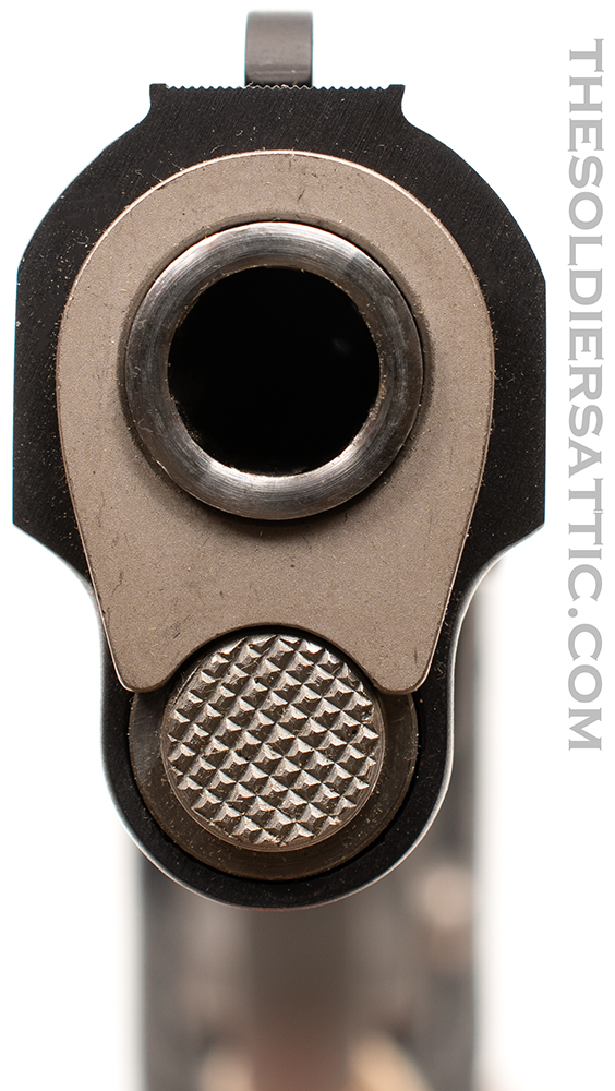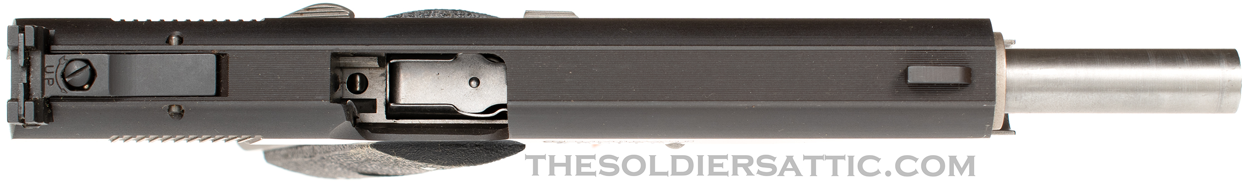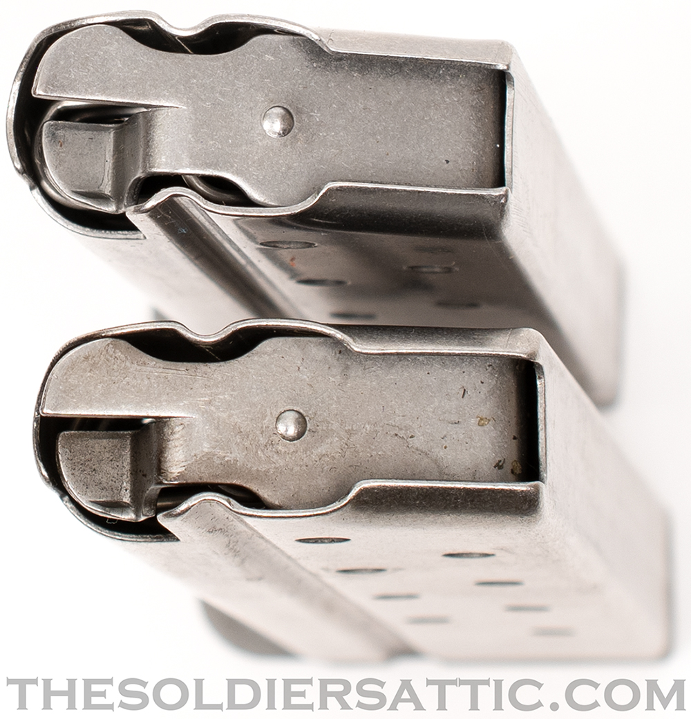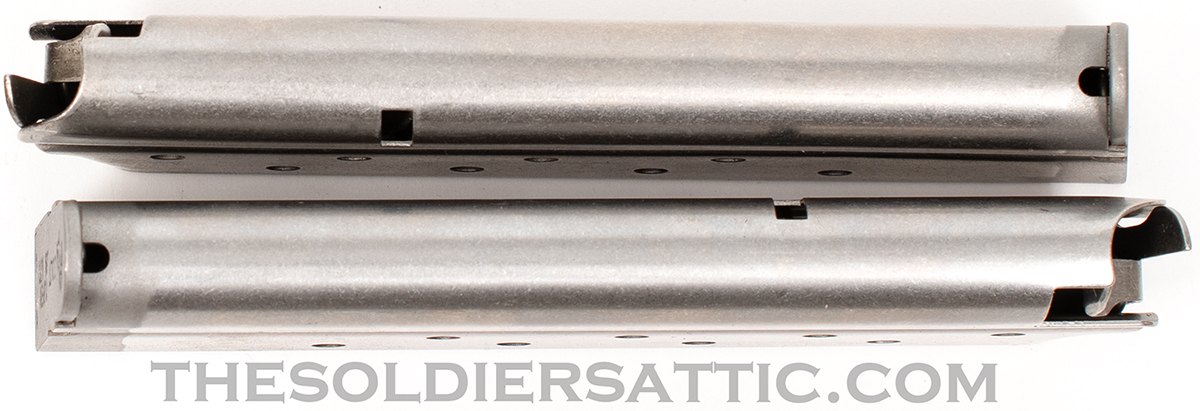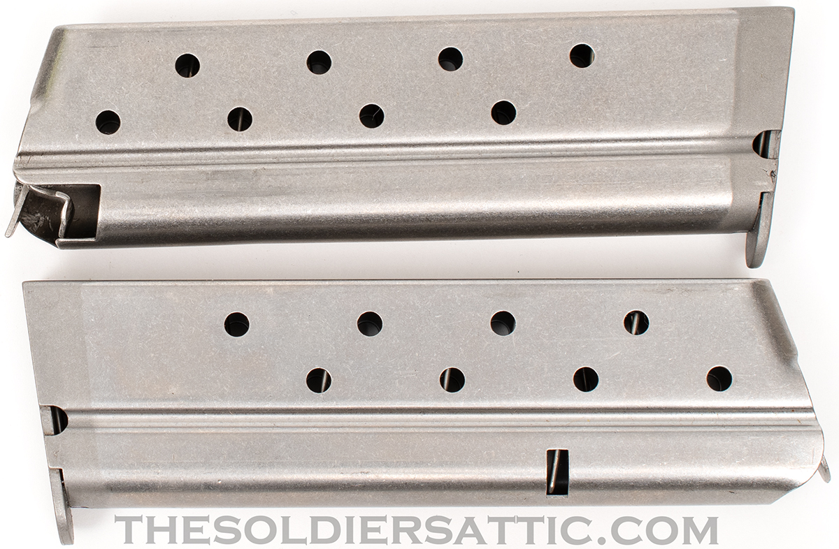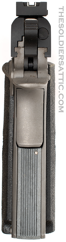 Markings on this Combat Elite pistol include ‘COLT MK IV/SERIES 80’ in front of rampant colt logo on the left side of the slide while the right side is marked ‘COMBAT’ over ‘*ELITE*’. Right side of the frame is marked ‘COLT’S PT.F.A. MFG. CO. HARTFORD, CONN U.S.A.’ above the grip and with the serial number above the trigger. The barrel is marked ‘COLT SUPER 38 AUTO’ above the chamber. Manufacturing and proof marks are found on both sides of the trigger guard and both magazines are stamped with a rampant colt, ‘COLT’, ‘-SUPER/.38 AUTO-’, followed by ‘M’ and ‘9’ in the back corners.