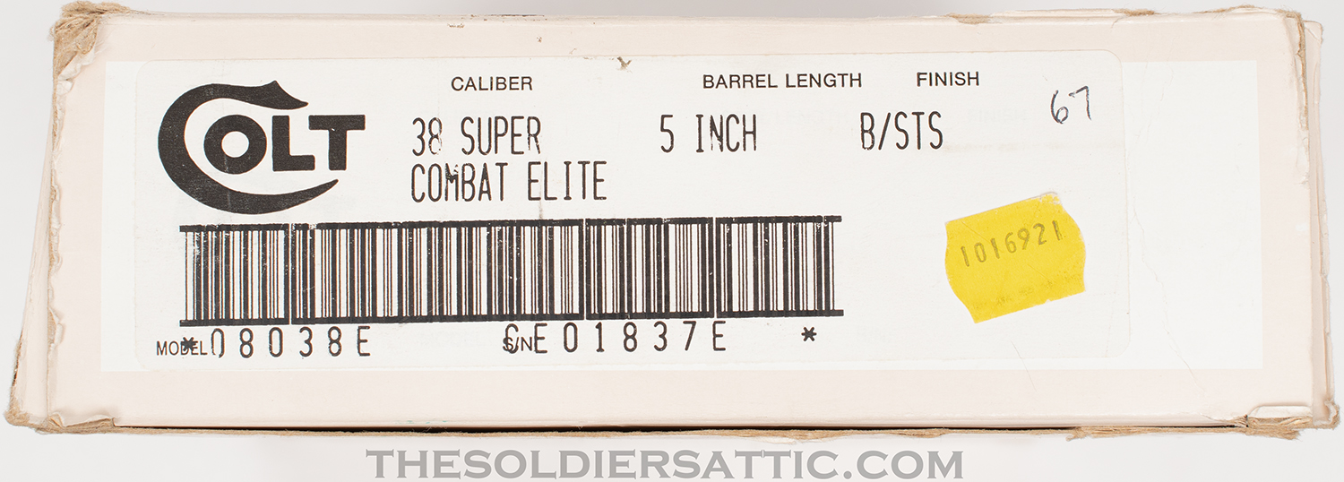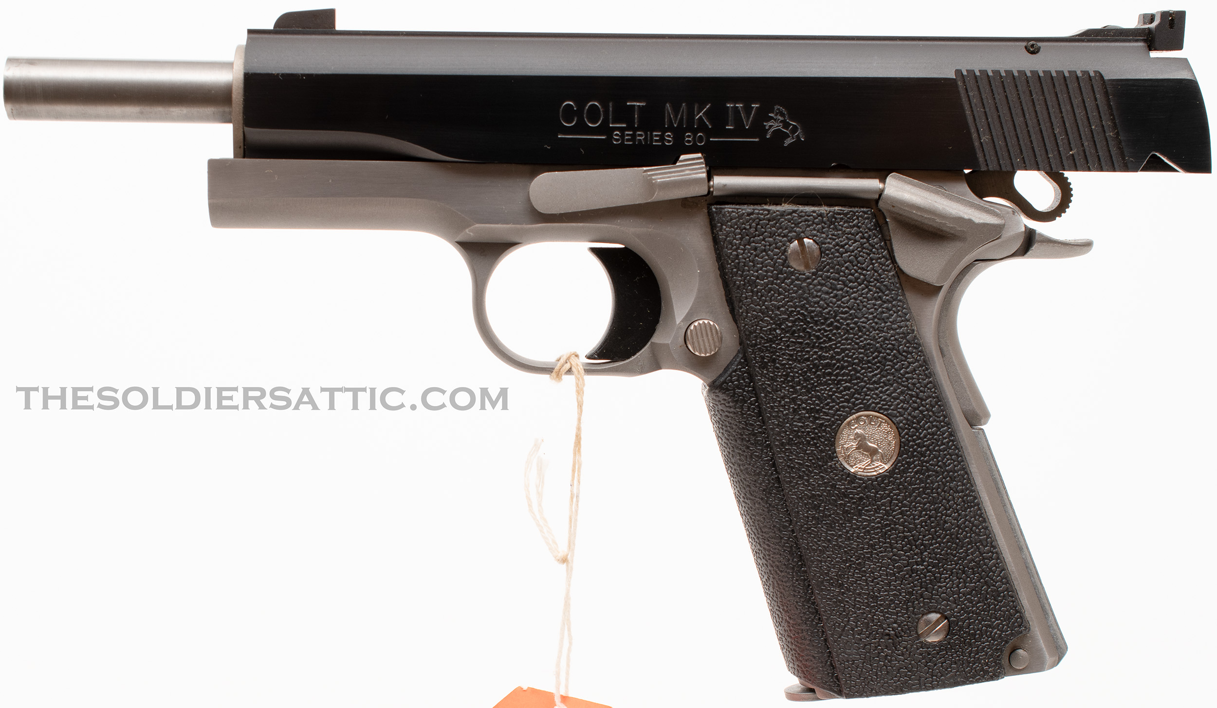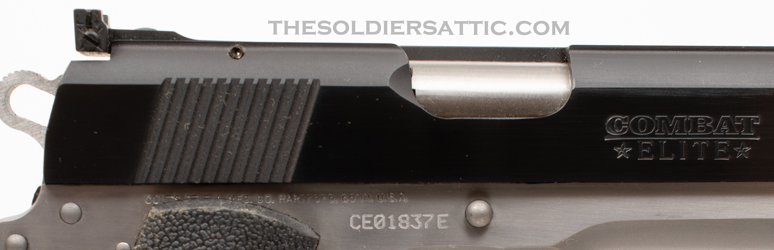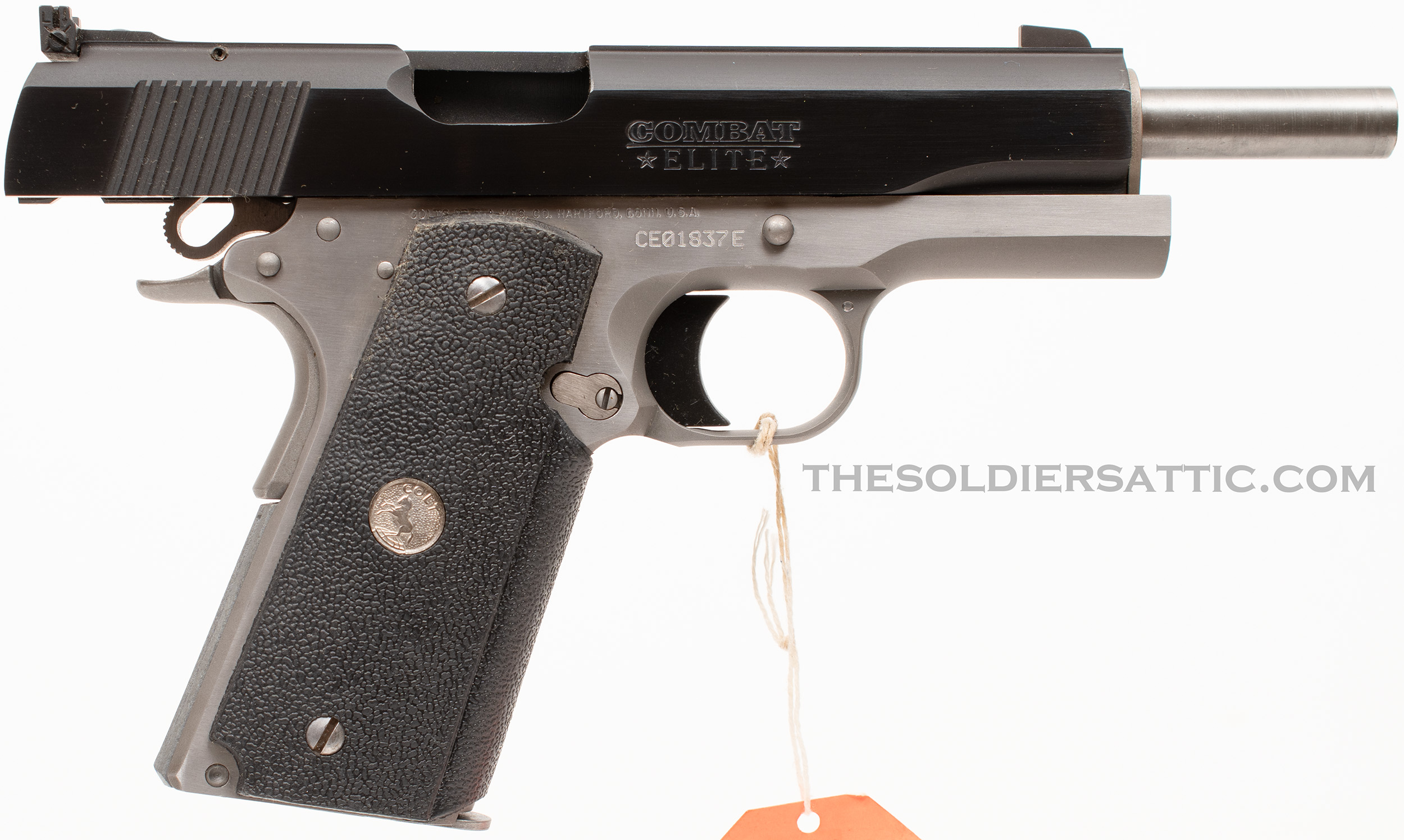 Colt Mark IV Series 80 Combat Elite pistol in .38 Super, like new. Manufactured in 1993 with 5-inch barrel, two-tone stainless and blued finish, and rubber wraparound grips with silver rampant colt medallions. This semi-auto pistol also has a blade front sight with adjustable rear, square notch sight; serrated loop hammer; and beveled magazine well.