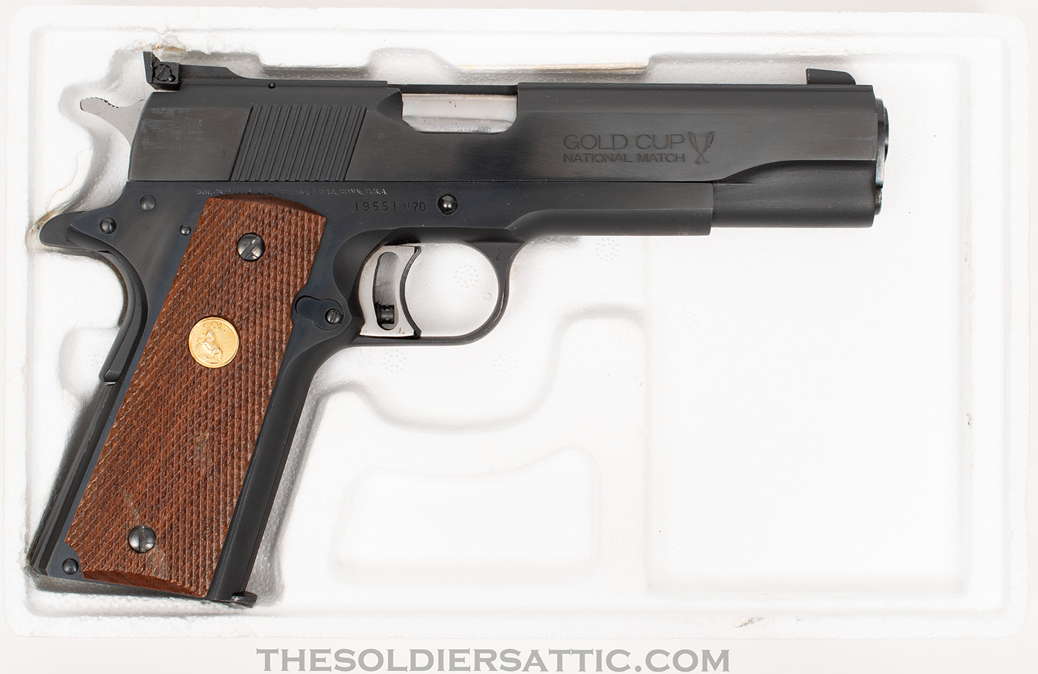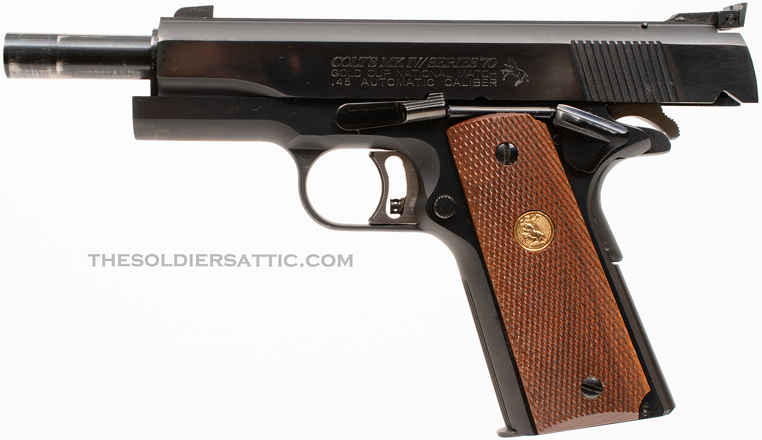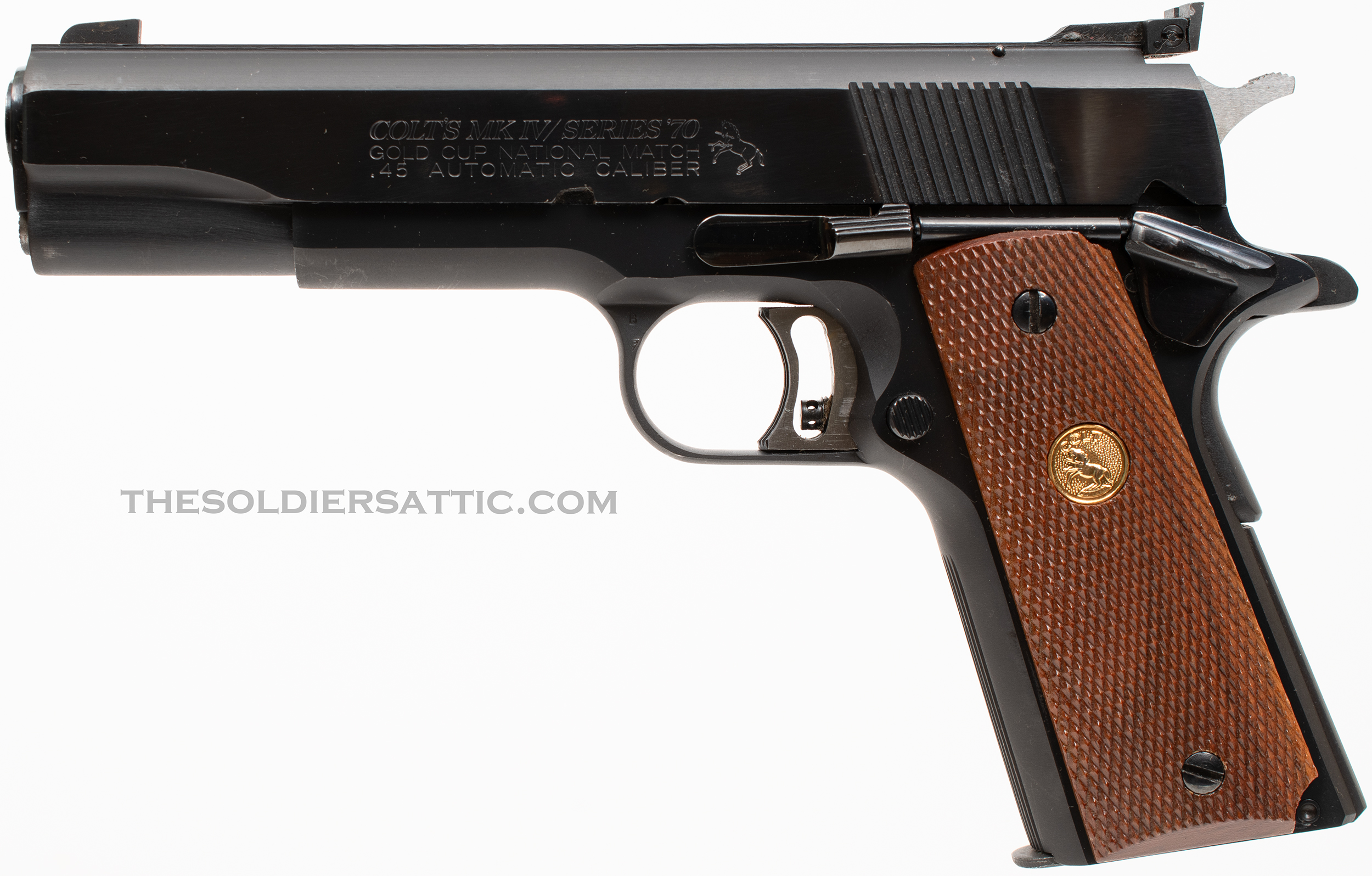 Colt MK IV Series 70 Gold Cup National Match pistol in .45 ACP. Manufactured in 1982 with 5-inch barrel, blued finish, and checkered walnut grips with gold rampant colt medallions. Features specific to the Series 70 Gold Cup National Match pistol include adjustable target trigger; Colt blue finished accurizer barrel; blade front sight with adjustable Colt Elliason rear, square notch, sight; and target hammer.