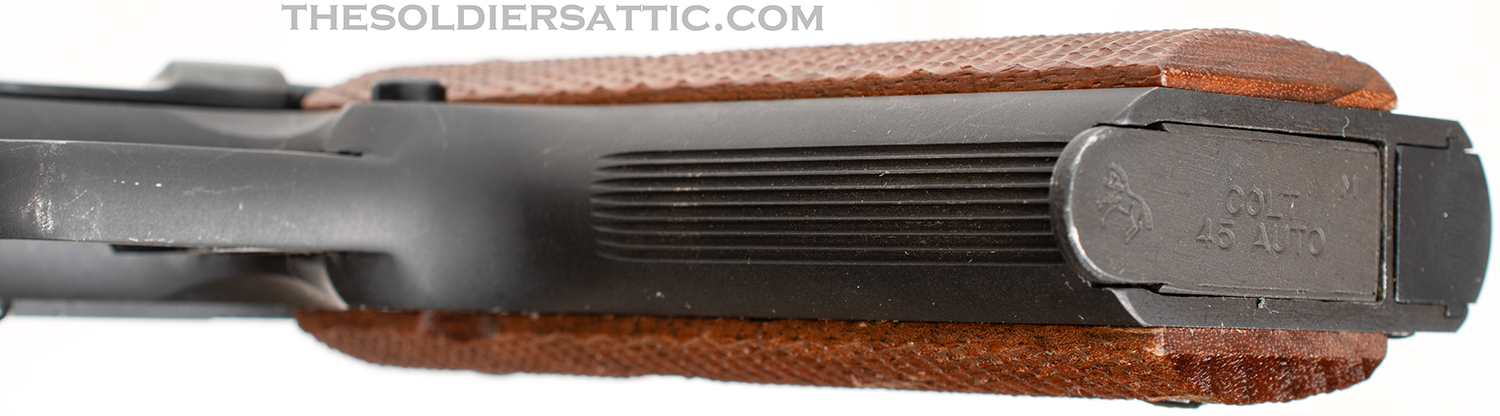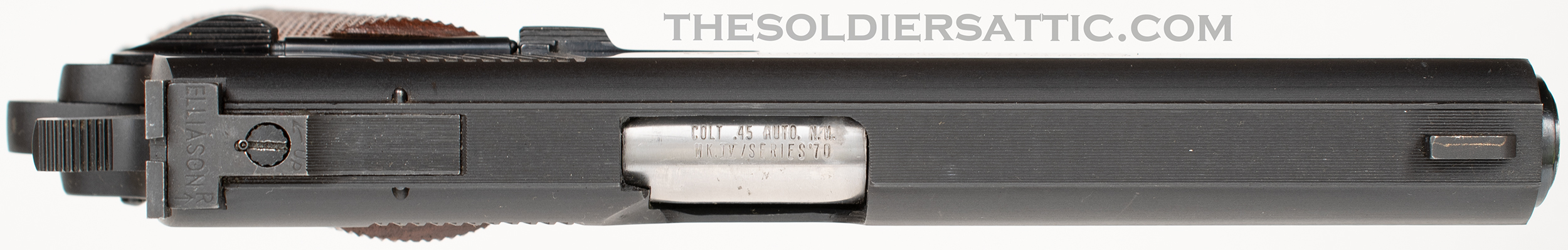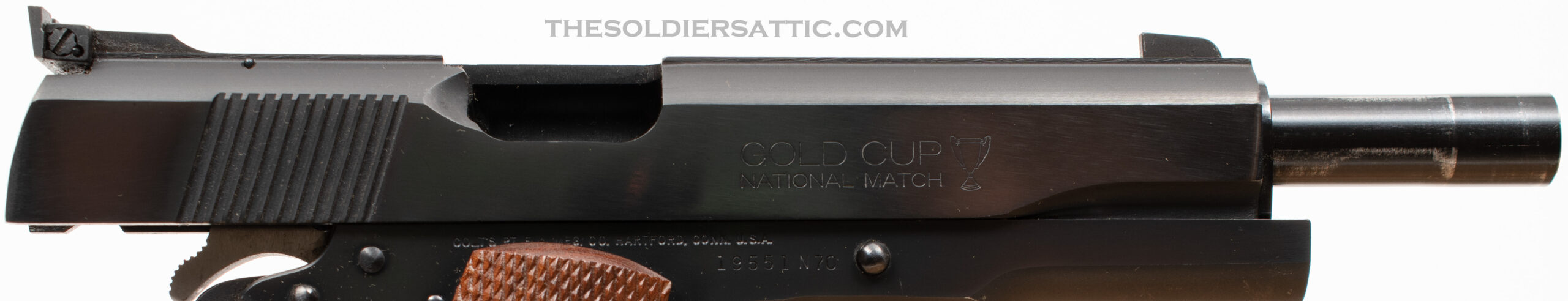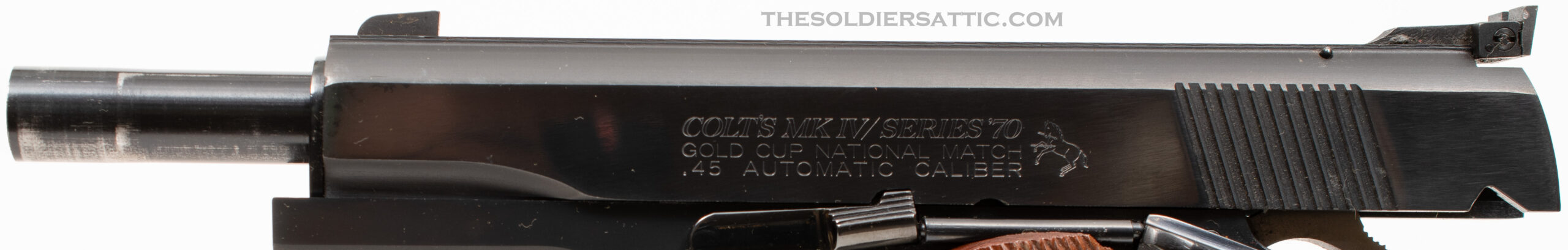 The left side of the slide is marked “COLT’S MK IV/SERIES 70’ over ’GOLD CUP NATIONAL MATCH’ over ’.45 AUTOMATIC CALIBER’ in front of a rampant colt logo. The right side is marked ‘GOLD CUP’ over ’NATIONAL MATCH’ behind a trophy cup logo. Right side of the frame is marked ‘COLT’S PT.F.A. MFG. CO. HARTFORD, CONN U.S.A.’ above the grip and with the serial number above the trigger. The barrel is marked ‘COLT .45 AUTO. N.M.’ over ’MK IV/SERIES 70’ above the chamber. Manufacturing and proof marks are found on both sides of the trigger guard, and the magazine is stamped with a rampant colt logo, ‘COLT’ over ‘45 AUTO’ and the letter ‘M’ on the back left corner.