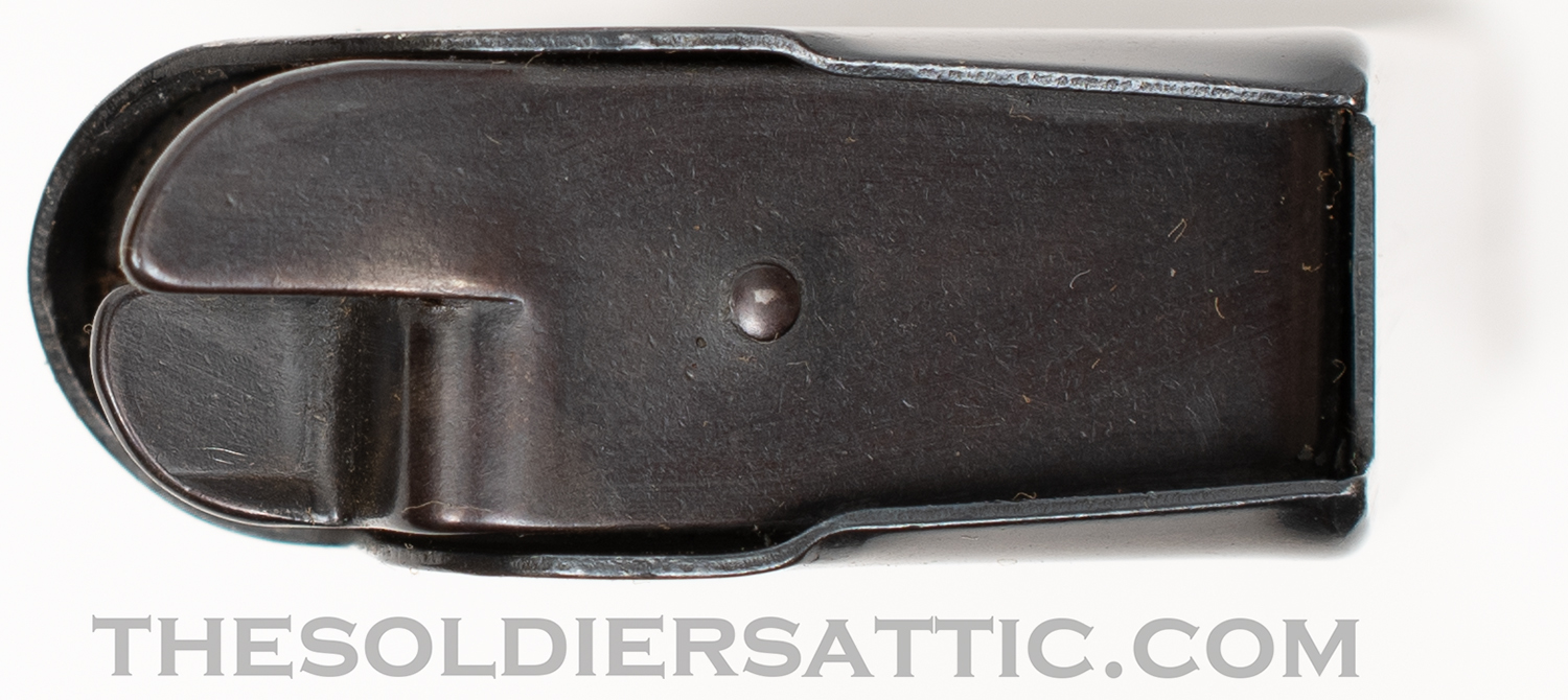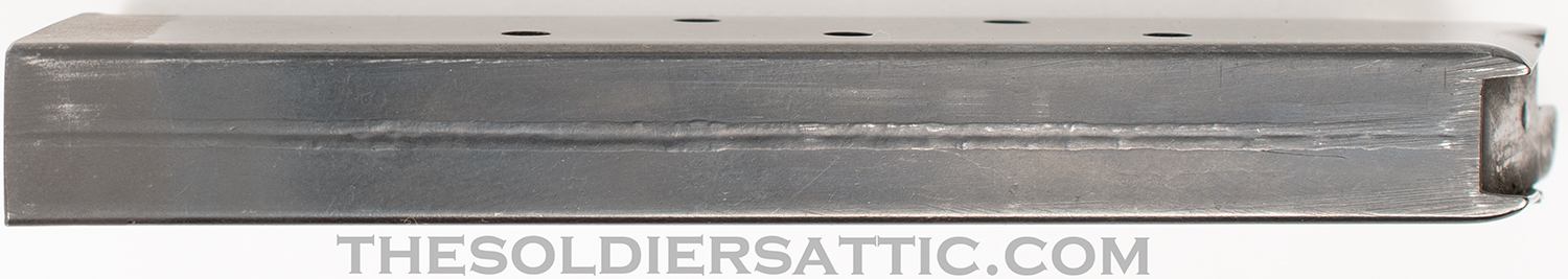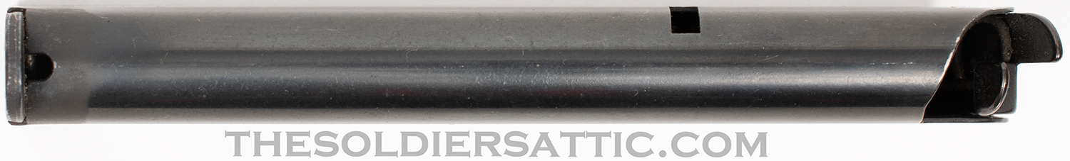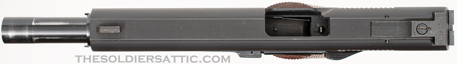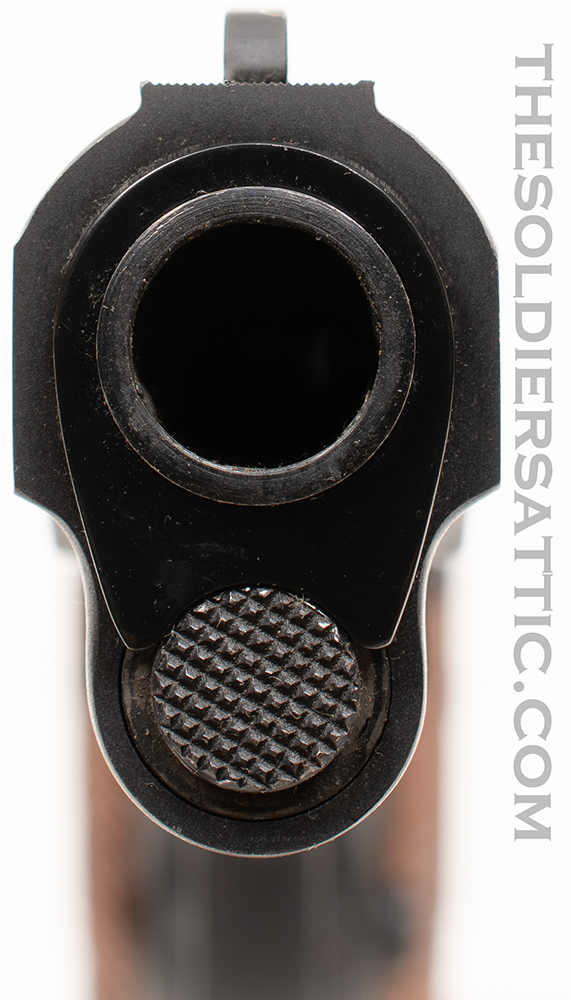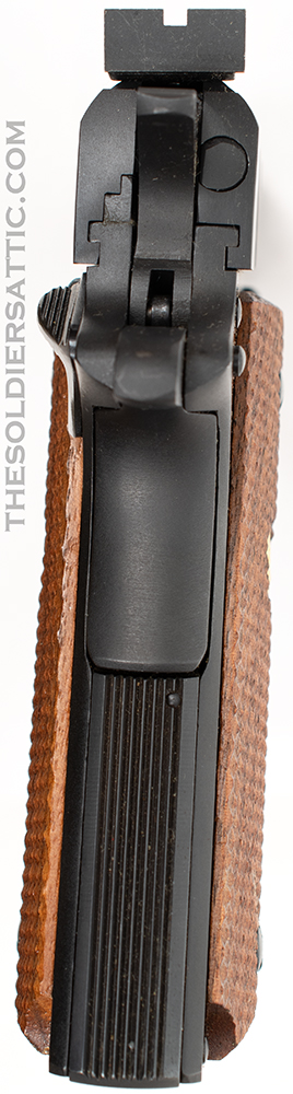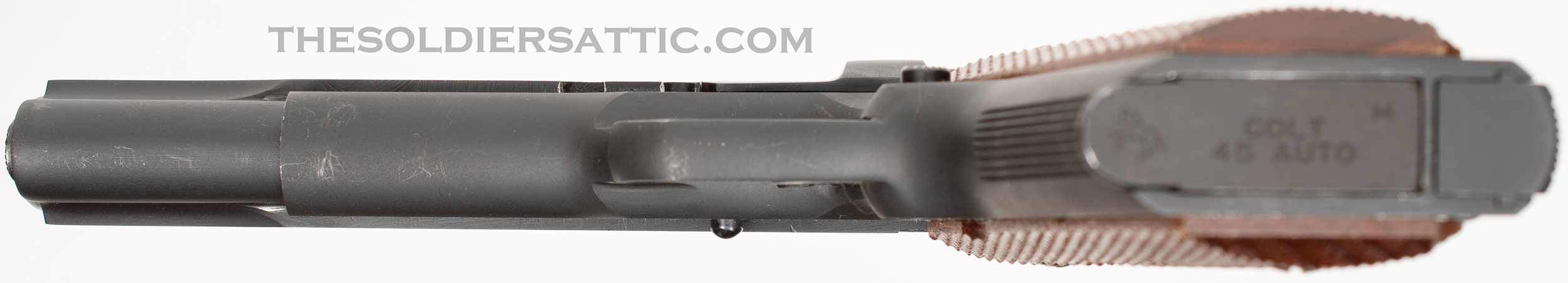 The left side of the slide is marked “COLT’S MK IV/SERIES 70’ over ’GOLD CUP NATIONAL MATCH’ over ’.45 AUTOMATIC CALIBER’ in front of a rampant colt logo. The right side is marked ‘GOLD CUP’ over ’NATIONAL MATCH’ behind a trophy cup logo. Right side of the frame is marked ‘COLT’S PT.F.A. MFG. CO. HARTFORD, CONN U.S.A.’ above the grip and with the serial number above the trigger. The barrel is marked ‘COLT .45 AUTO. N.M.’ over ’MK IV/SERIES 70’ above the chamber. Manufacturing and proof marks are found on both sides of the trigger guard, and the magazine is stamped with a rampant colt logo, ‘COLT’ over ‘45 AUTO’ and the letter ‘M’ on the back left corner.