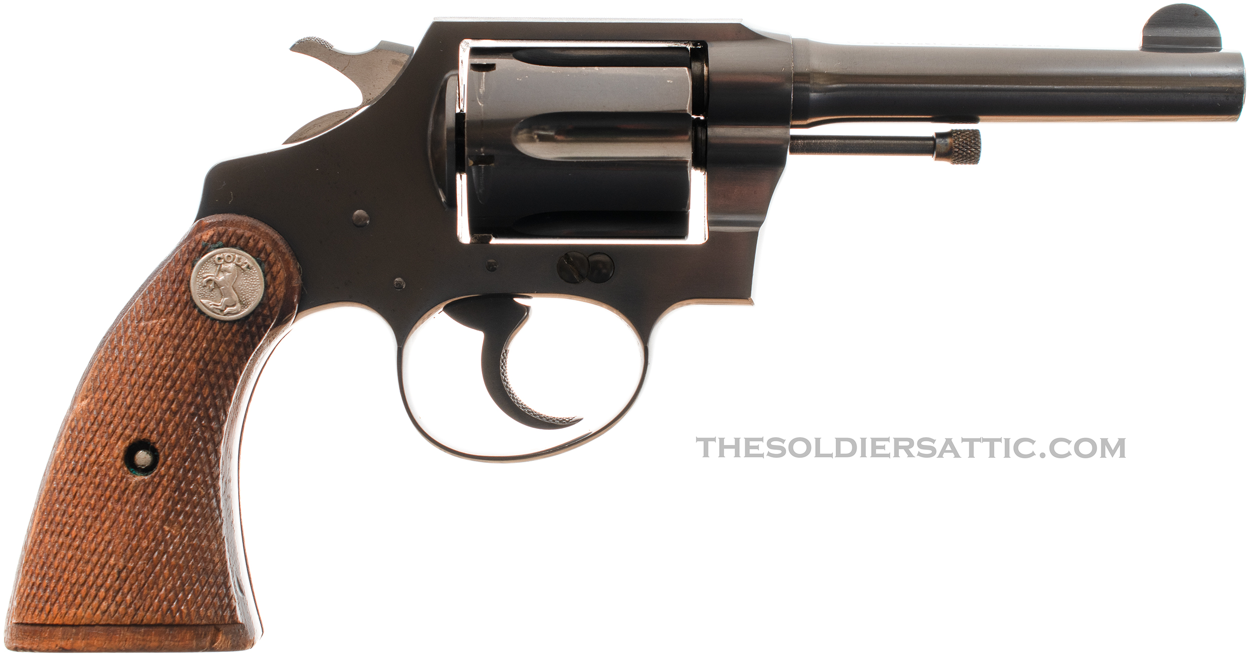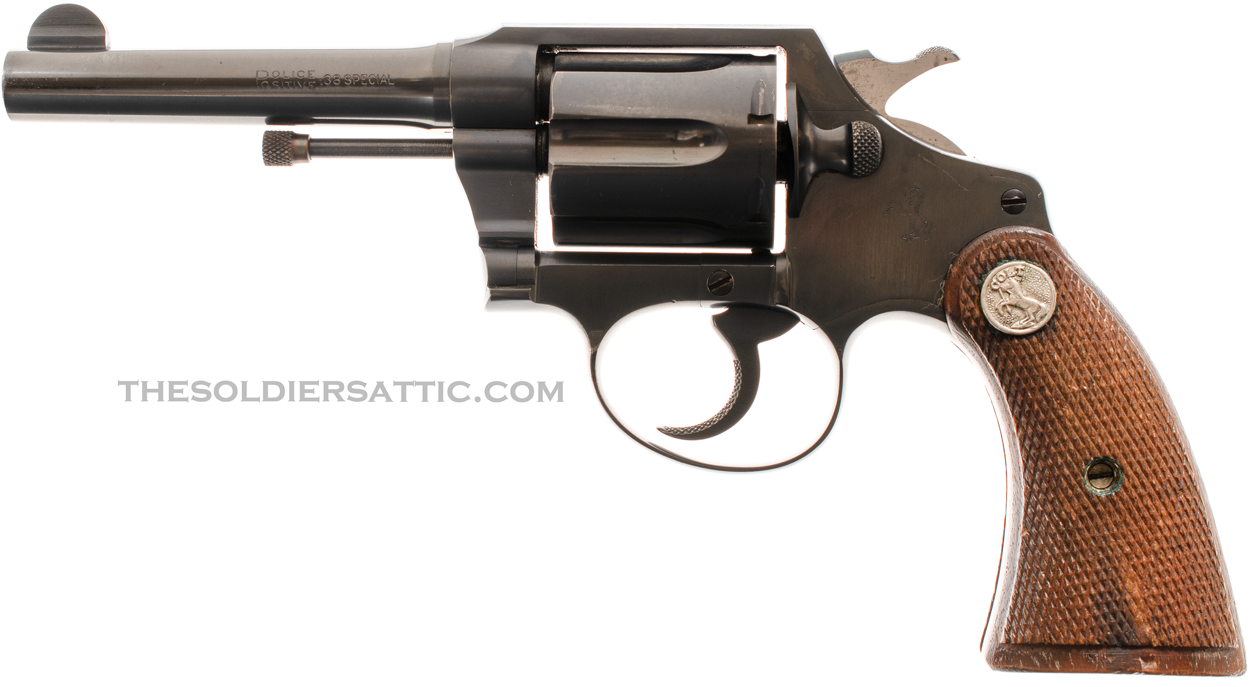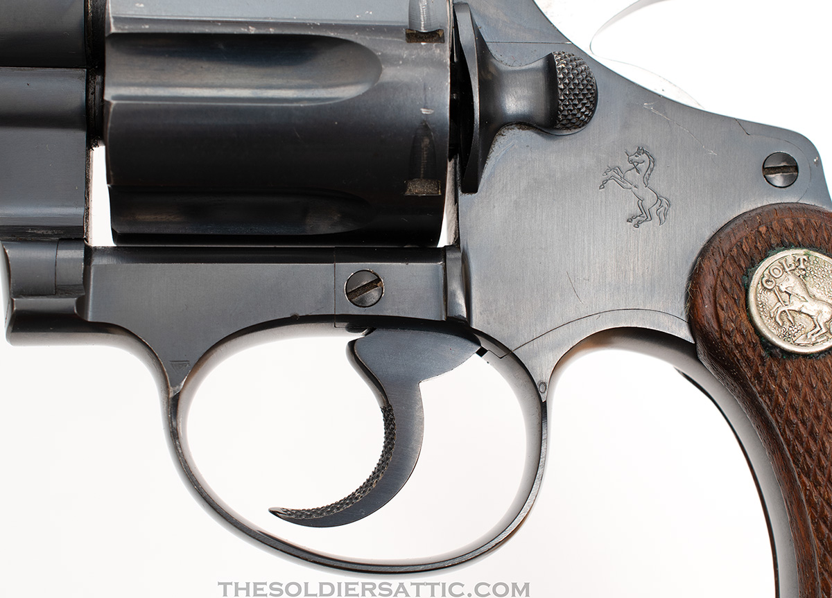 The Colt Police Positive 38 revolver was introduced in 1907 and produced until 1947. The double-action, six-shot revolver proved a popular arm for law enforcement. The Police Positive offered here was manufactured in 1935 and part of the second issue group (1928-1947) with the last patent date of 1926 on top of the barrel. The revolver features a blued finish, serrated topstrap, four-inch barrel, half-moon blade front sight and notched topstrap rear sight, two-piece checkered walnut grips with silver rampant colt medallions at the top, and is chambered in .38 Special.