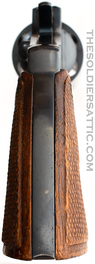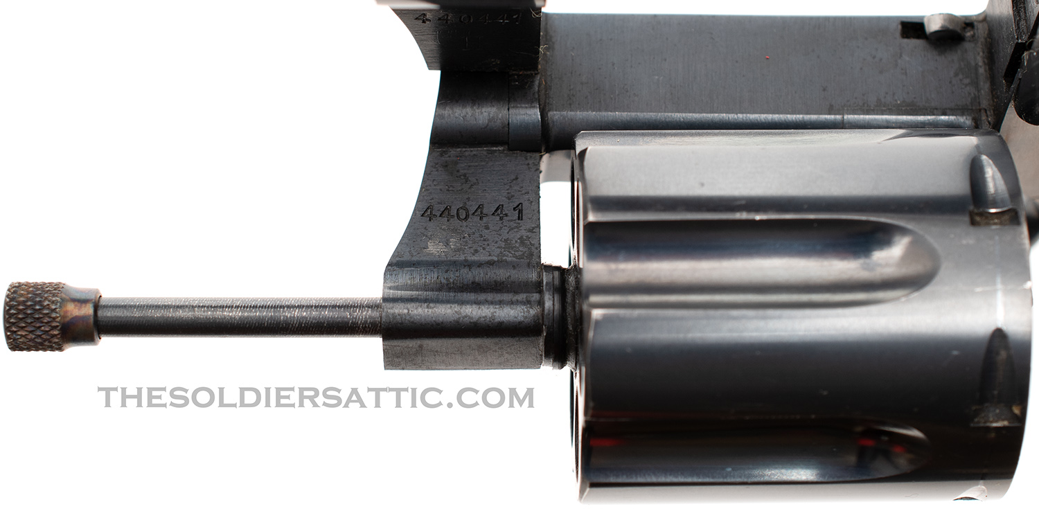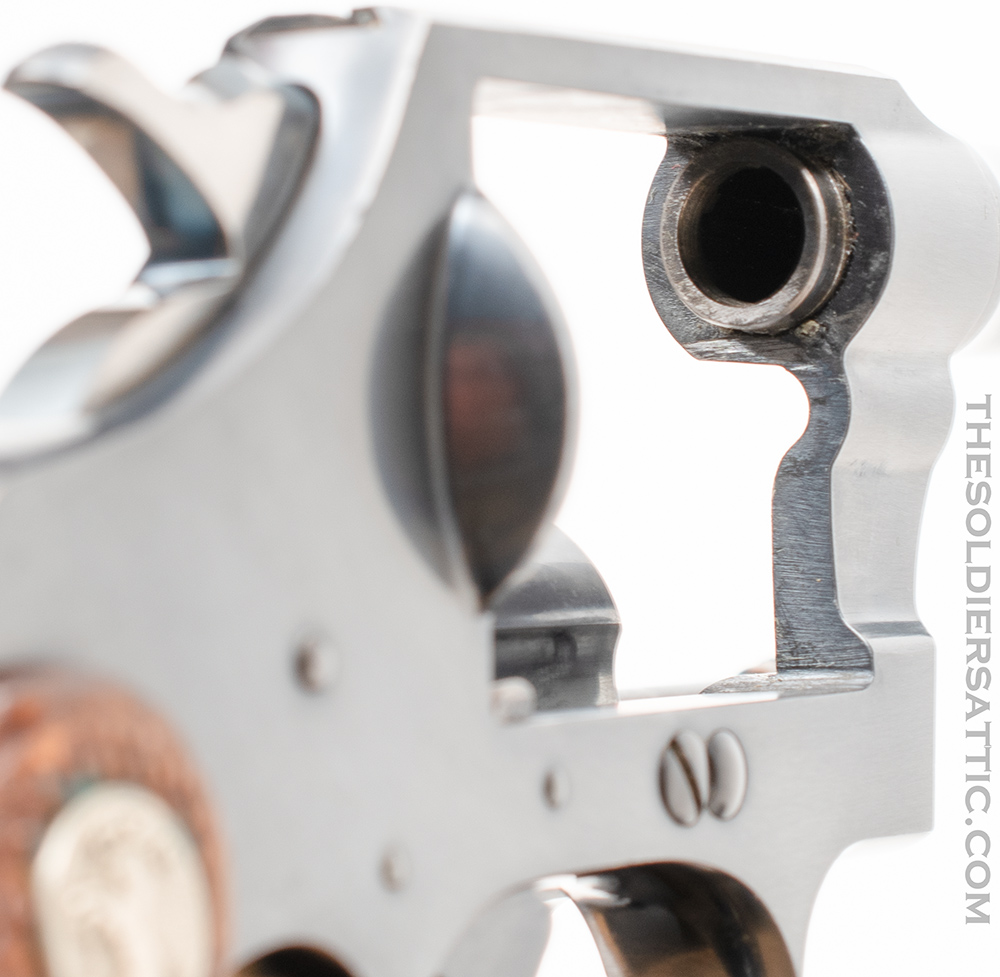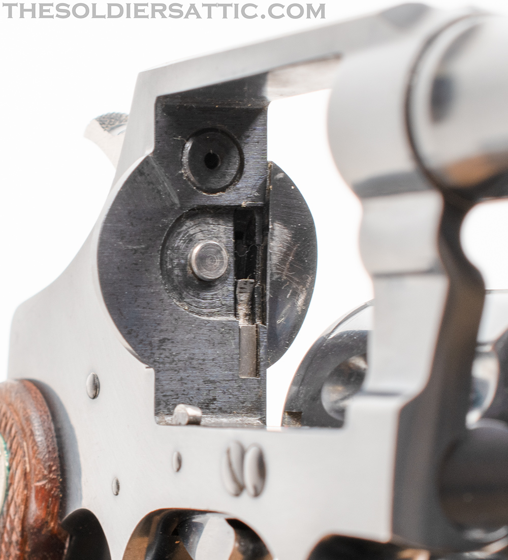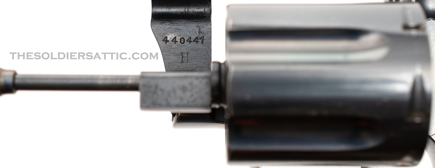 Markings on this Colt Police Positive 38 revolver include ‘COLT’S PT. F.A. MFG. CO. HARTFORD, CT. U.S.A./PAT’D AUG 5, 1884. JULY 4, 1905. OCT. 5, 1926.’ on top of the barrel and ‘POLICE-/POSITIVE’ ‘.38 SPECIAL’ on the left side of the barrel. The left side of the frame is marked with the rampant colt logo and under the crane, on the frame, is the serial number below an inverted ‘1’ and above the letter ‘H’. The SN is stamped on the crane as well. The Verified Proof (VP within a triangle) mark is found on the left side of the frame just above the front trigger guard and is struck at an angle with the lower point on the inverted triangle very light. The number ‘0’ is found on the same side, just above the rear of the trigger guard. A ‘V’ is stamped under the barrel, just to the front of the frame. The front face of the cylinder is marked with an ‘E’ and an over stamped ‘Z’ between chambers.