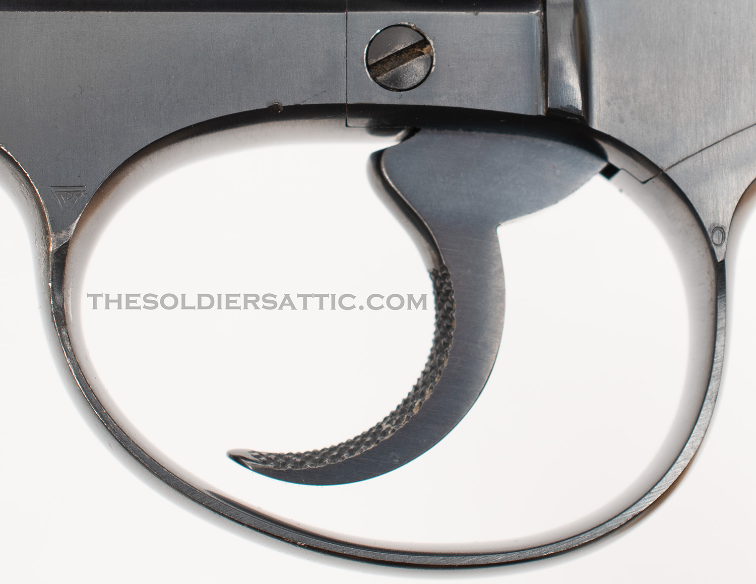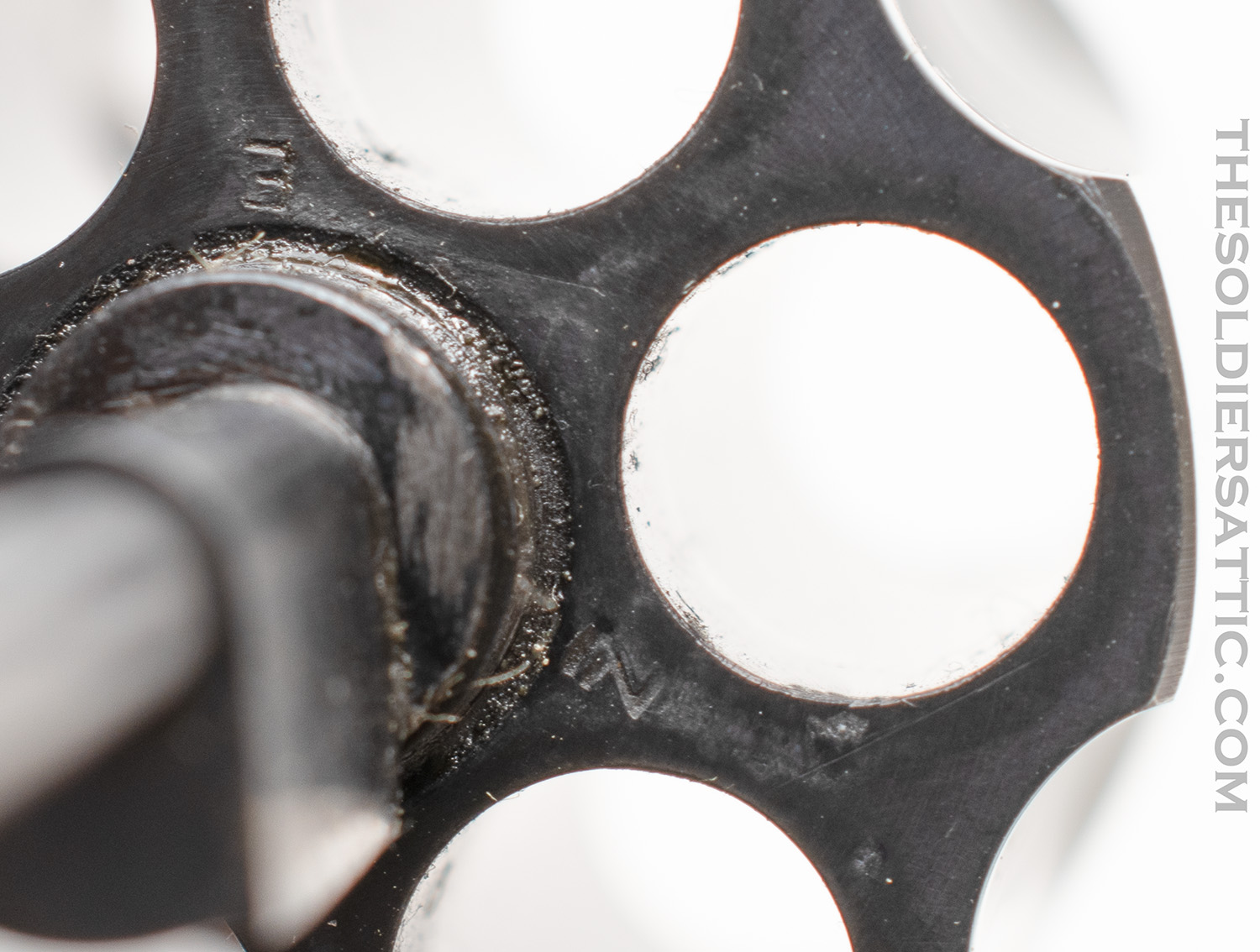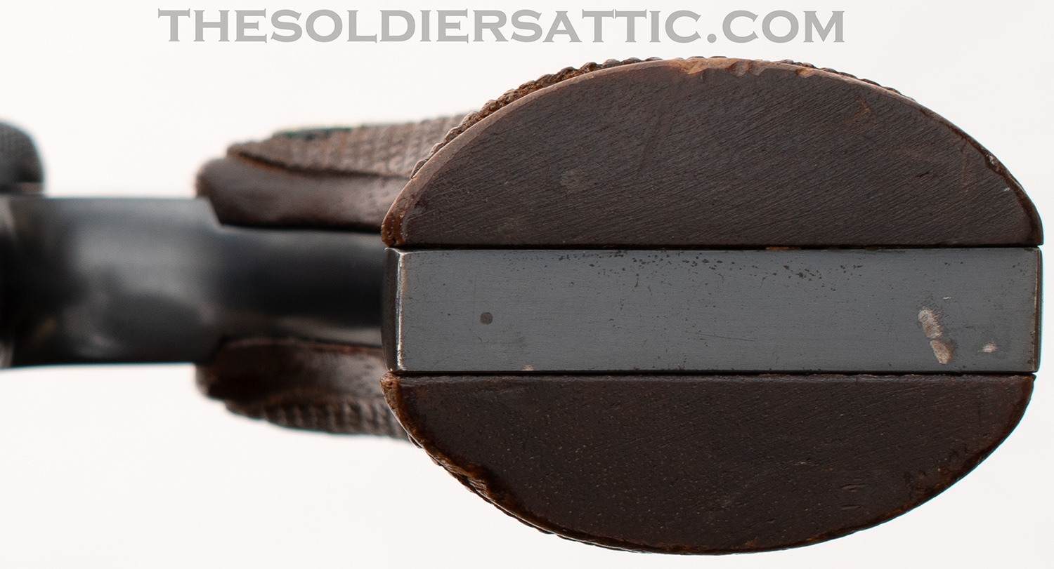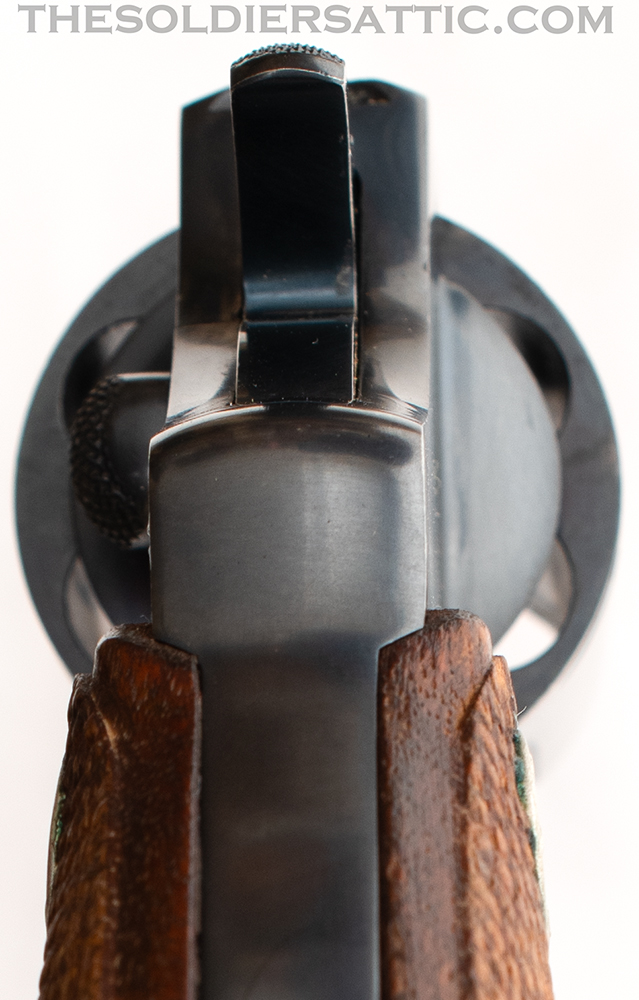 Markings on this Colt Police Positive 38 revolver include ‘COLT’S PT. F.A. MFG. CO. HARTFORD, CT. U.S.A./PAT’D AUG 5, 1884. JULY 4, 1905. OCT. 5, 1926.’ on top of the barrel and ‘POLICE-/POSITIVE’ ‘.38 SPECIAL’ on the left side of the barrel. The left side of the frame is marked with the rampant colt logo and under the crane, on the frame, is the serial number below an inverted ‘1’ and above the letter ‘H’. The SN is stamped on the crane as well. The Verified Proof (VP within a triangle) mark is found on the left side of the frame just above the front trigger guard and is struck at an angle with the lower point on the inverted triangle very light. The number ‘0’ is found on the same side, just above the rear of the trigger guard. A ‘V’ is stamped under the barrel, just to the front of the frame. The front face of the cylinder is marked with an ‘E’ and an over stamped ‘Z’ between chambers.