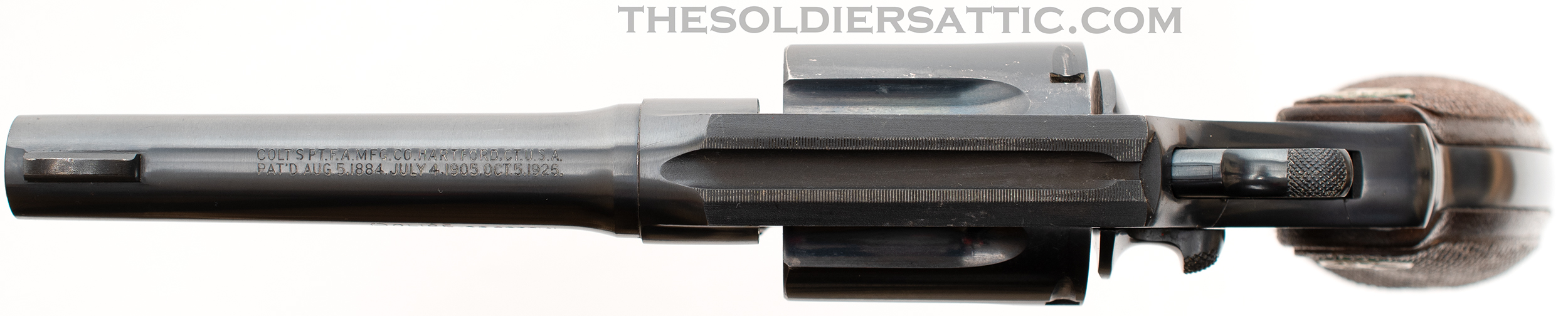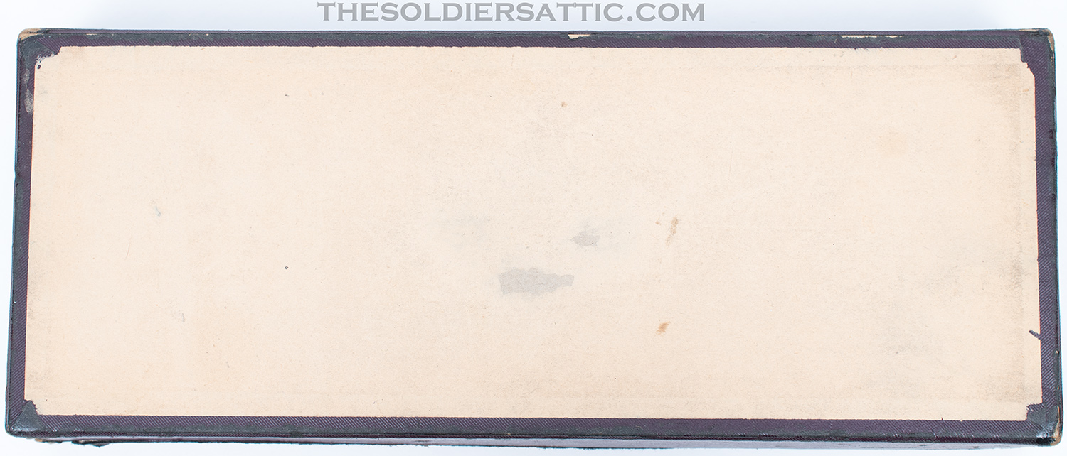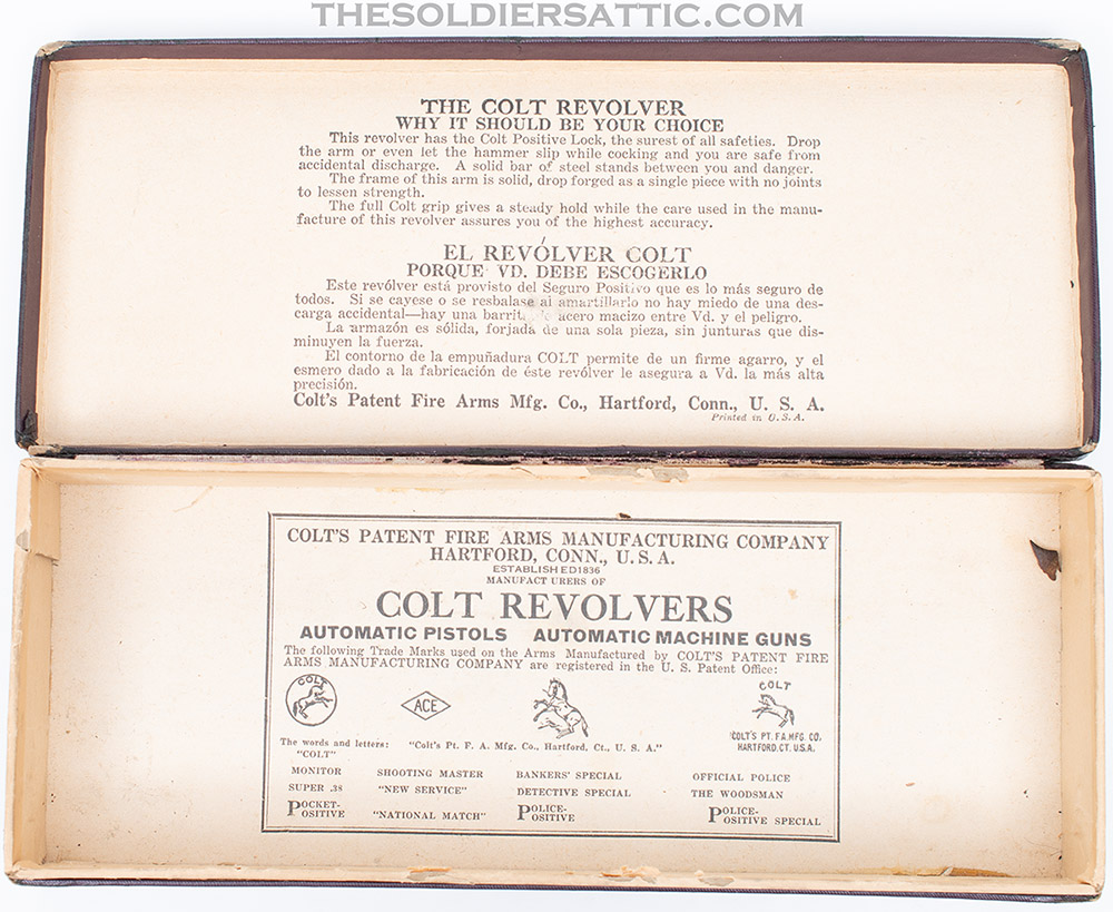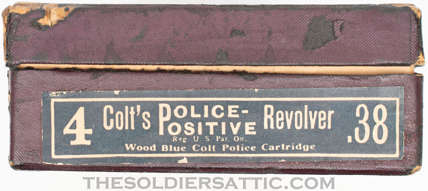 The original box is in excellent structural condition with storage and handling wear along the edges and corners. No serial number is marked on the box. Colt’s advertising and trademark information is marked inside the box top and bottom, while the end bears a sticker on the outside with the revolver information ‘4’ ‘COLT’S POLICE-/POSITIVE REVOLVER’ .38’ over ‘Reg U.S. Pat. Off.’ over ‘Wood Blue Colt Police Cartridge’.