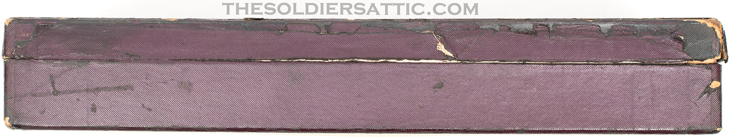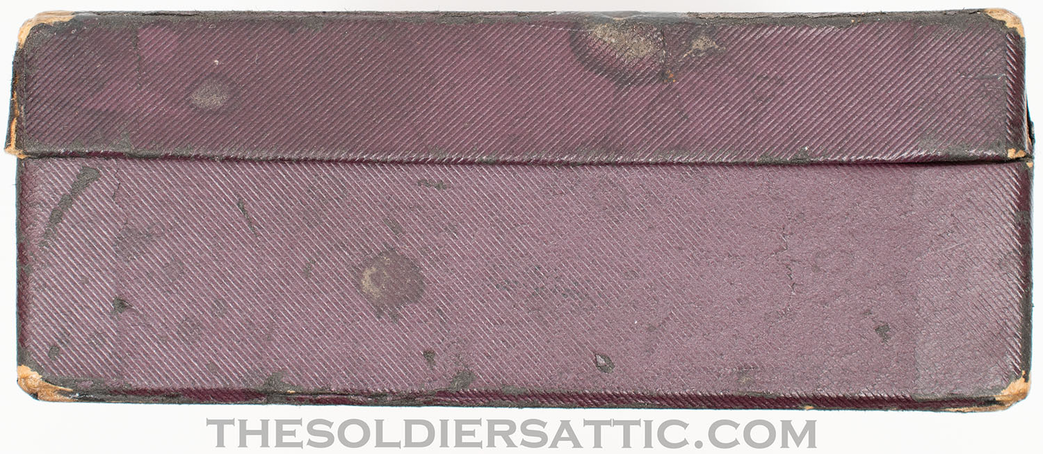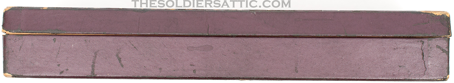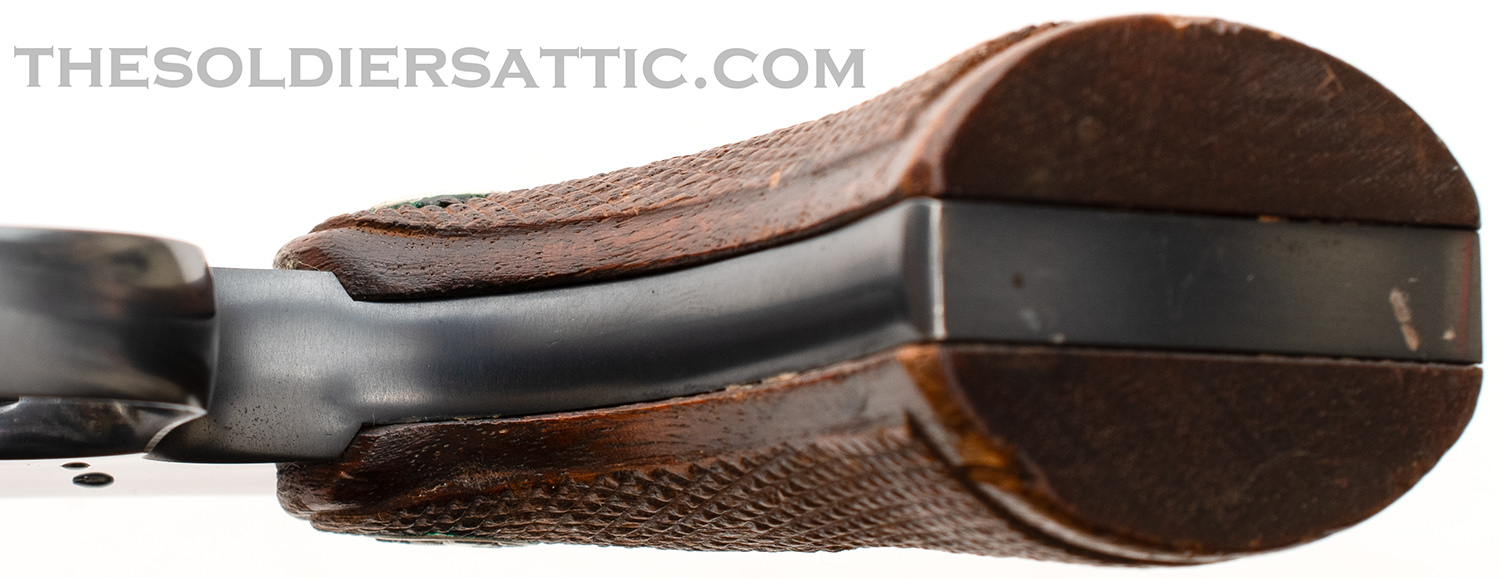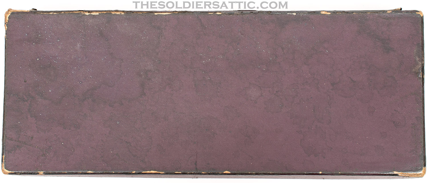 The original box is in excellent structural condition with storage and handling wear along the edges and corners. No serial number is marked on the box. Colt’s advertising and trademark information is marked inside the box top and bottom, while the end bears a sticker on the outside with the revolver information ‘4’ ‘COLT’S POLICE-/POSITIVE REVOLVER’ .38’ over ‘Reg U.S. Pat. Off.’ over ‘Wood Blue Colt Police Cartridge’.