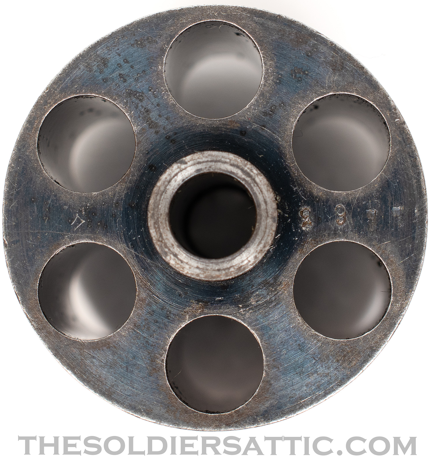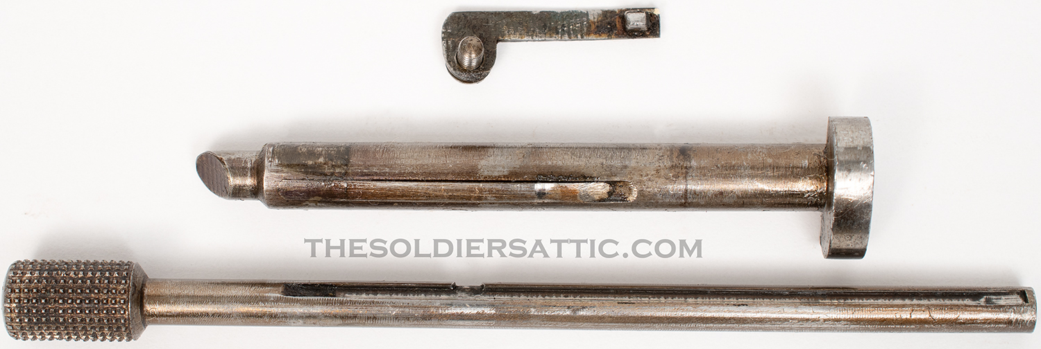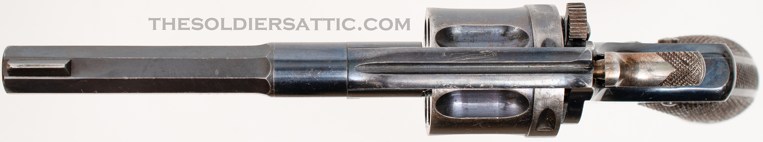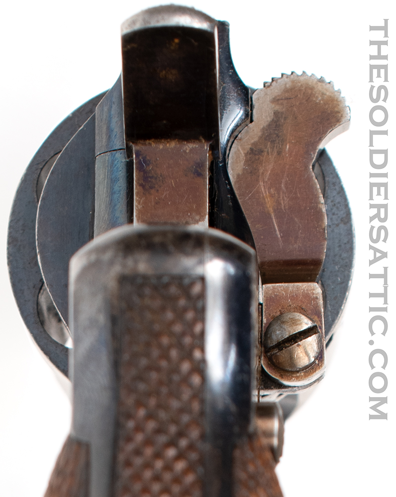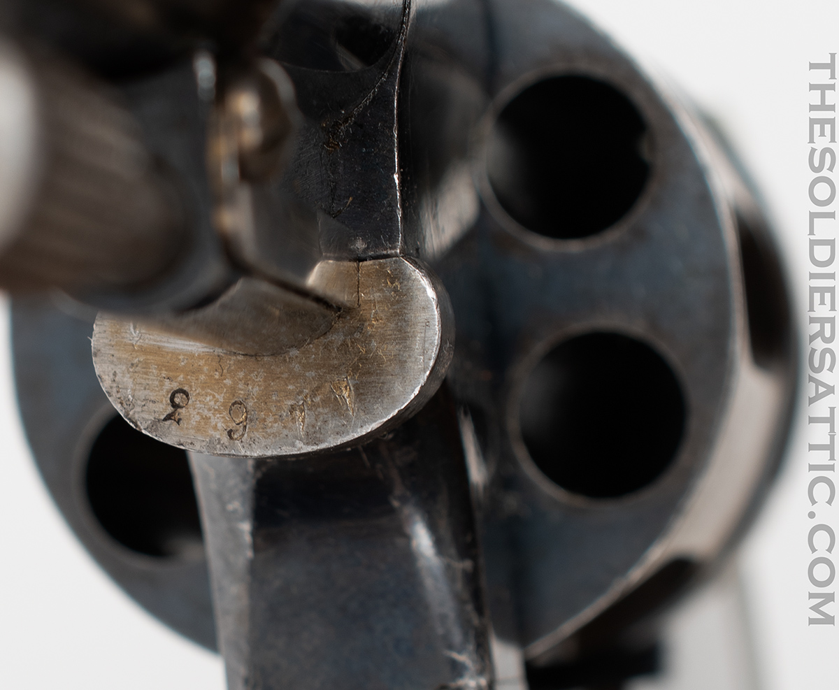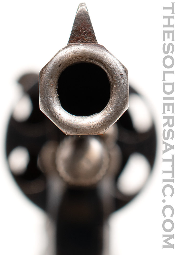 Overall, this is a very good M1887. The blue finish remains strong with highpoint wear at the muzzle, trigger guard, cylinder, and butt. The straw-color is strong on the hammer, loading assembly, trigger and cylinder pin assembly. Service handling marks are scattered throughout the metal surfaces. The grips show little wear and are not cracked. The bore is clean, bright and has excellent rifling. The action is strong and cylinder indexes well while drawing the hammer back.