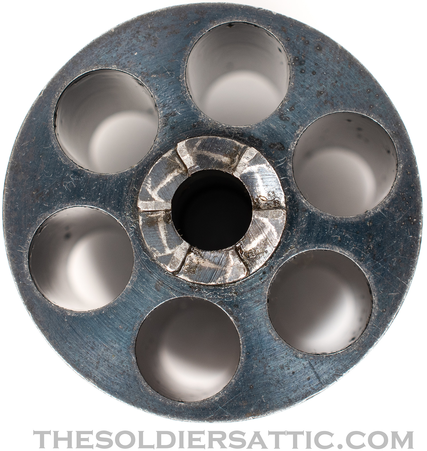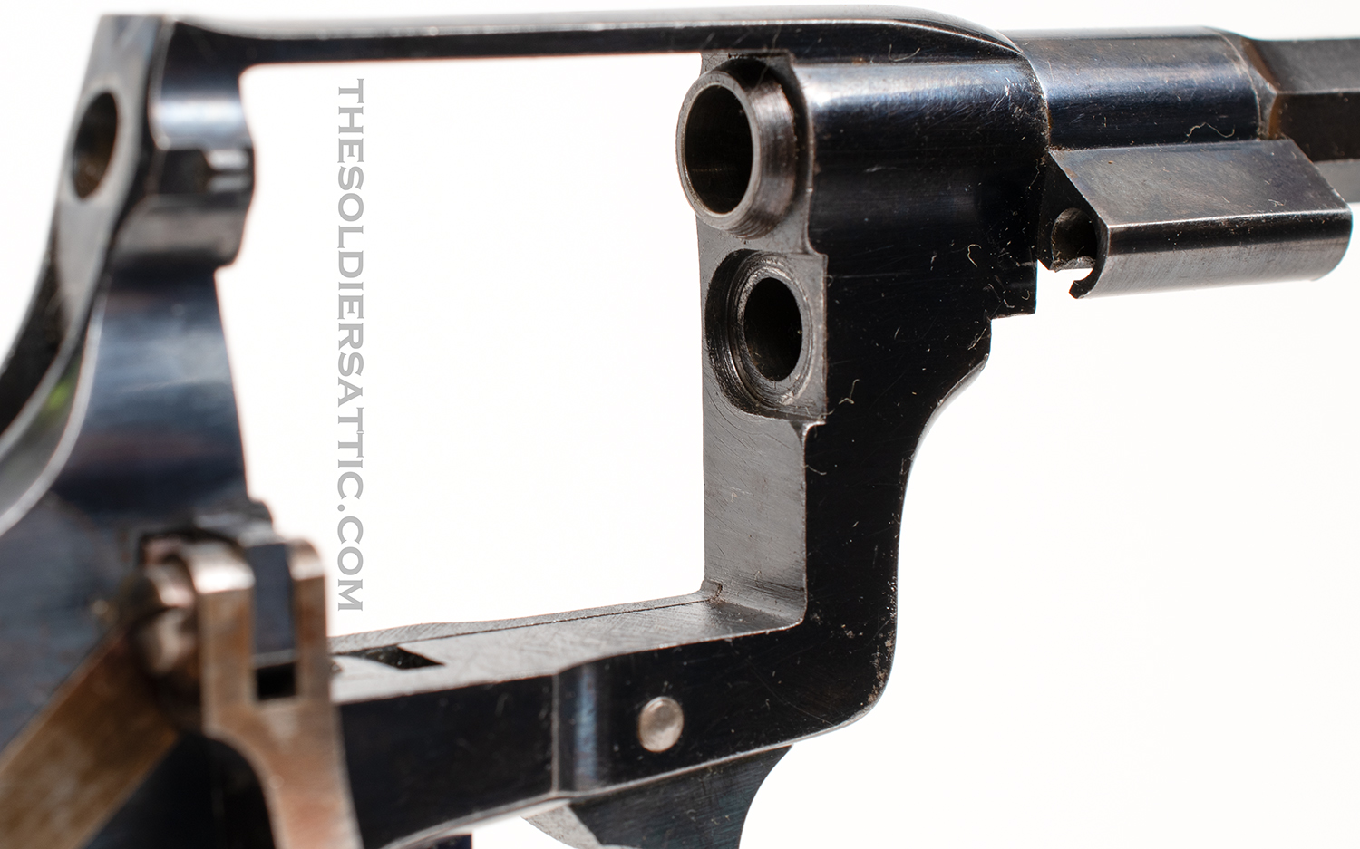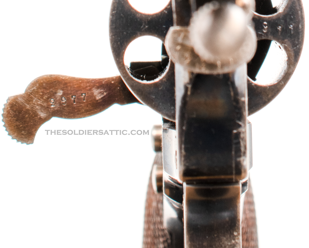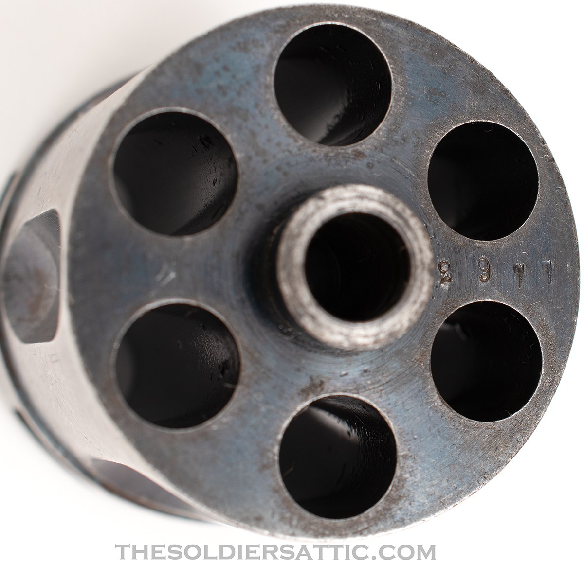 Overall, this is a very good M1887. The blue finish remains strong with highpoint wear at the muzzle, trigger guard, cylinder, and butt. The straw-color is strong on the hammer, loading assembly, trigger and cylinder pin assembly. Service handling marks are scattered throughout the metal surfaces. The grips show little wear and are not cracked. The bore is clean, bright and has excellent rifling. The action is strong and cylinder indexes well while drawing the hammer back.