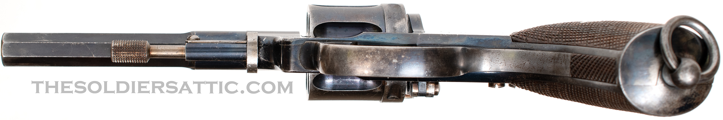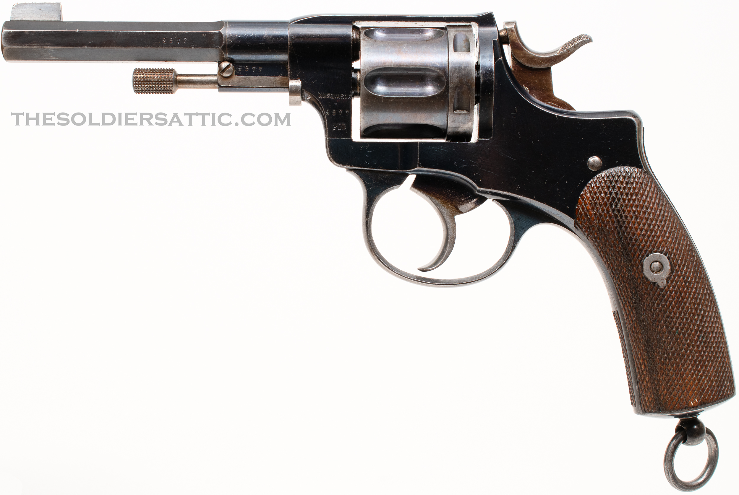 Seen here is a Husqvarna Vapenfabrik M1887 revolver, serial number 29XX manufactured ca. 1898. Features include a double-action, six-shot design, a firing pin integral to the hammer, lanyard ring, 4 ½-inch barrel, and square front sight (Nagant versions have a rounded front sight). The frame, cylinder, trigger guard, and barrel are all blued, while the hammer, trigger, cylinder pin assembly, and loading assembly are all straw-colored. The wooden grips are checkered. Major parts carry the matching serial number.
