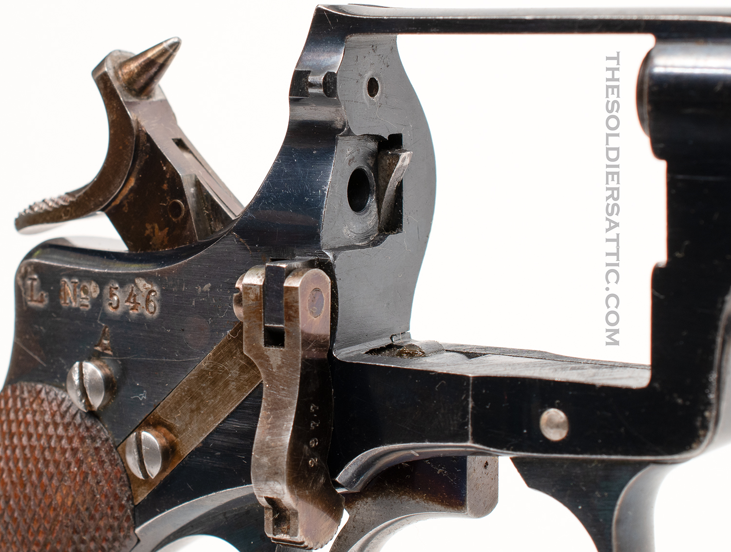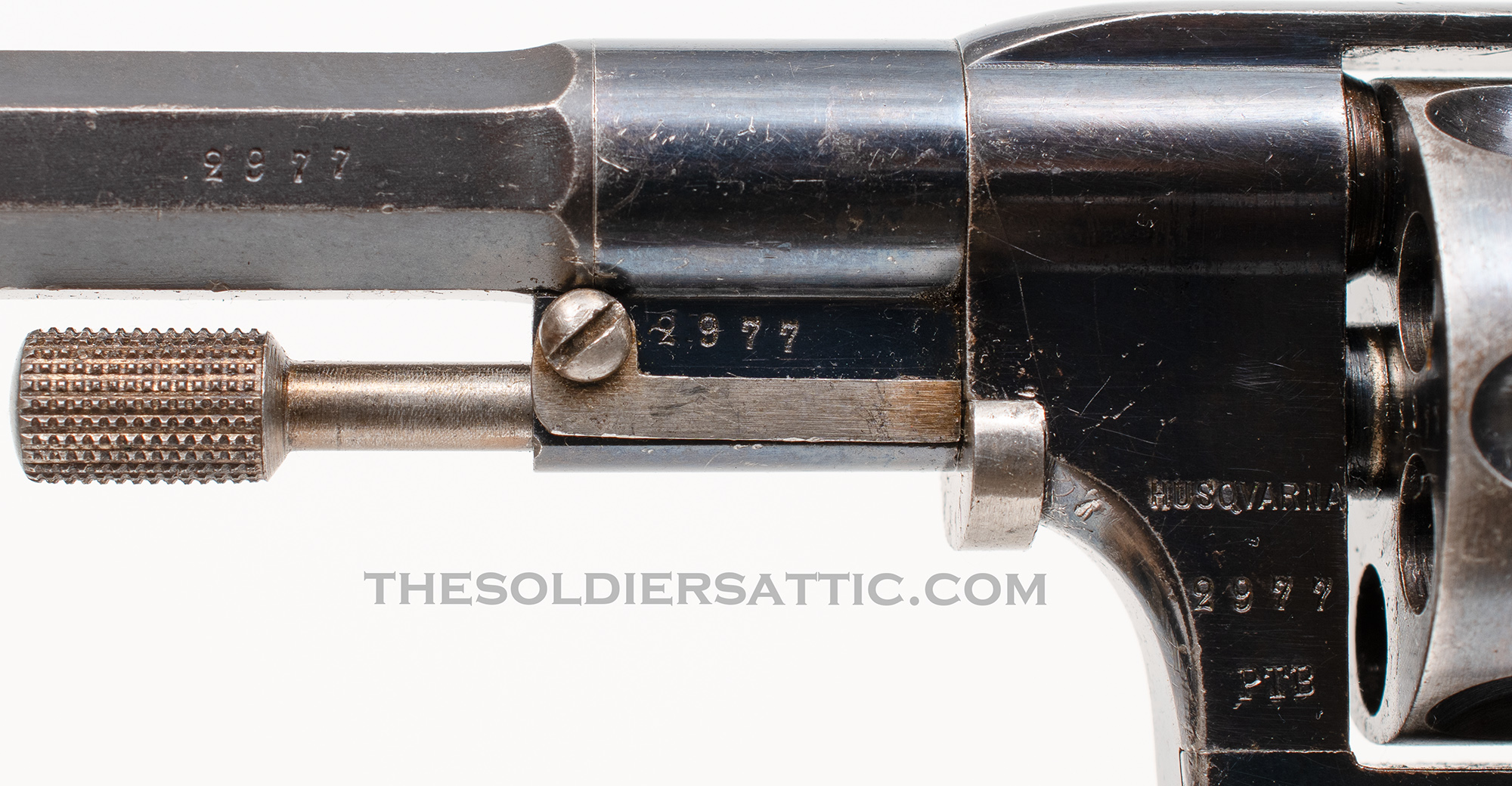 Markings include ‘HUSQVARNA’ over the SN over ‘PTB’ on the left side of the frame, forward of the cylinder. The SN is stamped on the front cylinder face, left side of the barrel, barrel lug, loading lever, and cylinder pin lock. The right side of the frame bears the Landstormen mark ‘L No 546/A’