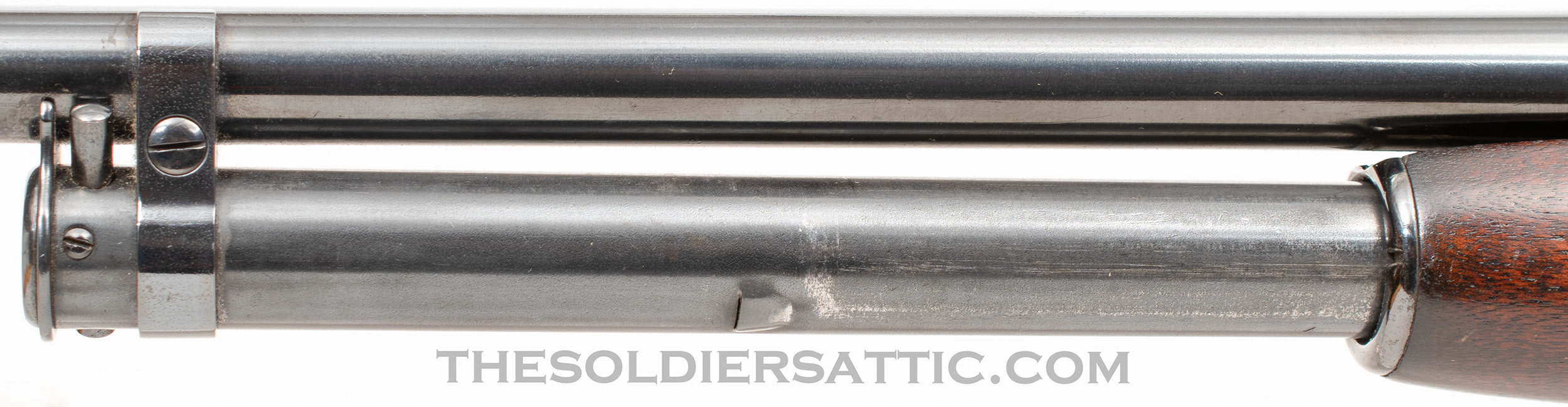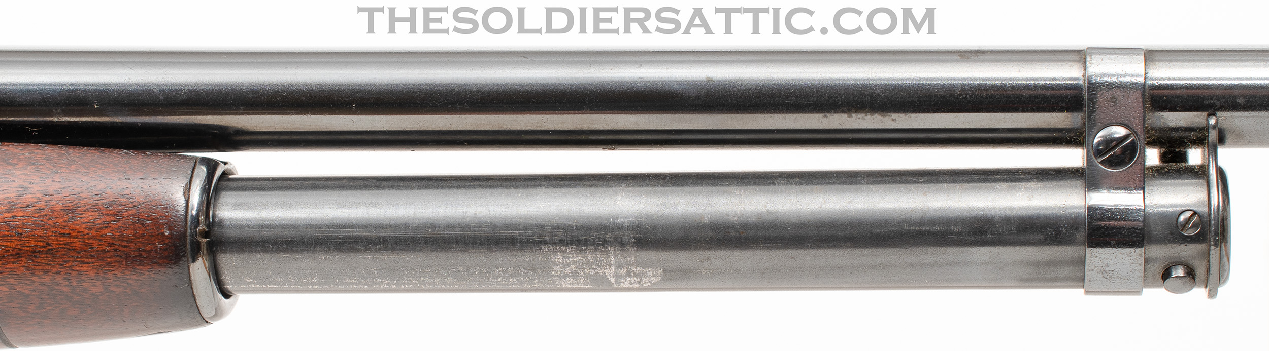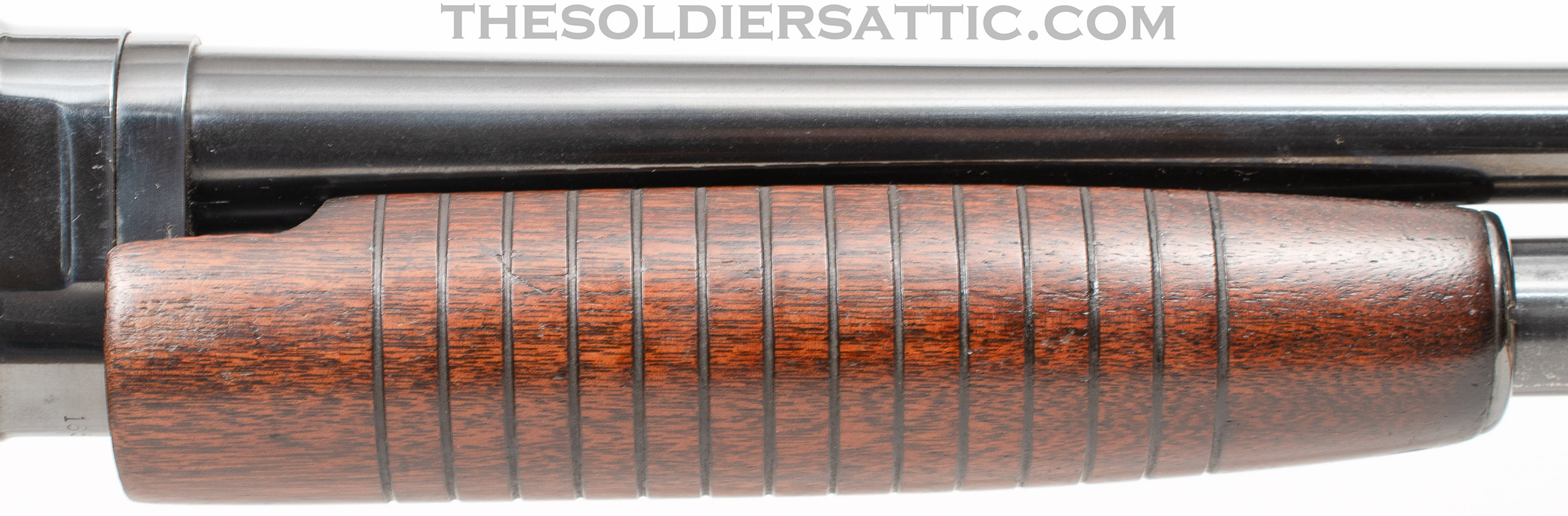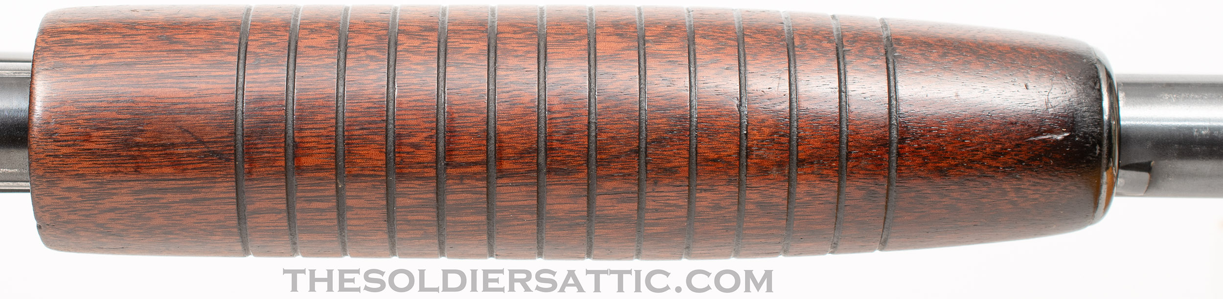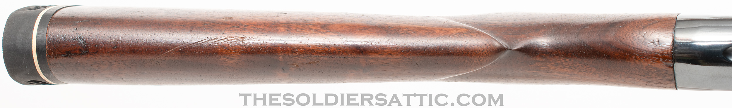 The blue finish is in excellent condition with some wear along the slide and left leading edge of the receiver. All amrkings are sharp. Both the wood forearm and buttstock carry handling dings and dents and there is some high point wear along the bottom of the pistol grip. A small chip in the wood exists at the rear of the trigger guard. Both wood components have no cracks. The action functions as intended. The bore is clean, bright, and smooth with no pitting or oxidation.