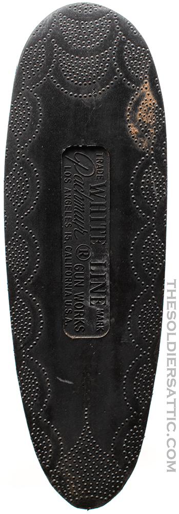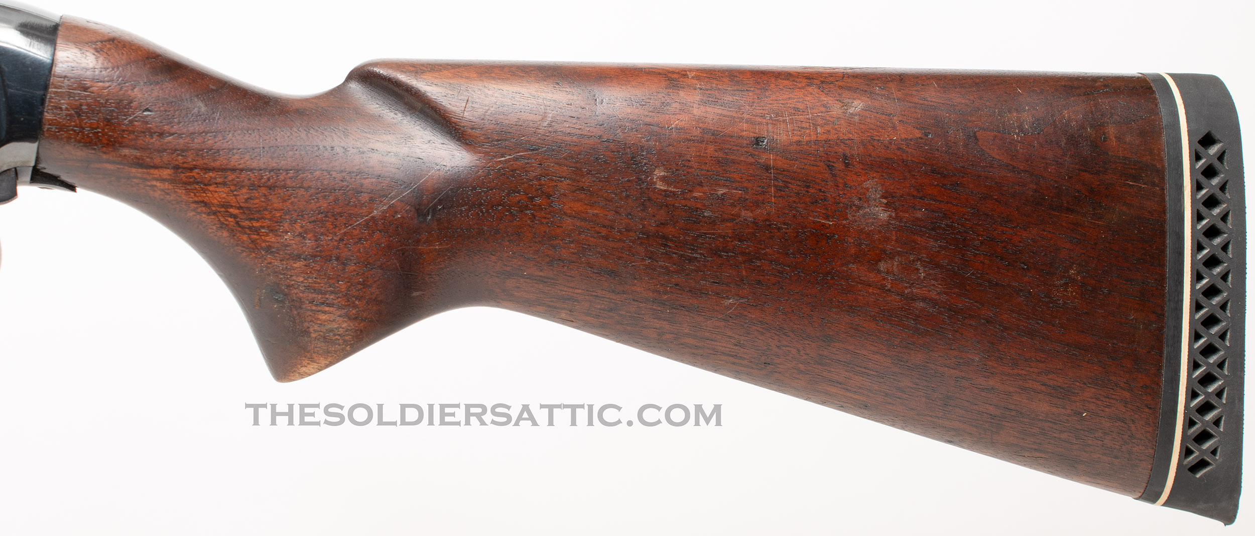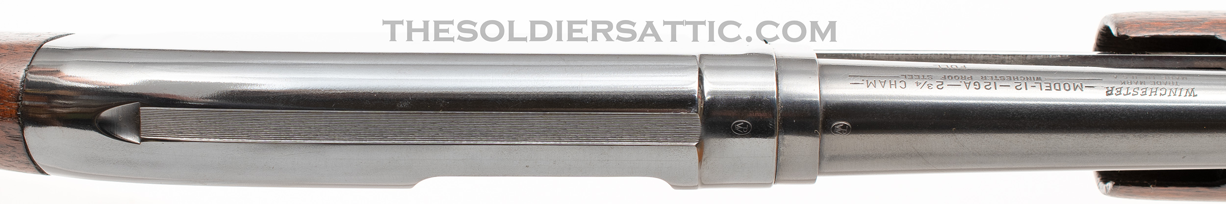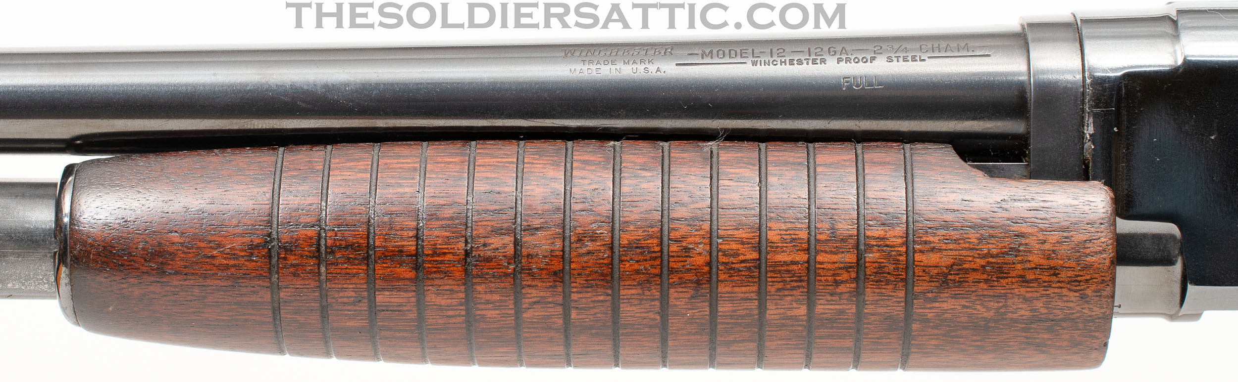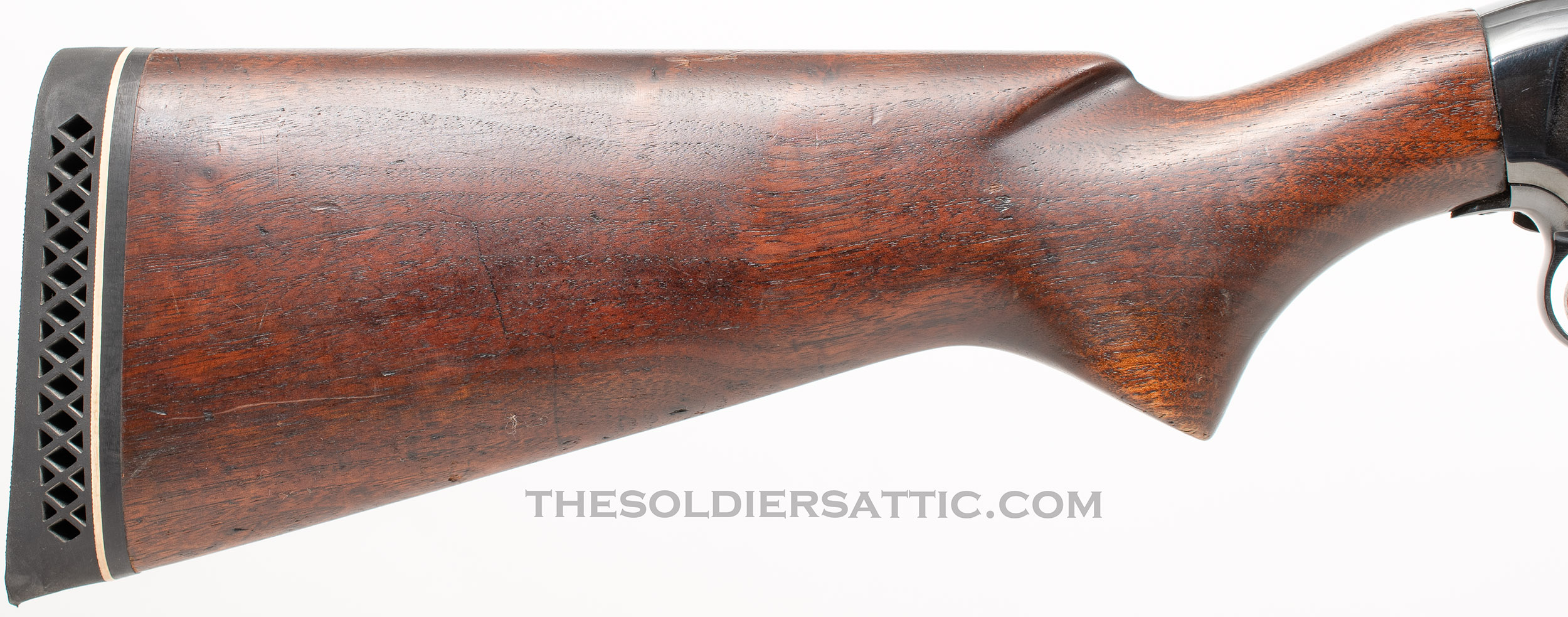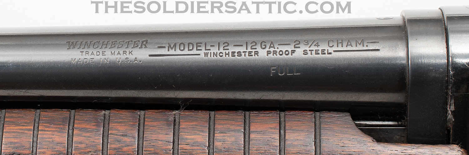 Manufactured in 1955, the Winchester Model 12 for sale here features a walnut forearm and buttstock with pistol grip, 12 gauge 30-inch plain barrel with full choke, 2 ¾ chamber, 6-round tubular magazine, and blue finish. ‘WINCHESTER/TRADE MARK/MADE IN U.S.A.’ is stamped on the barrel, in front of ‘-MODEL-12-12 GA.-2 ¾ CHAM.-/-WINCHESTER PROOF STEEL-/FULL’. On the bottom of the receiver and magazine tube is the serial number. Just behind the forearm, on the magazine tube and on the receiver are two opposing arrows. Behind the trigger guard are the inspector’s initials ‘GN’, although the N is lightly struck and looks like an inverted V. The ‘P/W’ within an oval proof mark is located on top on the receiver and barrel. The replacement butt pad reads ‘TRADE WHITE LINE MARK’ over ‘PACHMAYR’ ‘R’ within a circle ‘GUN WORKS’ over ‘LOS ANGELES 15 CALIFONIA U.S.A.’.