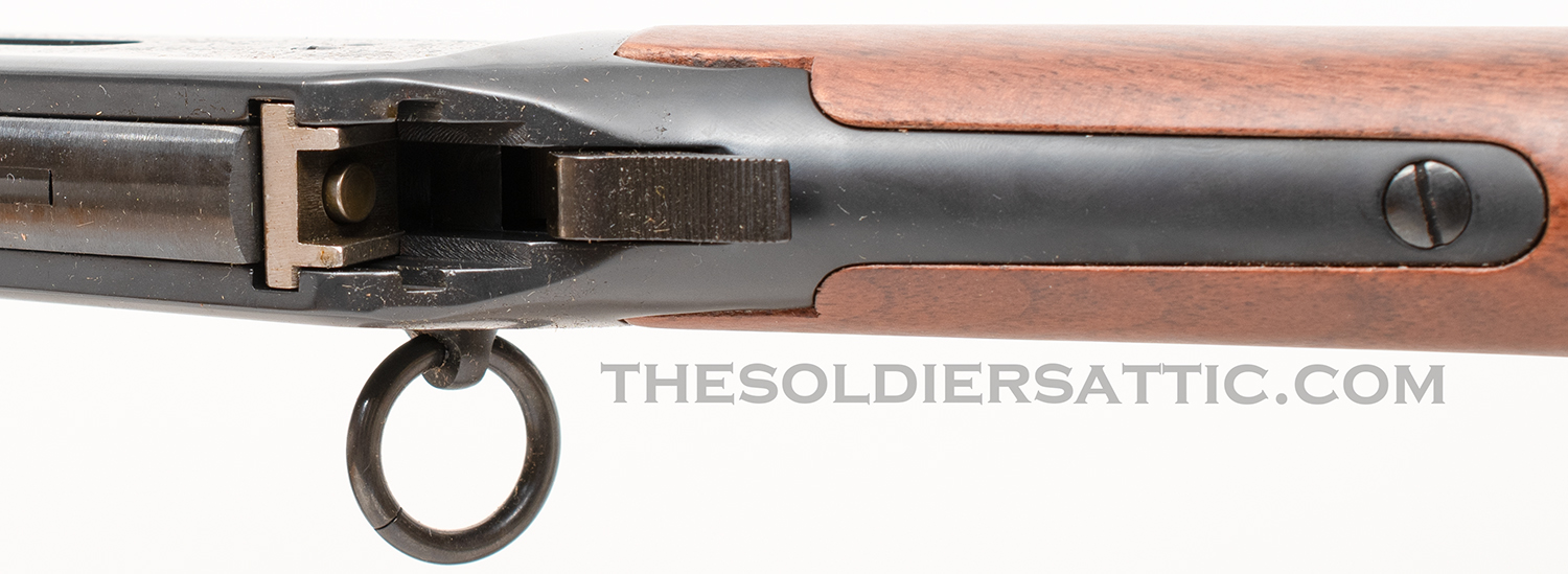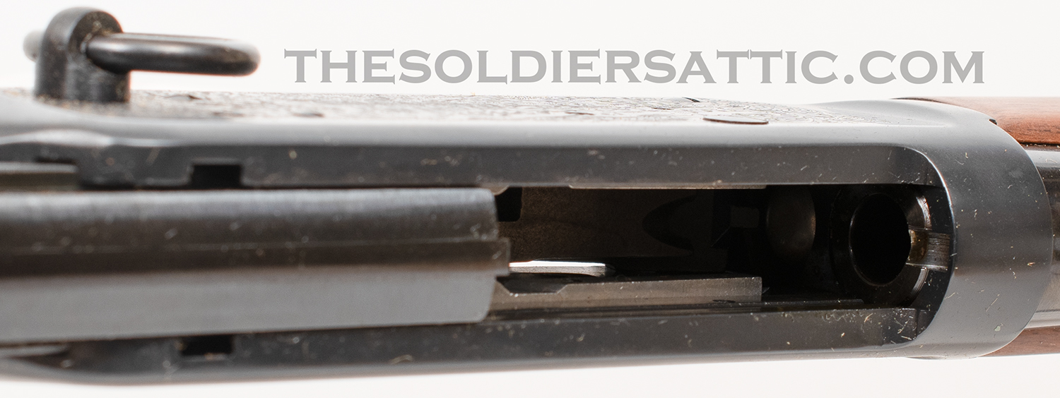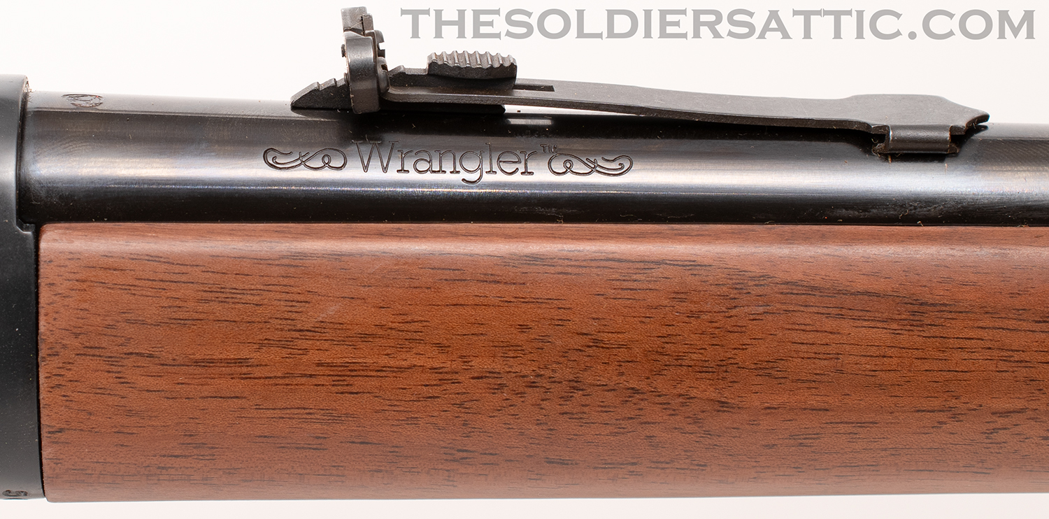 The left side of the barrel is marked ‘Winchester – Model 94 32 WIN. SPL.’ over ‘Made in New Haven, Conn. U.S.A. Winchester Proof Steel’. The top of the barrel, just forward of the receiver is proofed marked ‘PW’ within a circle. The right side of the barrel is marked ‘WRANGLER’ between scroll marks. On the bottom of the receiver, just behind the forearm, is the serial number. A western scene is roll-engraved on both sides of the receiver, and the Winchester logo is found on the butt plate. The oversized loop lever is designed to accommodate cold weather field conditions. 16-inch round barrel with full-length, five-round, tubular magazine. The bore is in new condition.