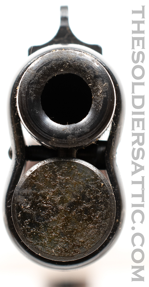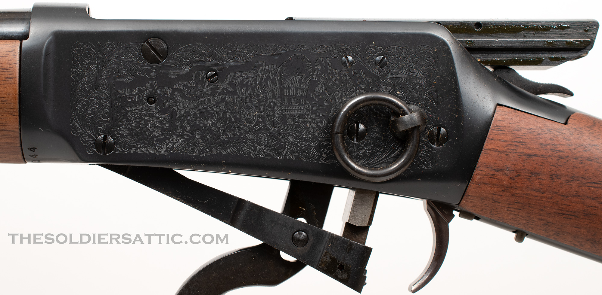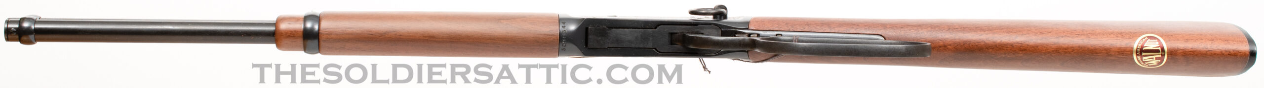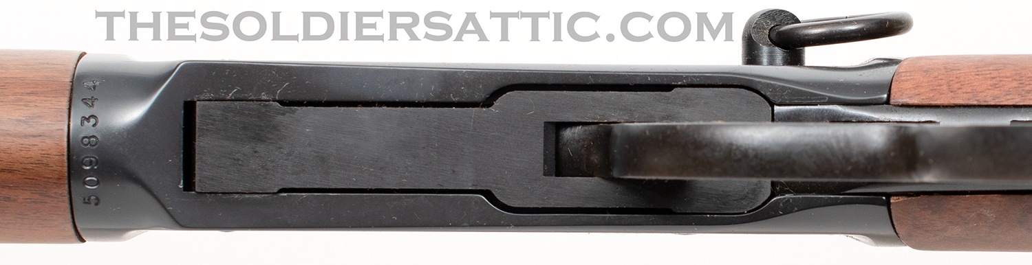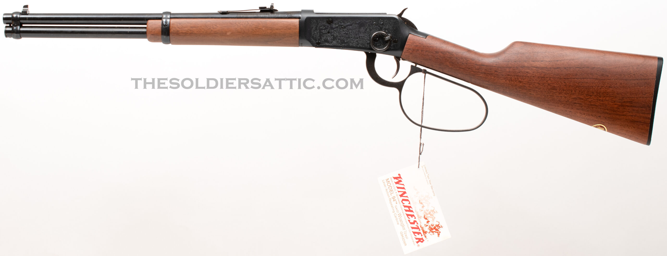 The left side of the barrel is marked ‘Winchester – Model 94 32 WIN. SPL.’ over ‘Made in New Haven, Conn. U.S.A. Winchester Proof Steel’. The top of the barrel, just forward of the receiver is proofed marked ‘PW’ within a circle. The right side of the barrel is marked ‘WRANGLER’ between scroll marks. On the bottom of the receiver, just behind the forearm, is the serial number. A western scene is roll-engraved on both sides of the receiver, and the Winchester logo is found on the butt plate. The oversized loop lever is designed to accommodate cold weather field conditions. 16-inch round barrel with full-length, five-round, tubular magazine. The bore is in new condition.