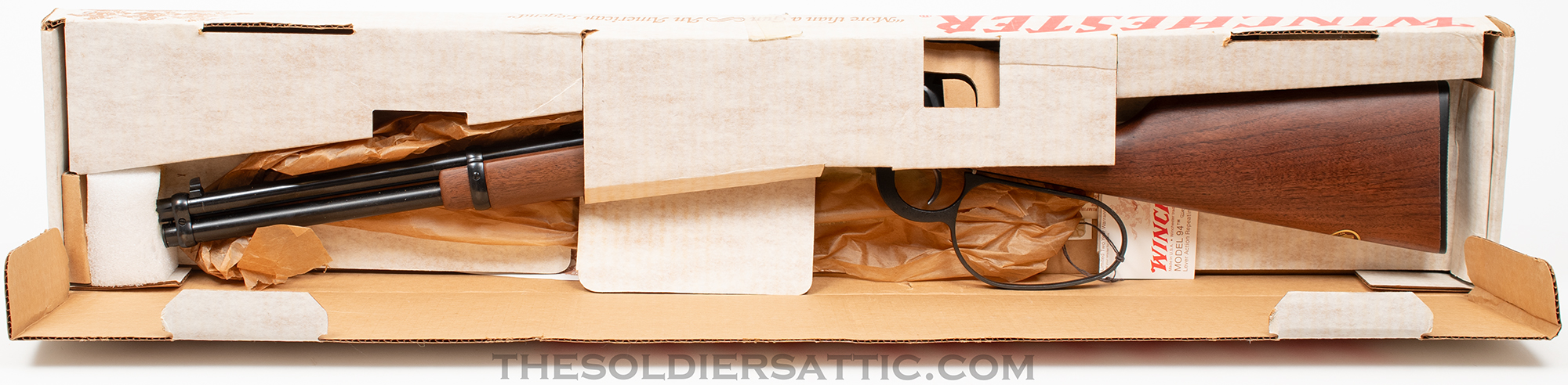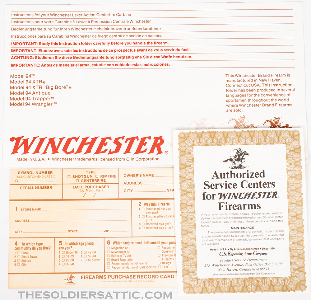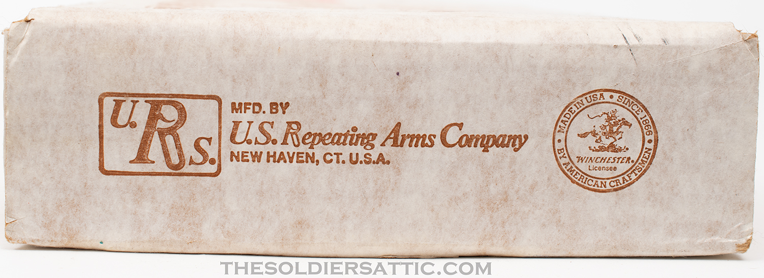 Winchester Model 94 Wrangler SRC manufactured in 1982 with large loop lever and chambered in .32 Winchester Special. Only manufactured from 1983-84, these carbines are difficult to find in this condition. This is a beautiful, like new, in the box, never fired Winchester that was purchased by the previous owner and then put in storage and still has some of the original factory coating. The blued finish is perfect, as is the walnut stock and forearm. Because of its original condition we have elected not to clean the firearm and the dust you see in the pictures is from the box and packaging. The original hangtag remains attached to the lever and the original ‘GENUINE AMERICAN WALNUT’ sticker adorns the butt stock toe.