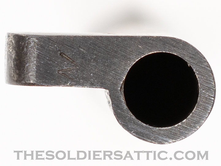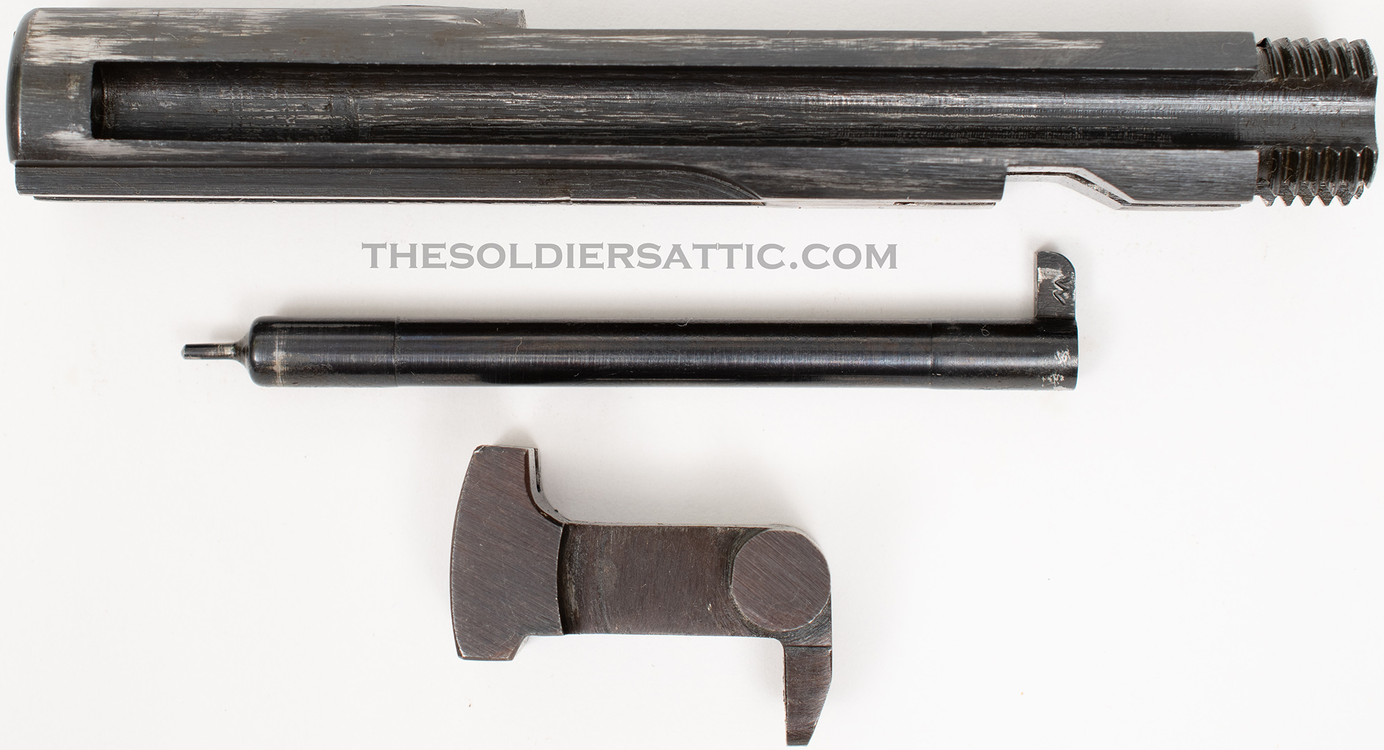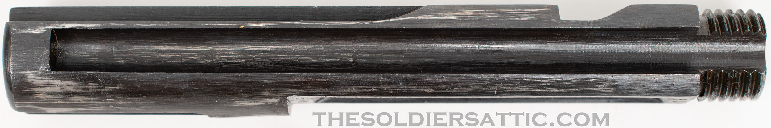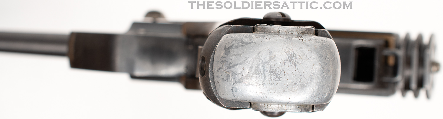Overall, the blued finish is in very good condition on the Type 14 pistol. Service wear is present as minor finish wear and marks. They are most notable around the muzzle, triggerguard, grip panels, and magazine baseplate. Light straw color is visible on the trigger and magazine latch, while hints of straw color are visible in protected areas on the safety lever and magazine retainer spring. The left side of the barrel extension bears the typical circle mark left by the safety lever; this mark extends into the upper left corner of the grip. Bore is bright, clean, and has well-defined rifling. The action is strong and crisp when cocking the pistol and the trigger pull is good. This is a very nice 1st series Kokubunji Factory produced Type 14 pistol.