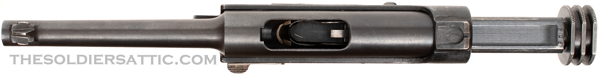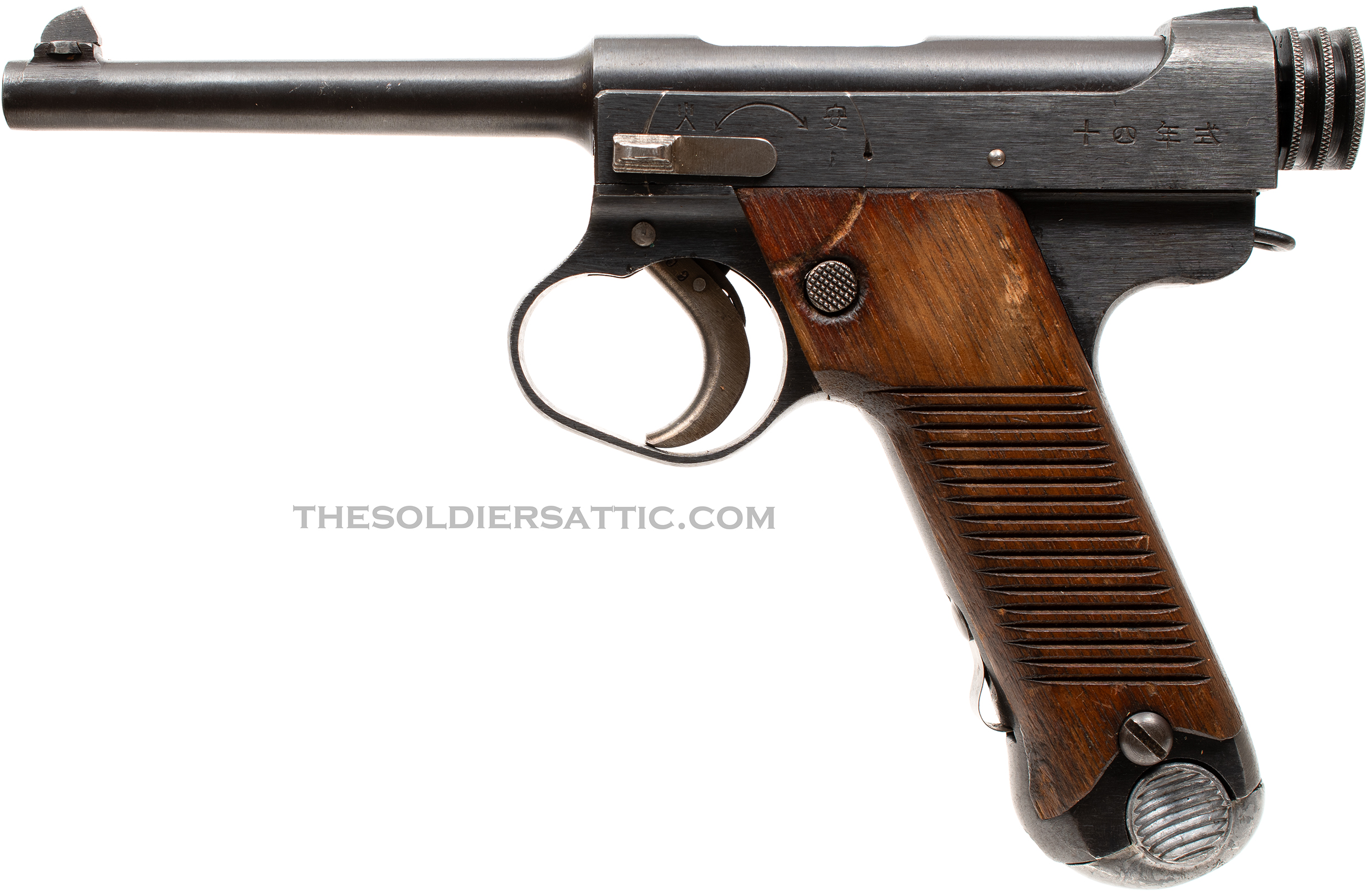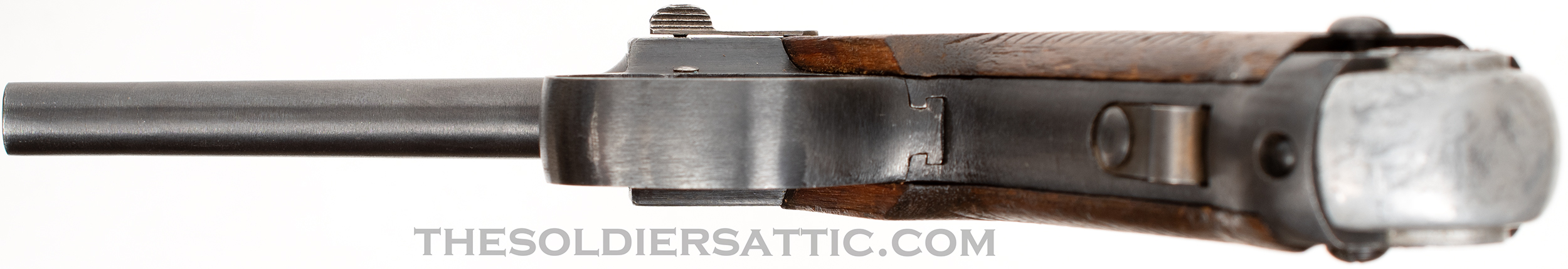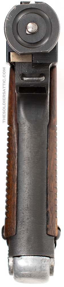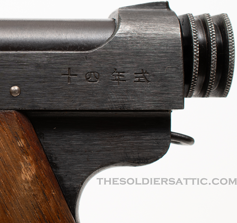 A Type 14 pistol, chambered in 8mm Nambu, manufactured in January of 1943 (Showa 18.1) by Chou Kogyo K.K. (Chou Kogyo Co., Ltd.) at the Kokubunji Factory under Nagoya Army Arsenal supervision. Chou Kogyo K.K. was the result of merging The Nambu Rifle Manufacturing Company with two other private corporations in 1936. Together with Nambu Rifle’s previous production, around 112,000 of these arms were manufactured between 1933 and 1944, when the factory at Kokubunji closed, including both original and 1st series pistols. High production numbers make Kokubunji produced pistols fairly common but are still difficult to find in both good condition and matching serial numbers and magazines, like this 1st series example.