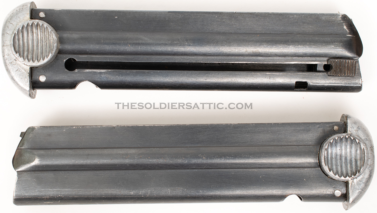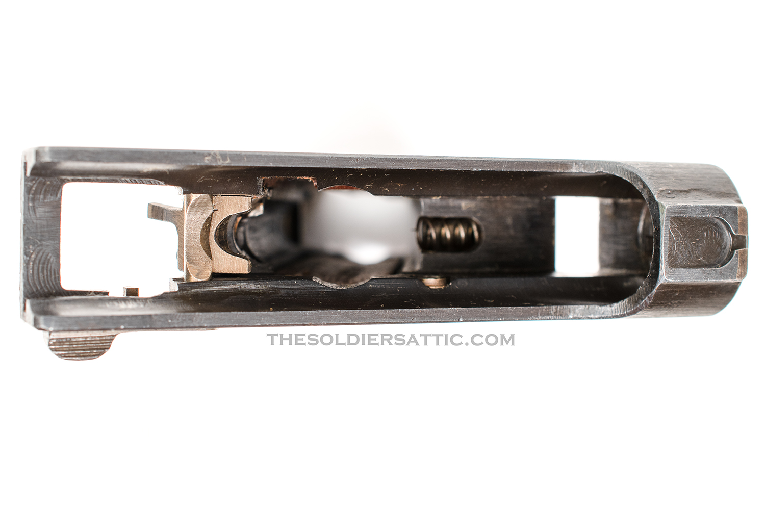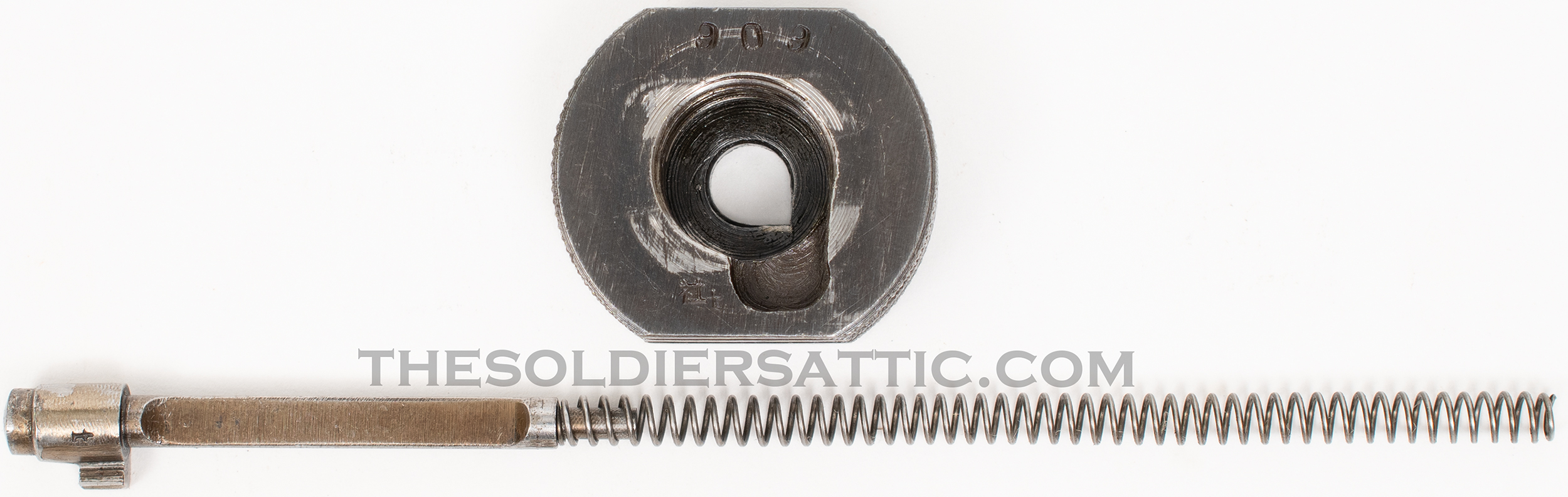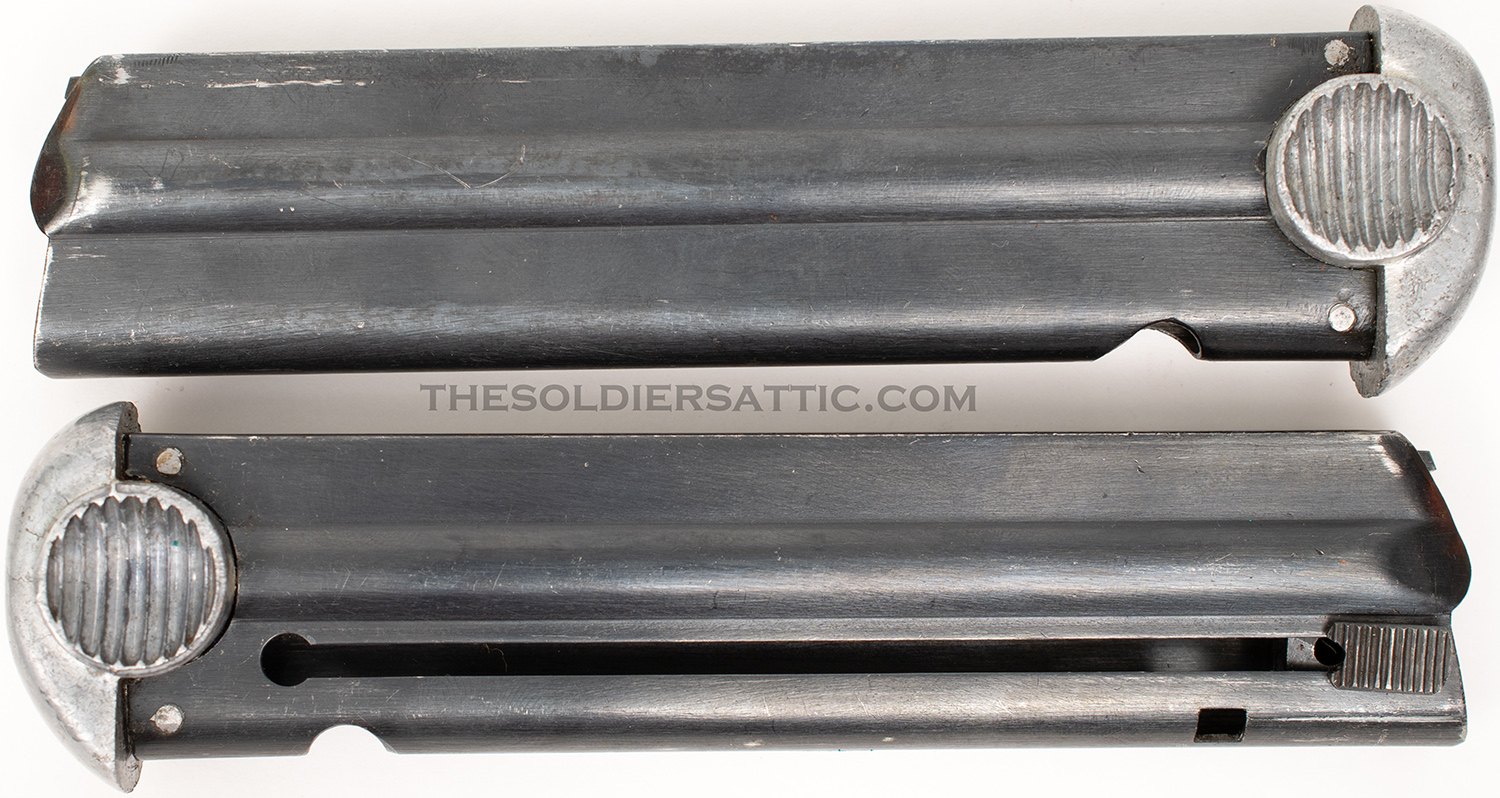 Features of this Type 14 pistol include the large, winter triggerguard; a blued finish; Philippine Mahogany wood grip panels; and fine-knurled cocking knob. The 73mm long striker is correct in its blued finish and lack of SN marks; the correct flat-sided striker guide is 47mm in length. Both parts carry proper Kokubunji factory inspection marks. The wood grip panels are correct with both their 17 grooves and lack of SN. The right grip panel has an inspection mark stamped on the inside. Both magazines are the correct Type VII variant with latch cut outs and 9-groove alloy bases.