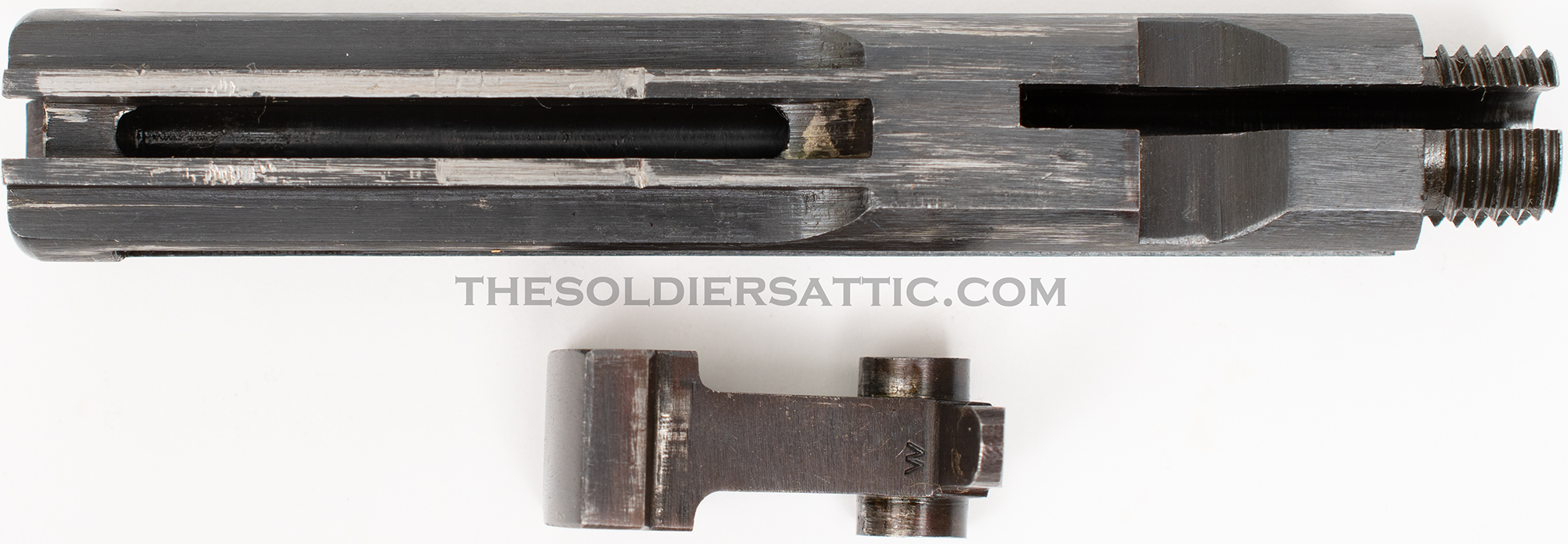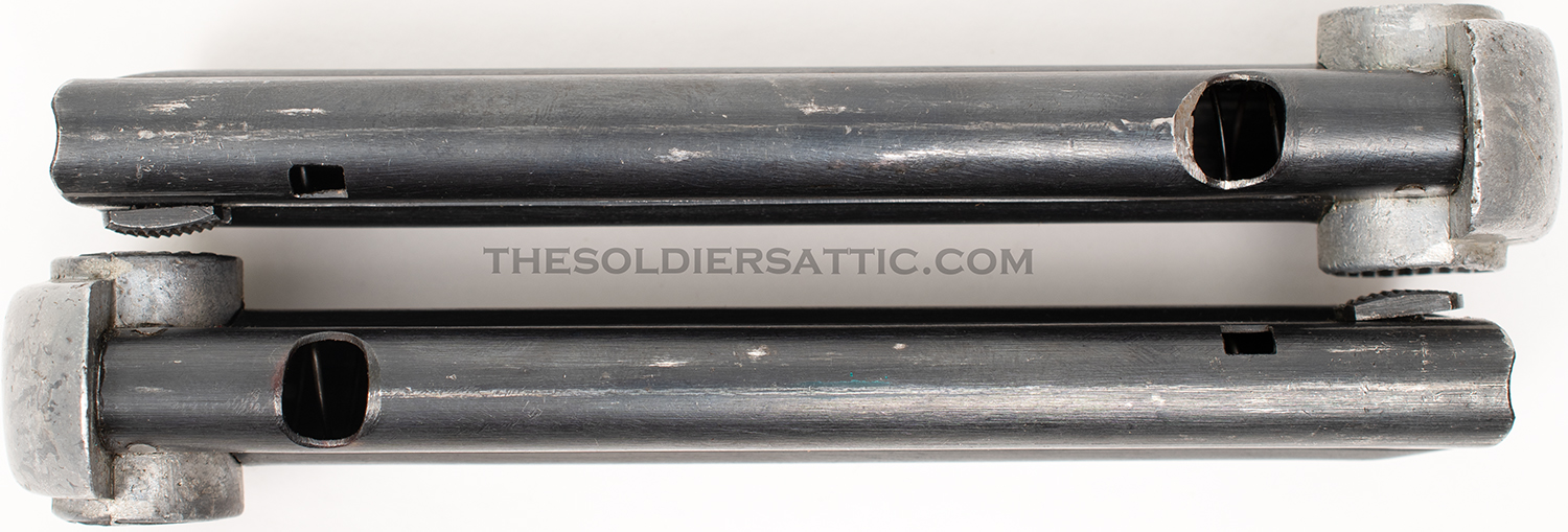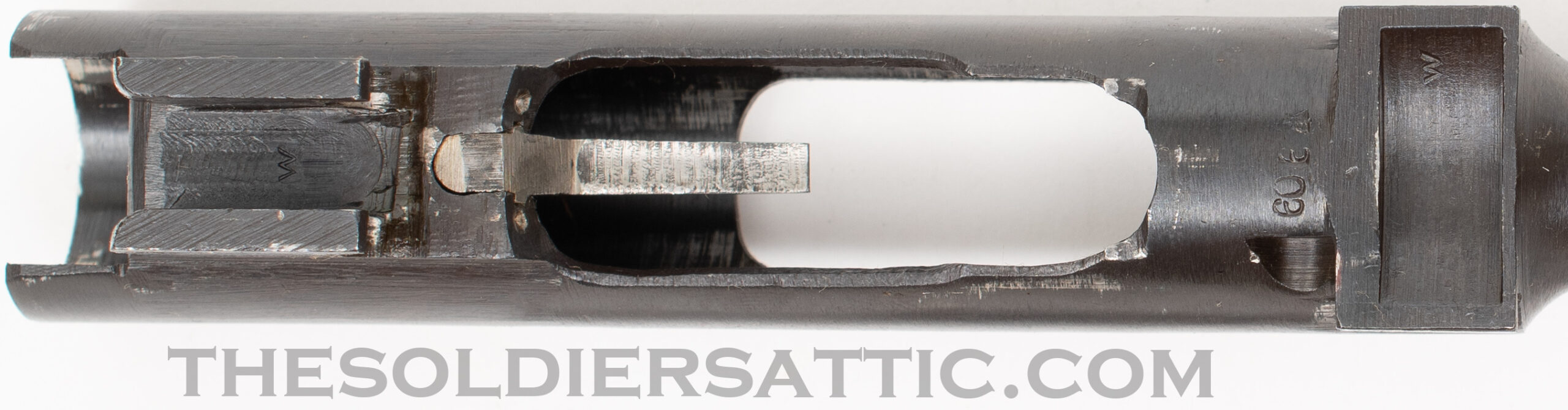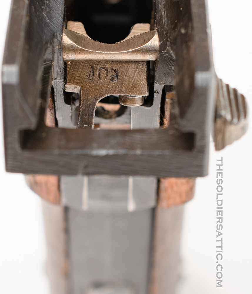 Features of this Type 14 pistol include the large, winter triggerguard; a blued finish; Philippine Mahogany wood grip panels; and fine-knurled cocking knob. The 73mm long striker is correct in its blued finish and lack of SN marks; the correct flat-sided striker guide is 47mm in length. Both parts carry proper Kokubunji factory inspection marks. The wood grip panels are correct with both their 17 grooves and lack of SN. The right grip panel has an inspection mark stamped on the inside. Both magazines are the correct Type VII variant with latch cut outs and 9-groove alloy bases.