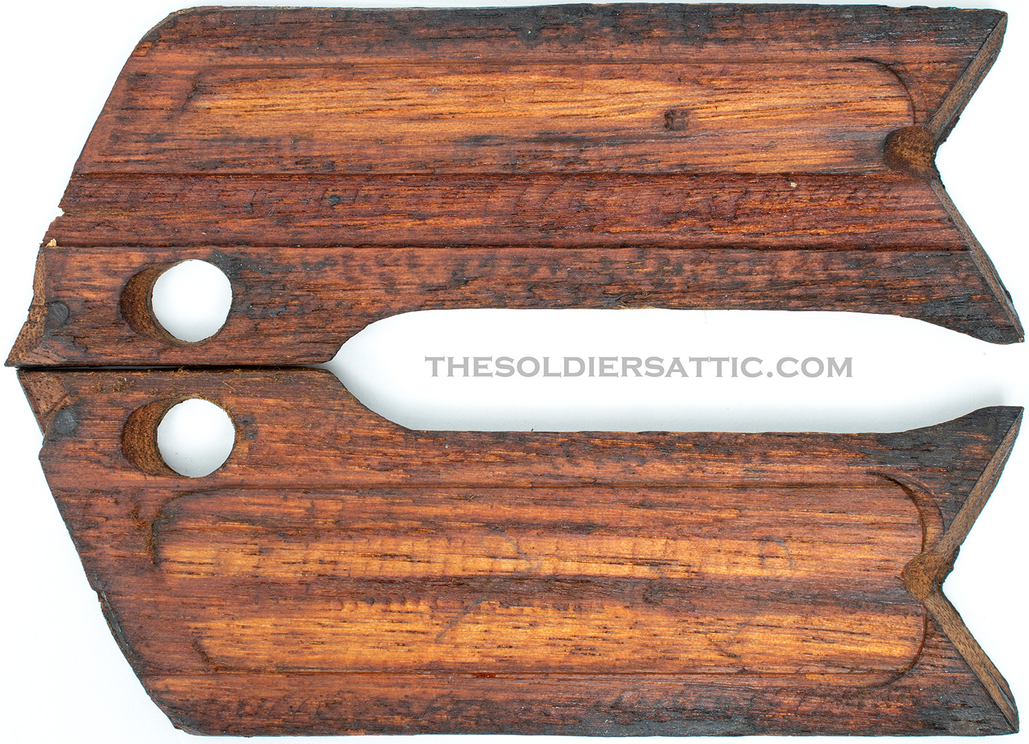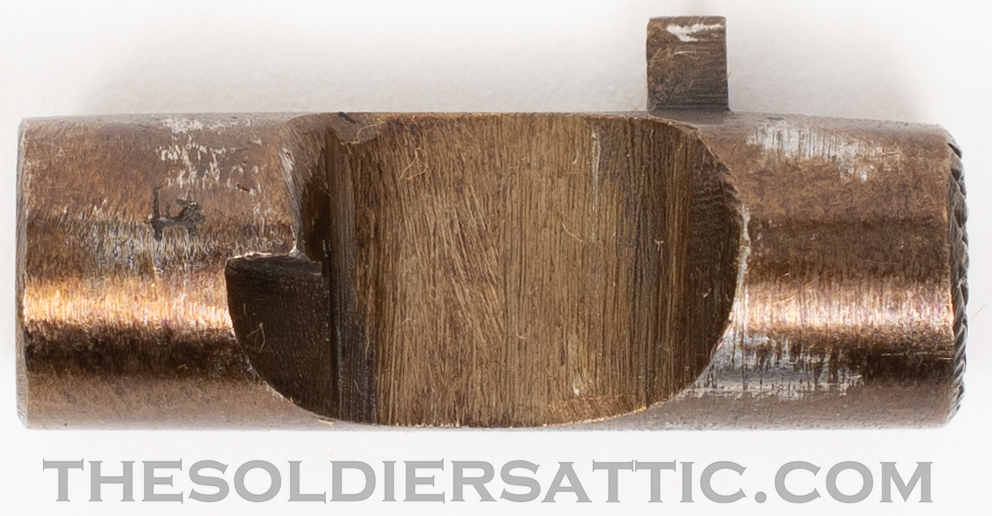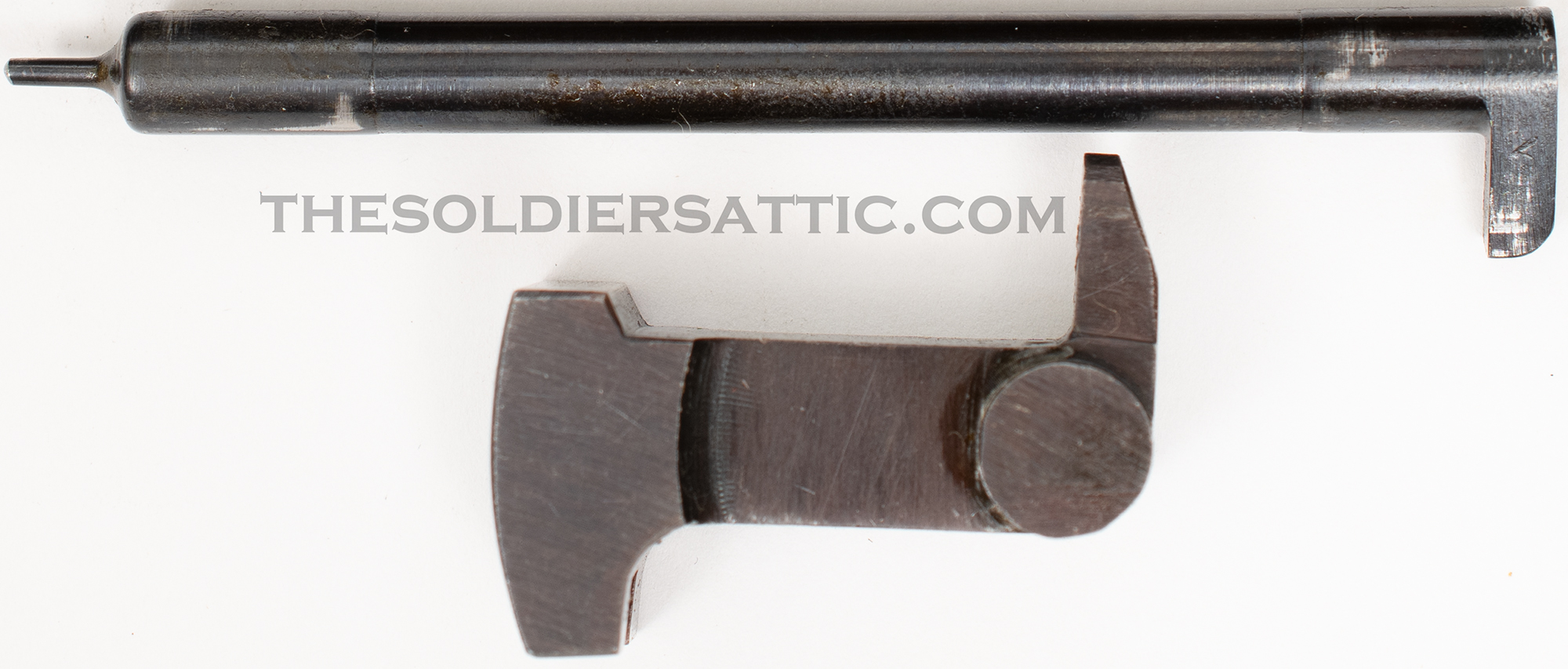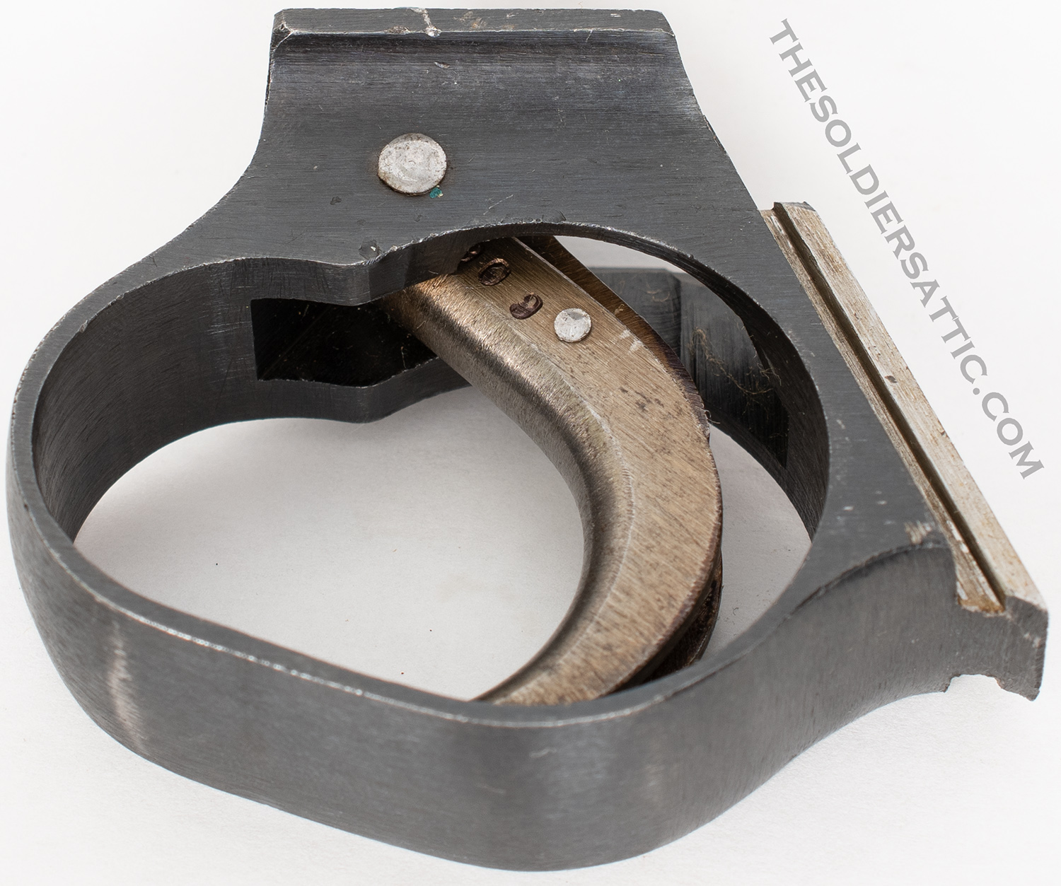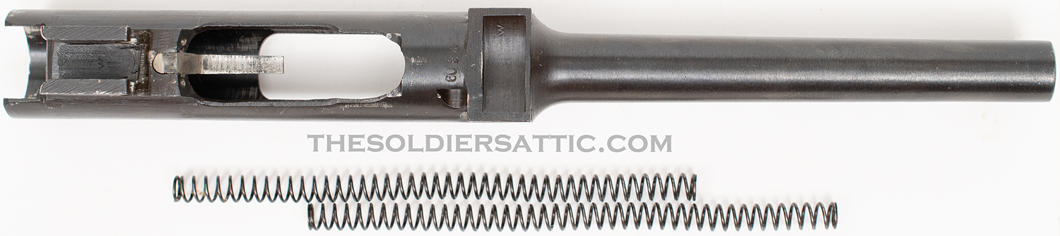 Features of this Type 14 pistol include the large, winter triggerguard; a blued finish; Philippine Mahogany wood grip panels; and fine-knurled cocking knob. The 73mm long striker is correct in its blued finish and lack of SN marks; the correct flat-sided striker guide is 47mm in length. Both parts carry proper Kokubunji factory inspection marks. The wood grip panels are correct with both their 17 grooves and lack of SN. The right grip panel has an inspection mark stamped on the inside. Both magazines are the correct Type VII variant with latch cut outs and 9-groove alloy bases.