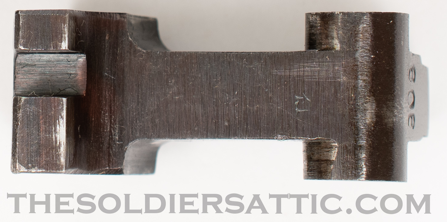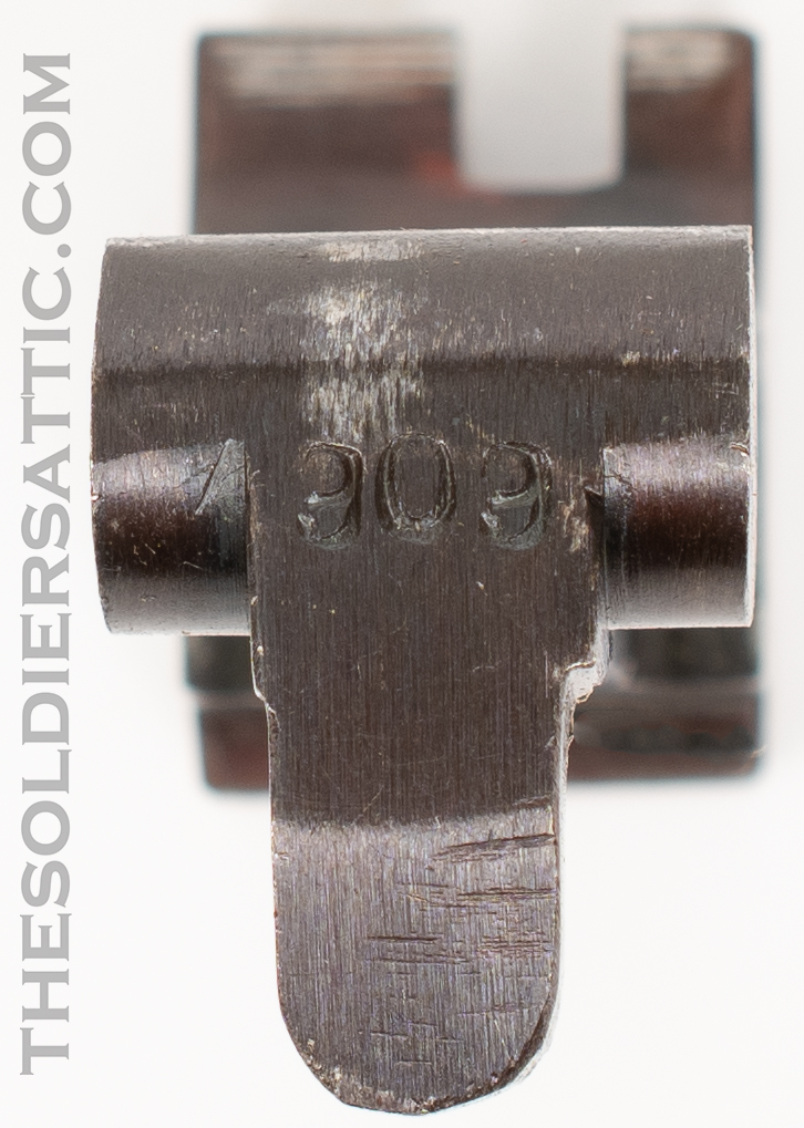 Markings on this Type 14 pistol include the Nagoya Army Arsenal and Nambu Rifle Manufacturing Co./Chuo Kogyo Co. symbols followed by the Iroha “i” 1st series symbol and then the SN on the right side of the barrel extension. Below, on the right-side frame flat, SHO kanji character preceding the date of manufacture, followed by period correct TO inspection marking in “A” position. On the left side of the barrel extension, is the Type (model) designation in Kanji characters. Forward of the trigger, also on the left side of the barrel extension, are the Kanji safety markings (left “Fire”, right “Safe”). Serial numbers and three-digit partial numbers match on frame, locking block, trigger guard, trigger, cocking knob, magazine latch, bolt, magazine safety, barrel/barrel extension, and both magazines. Small parts inspection marked as seen in photos. The Type VII magazines both carry the last three SN digits and TO inspection mark. The spare has the dot centered above the SN, the appropriate location at the time of production.